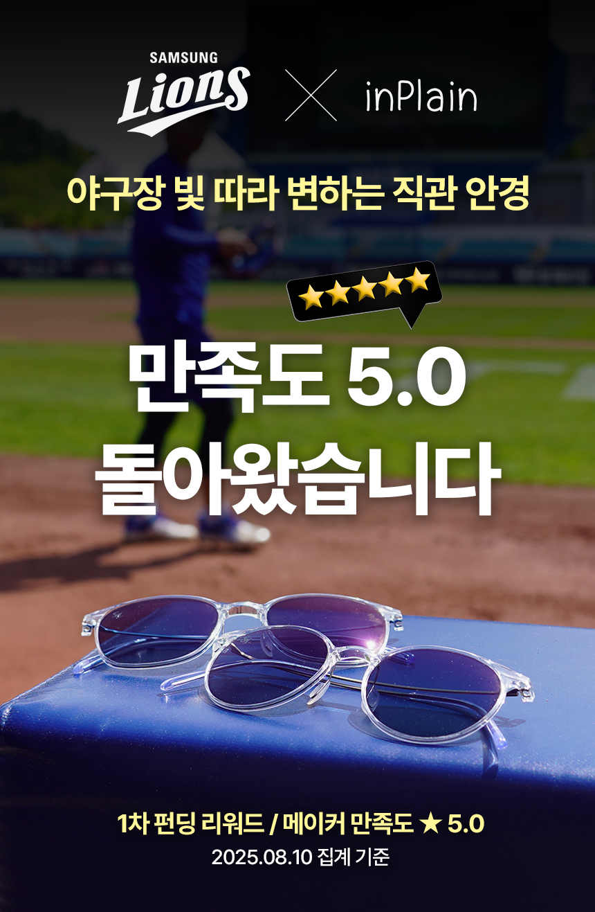 InPlain은 이번 펀딩을 통해 삼성라이온즈와의 콜라보 제품을 선보이며, '직관러를 위한 아이웨어'라는 새로운 라이프스타일을 제안합니다. 단순한 안경에서 낮에는 자외선을 차단하고 밤에는 블루라이트를 막아주는 기능성과 하나로 이어진 투명프레임이 강조되어 스타일을 동시에 갖췄습니다.