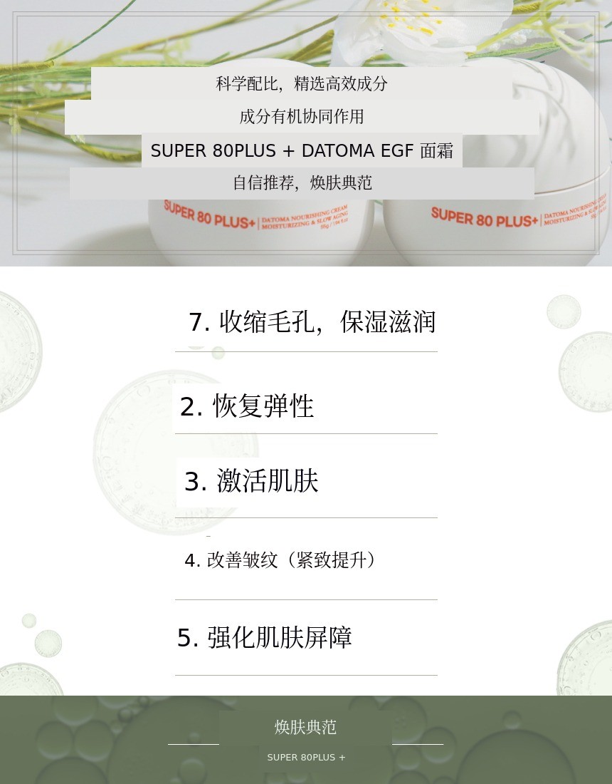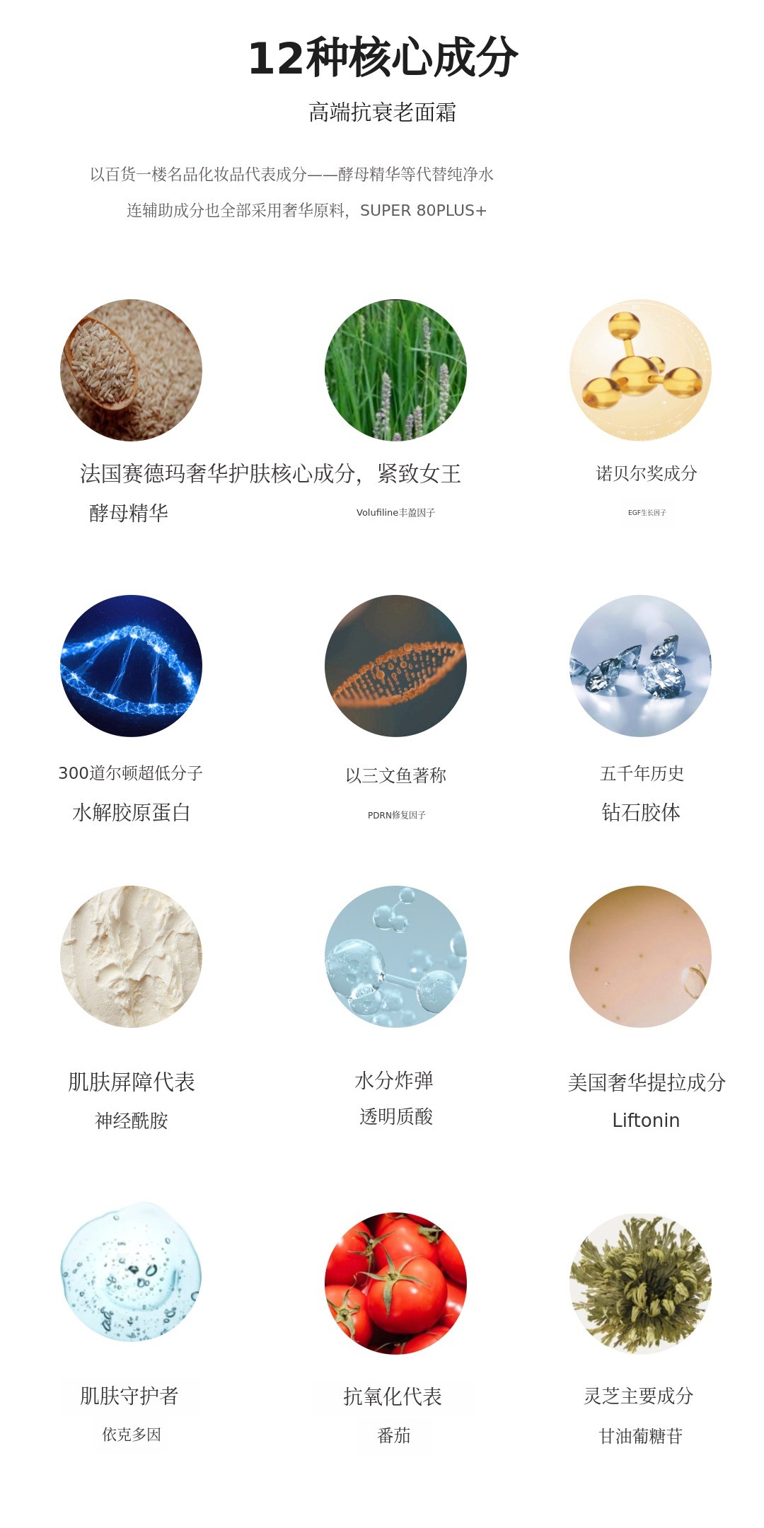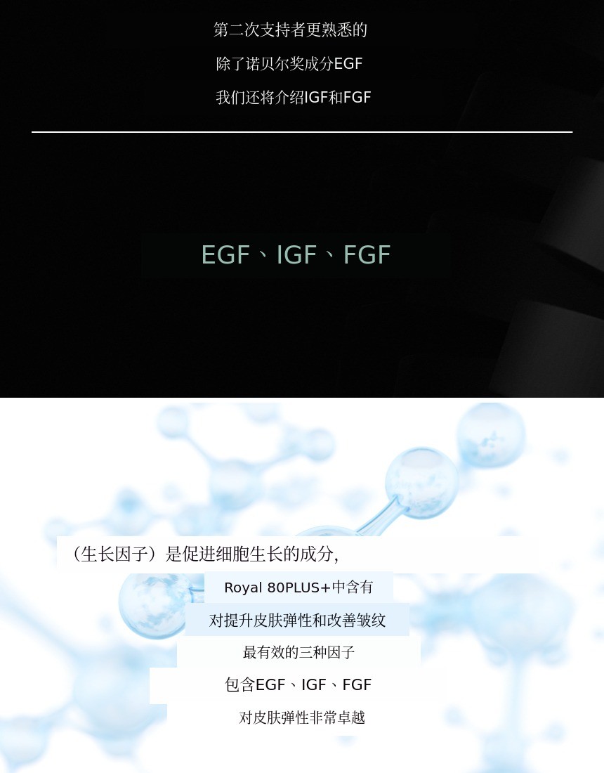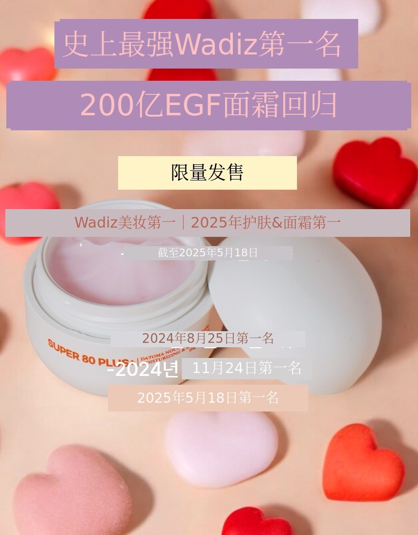 1. 🧴 无纯净水的高端EGF面霜 - 不含纯净水,含200亿活性EGF及奢华成分 2. 🌟 皮肤再生与保湿效果 - 提升皮肤弹性与水润,复购率超90% 3. 🎁 限量发售及特别活动 - 限量销售,多重活动叠加享额外福利