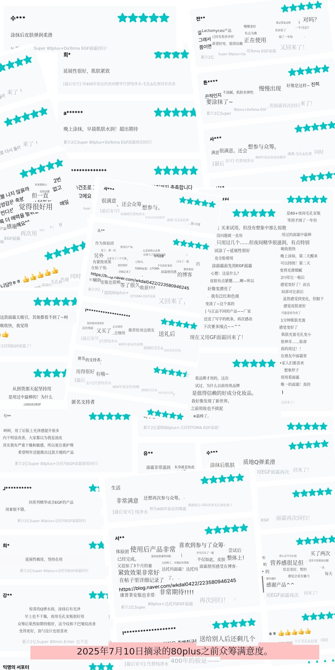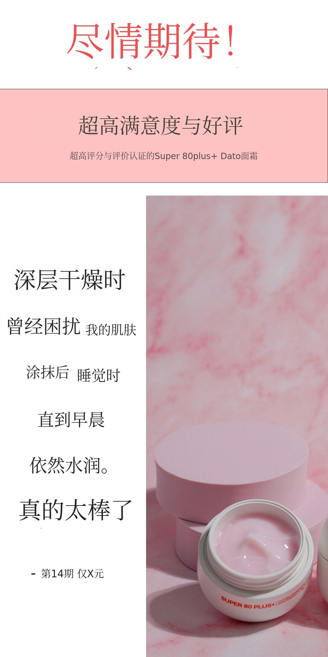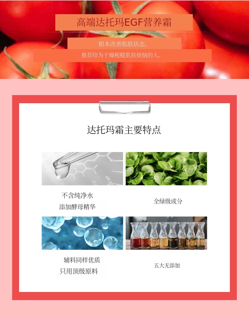 1. 🧴 无纯净水的高端EGF面霜 - 不含纯净水,含200亿活性EGF及奢华成分 2. 🌟 皮肤再生与保湿效果 - 提升皮肤弹性与水润,复购率超90% 3. 🎁 限量发售及特别活动 - 限量销售,多重活动叠加享额外福利