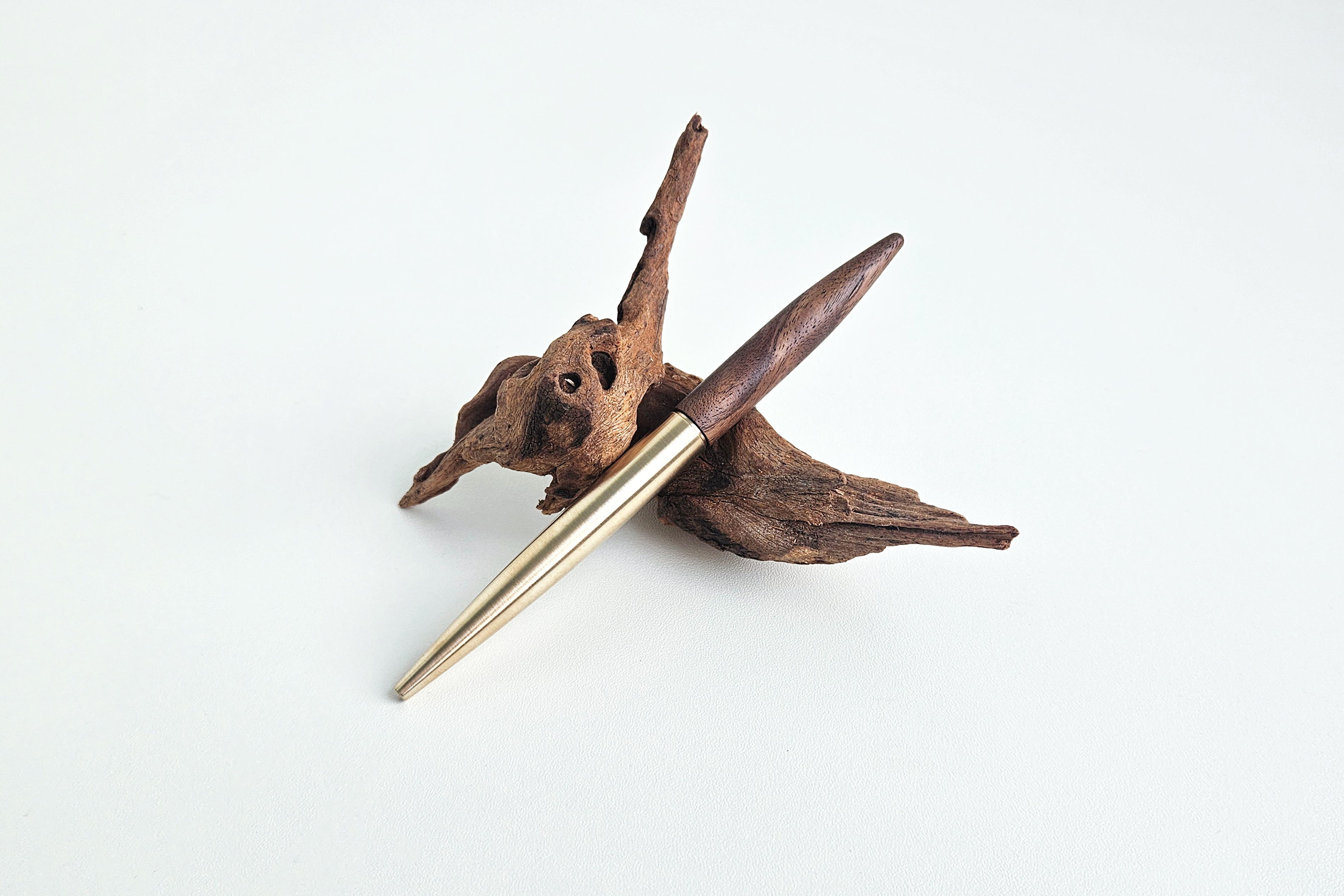 메모트레이와 동일한 소재로 제작된 볼펜, 황동의 묵직함과 원목의 따스함이 어우러져 손끝에서 균형을 잡아줍니다.