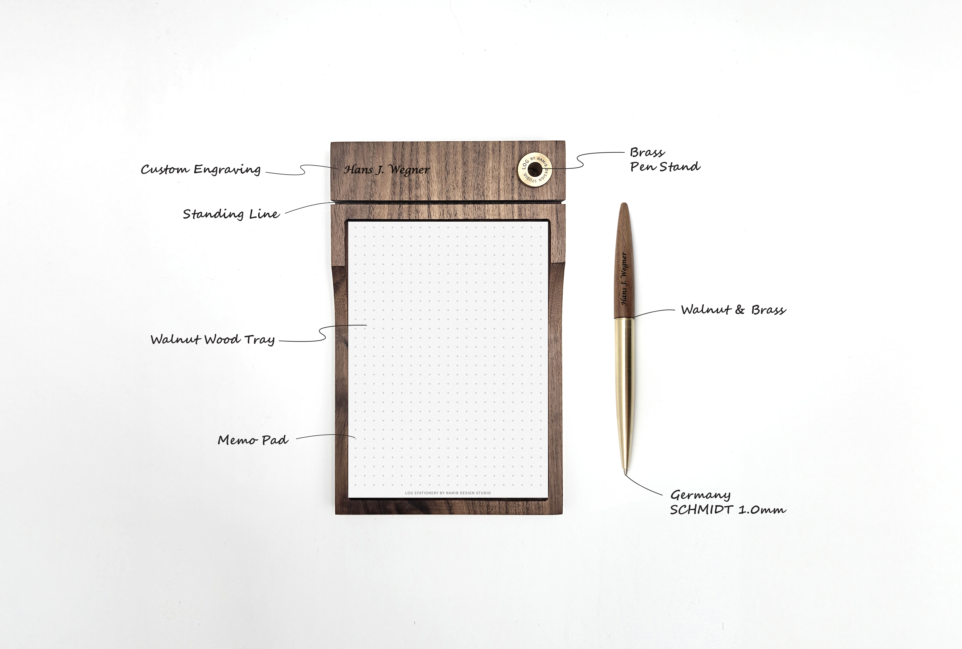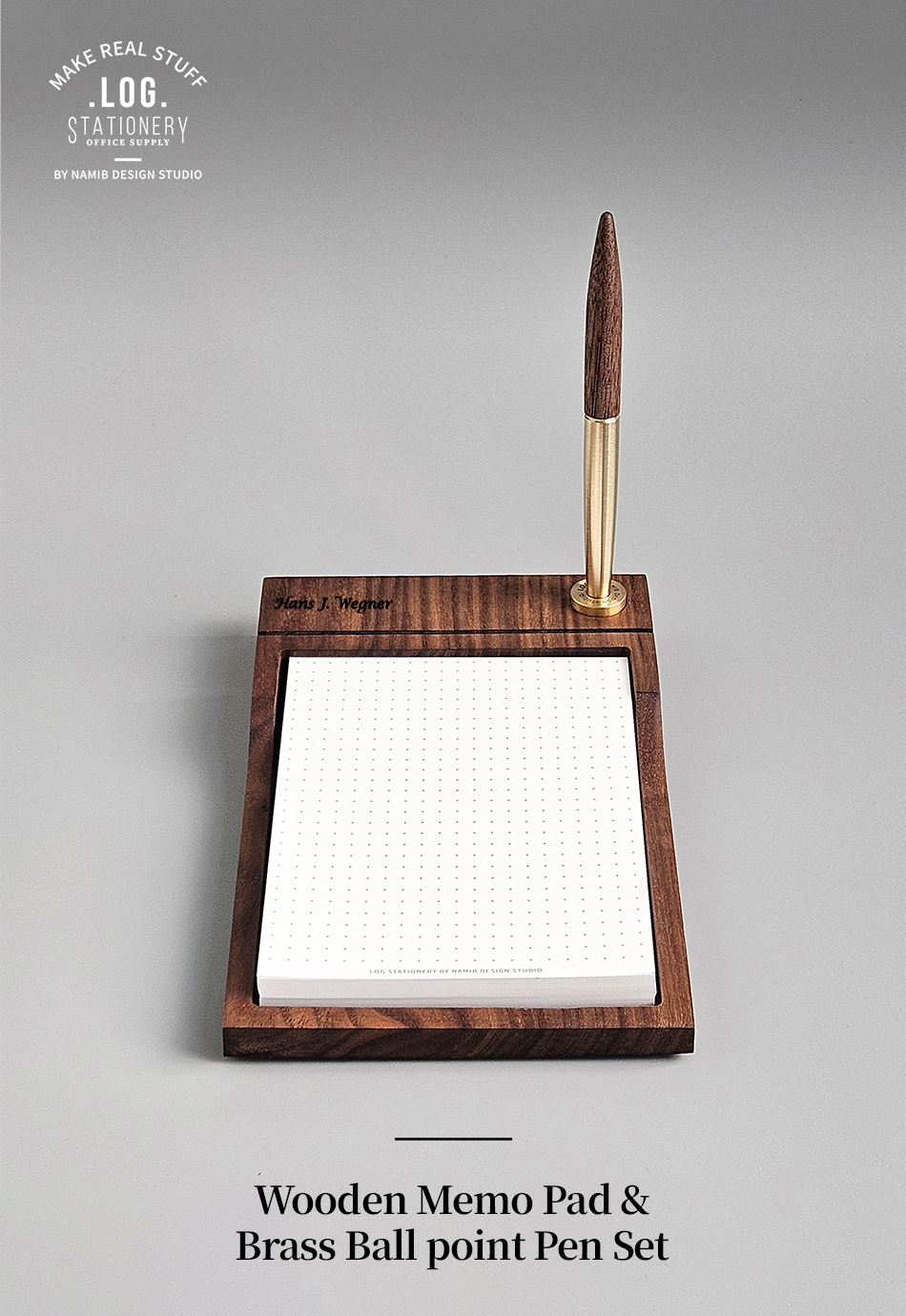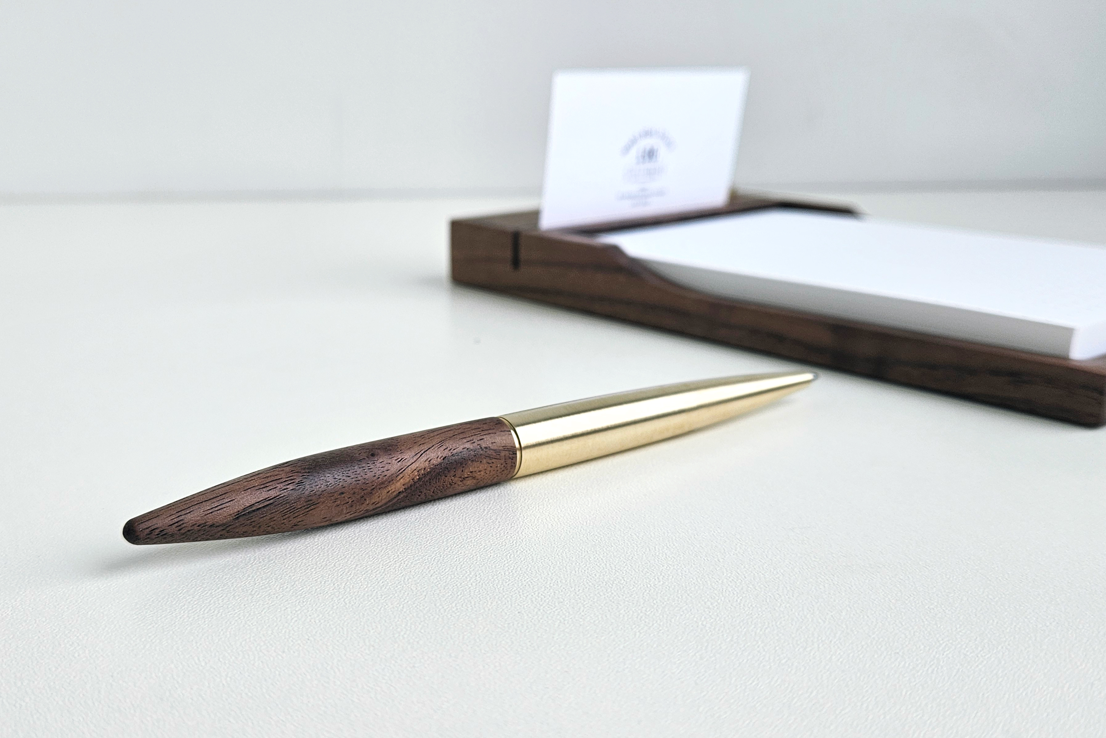 통 원목으로 깎아 제작한 트레이와, 묵직한 황동 펜과 함께하는 세트를 완성했어요.