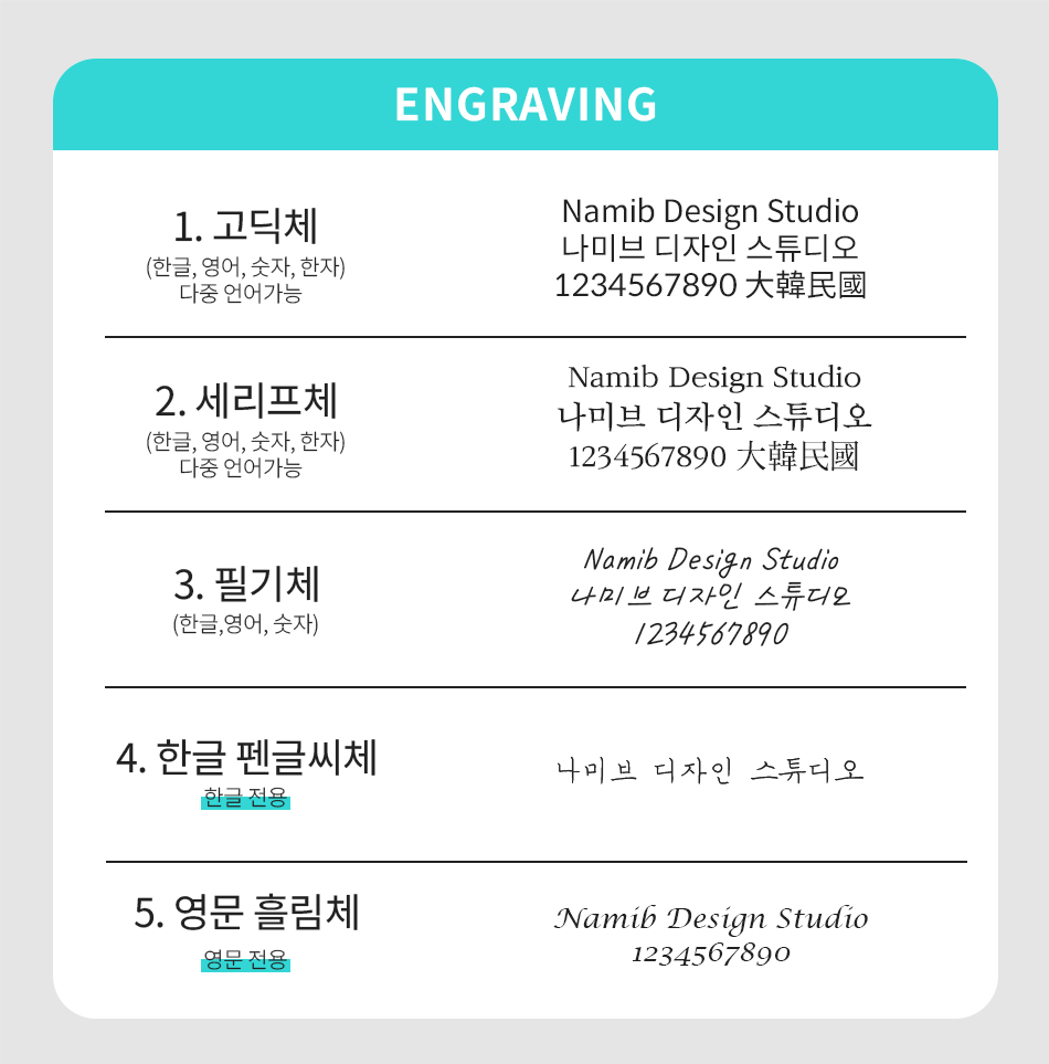- 각인 문구 미입력 시 각인 없이 발송되며, 서체 미지정·오류 시 임의 서체로 제작됩니다.