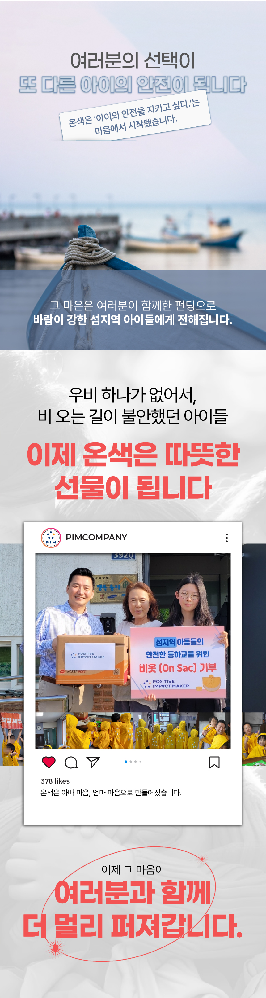 그리고 온색의 펀딩은 판매에서 끝나지 않습니다. 펀딩금 일부를 바람이 강한 섬지역 아이들에게 온색우비로 기부합니다. 작은 선택이 아이들의 귀가길을 지켜주는 힘이 되길 바랍니다.
