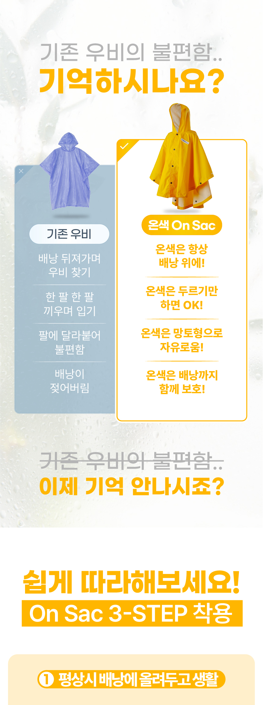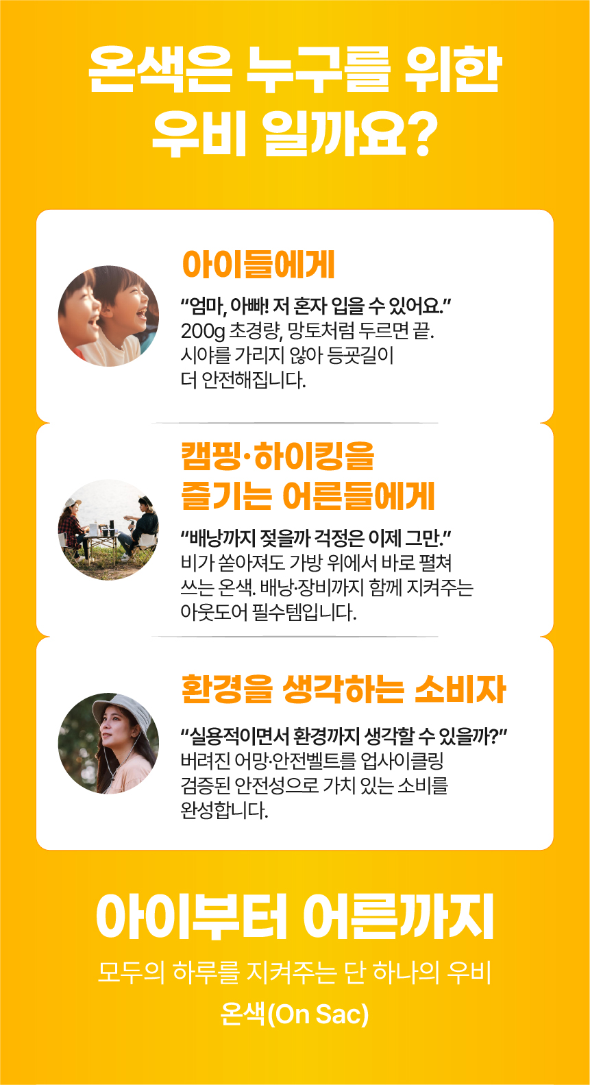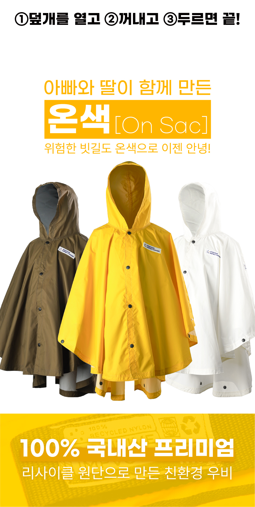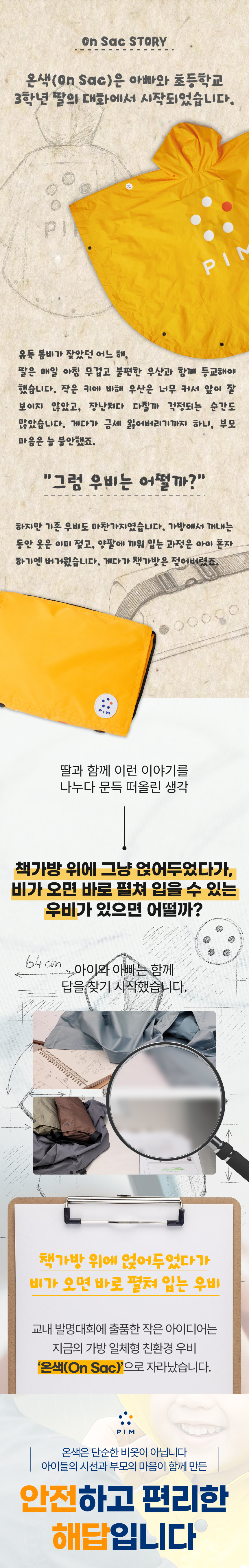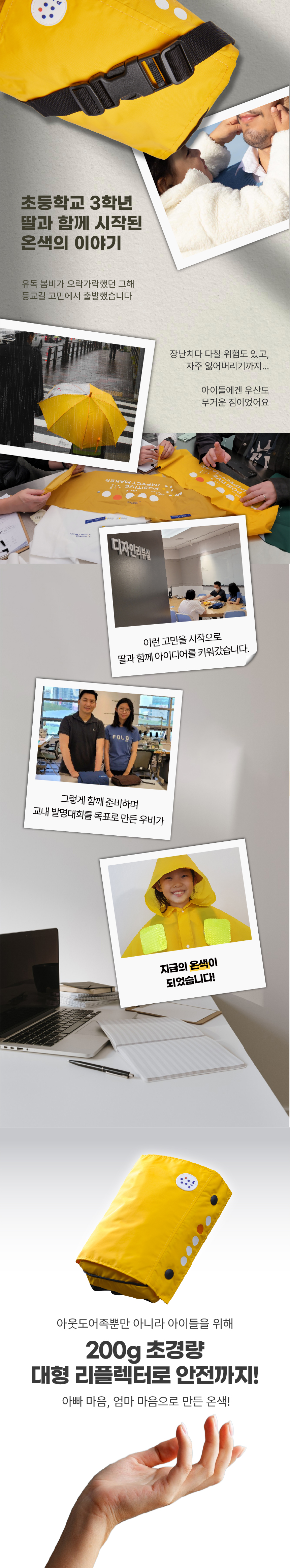 온색(On Sac)은 아빠와 초등학교 3학년 딸의 대화에서 시작됐습니다. 유난히 비가 잦던 해, 딸은 무겁고 위험한 우산을 들고 등교해야 했고 자주 잃어버리기도 했죠. 아빠는 그 모습이 늘 걱정이었습니다.