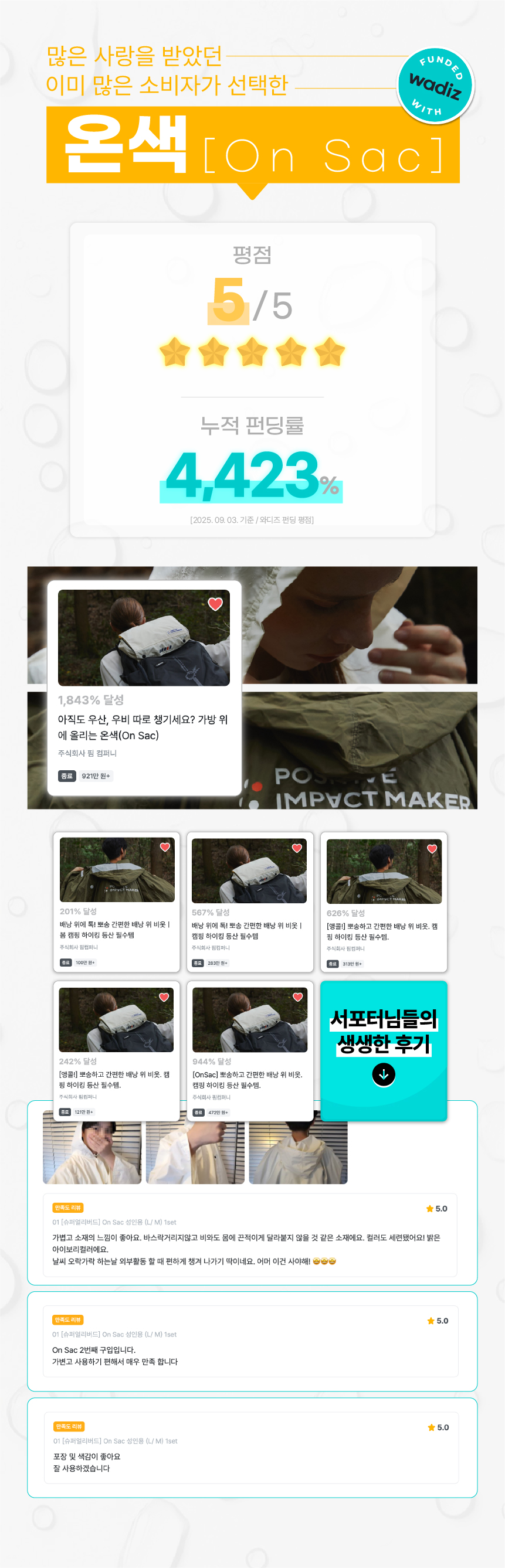 와디즈는 메이커의 아이디어와 가치관, 그리고 미래까지 첫 고객이자 파트너가 되어 주는 곳이라 생각합니다. 그래서 온색의 공식 라인업은 가장 먼저 와디즈에서 선보입니다.