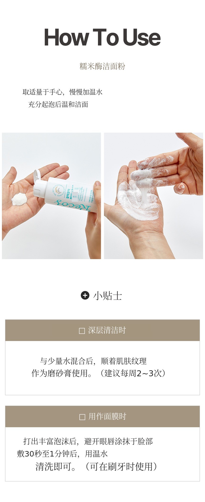 - 使用方法:加入少量水和糯米酶洗面剂后摇晃