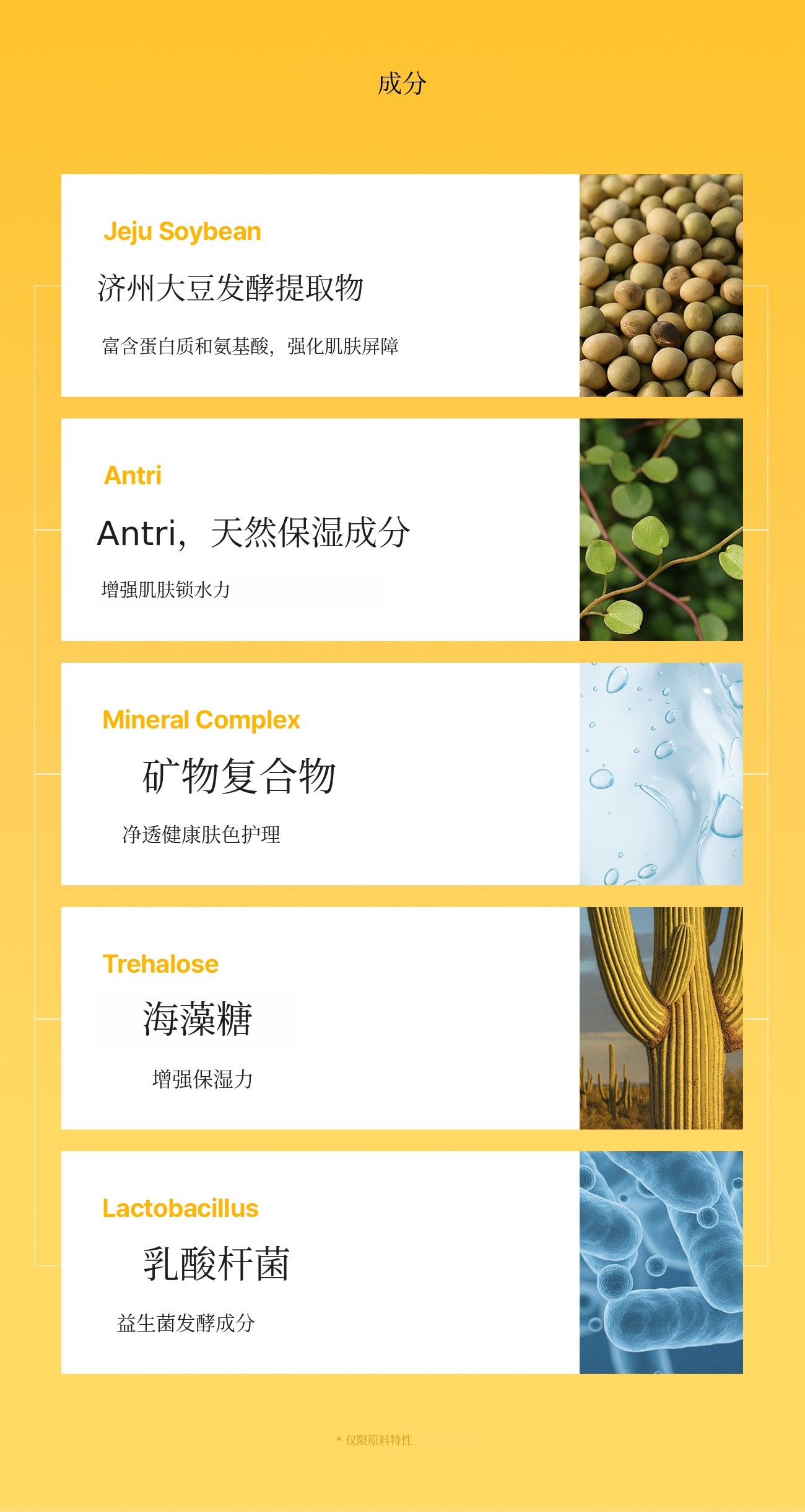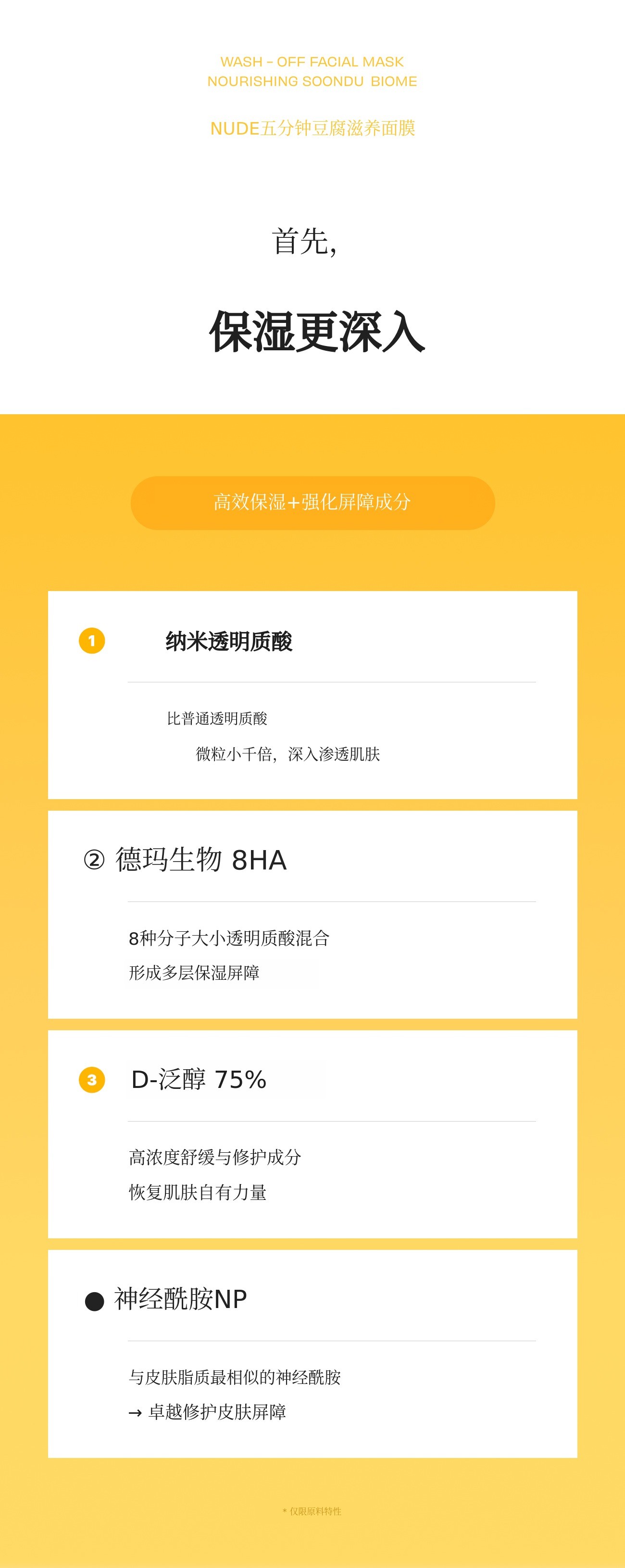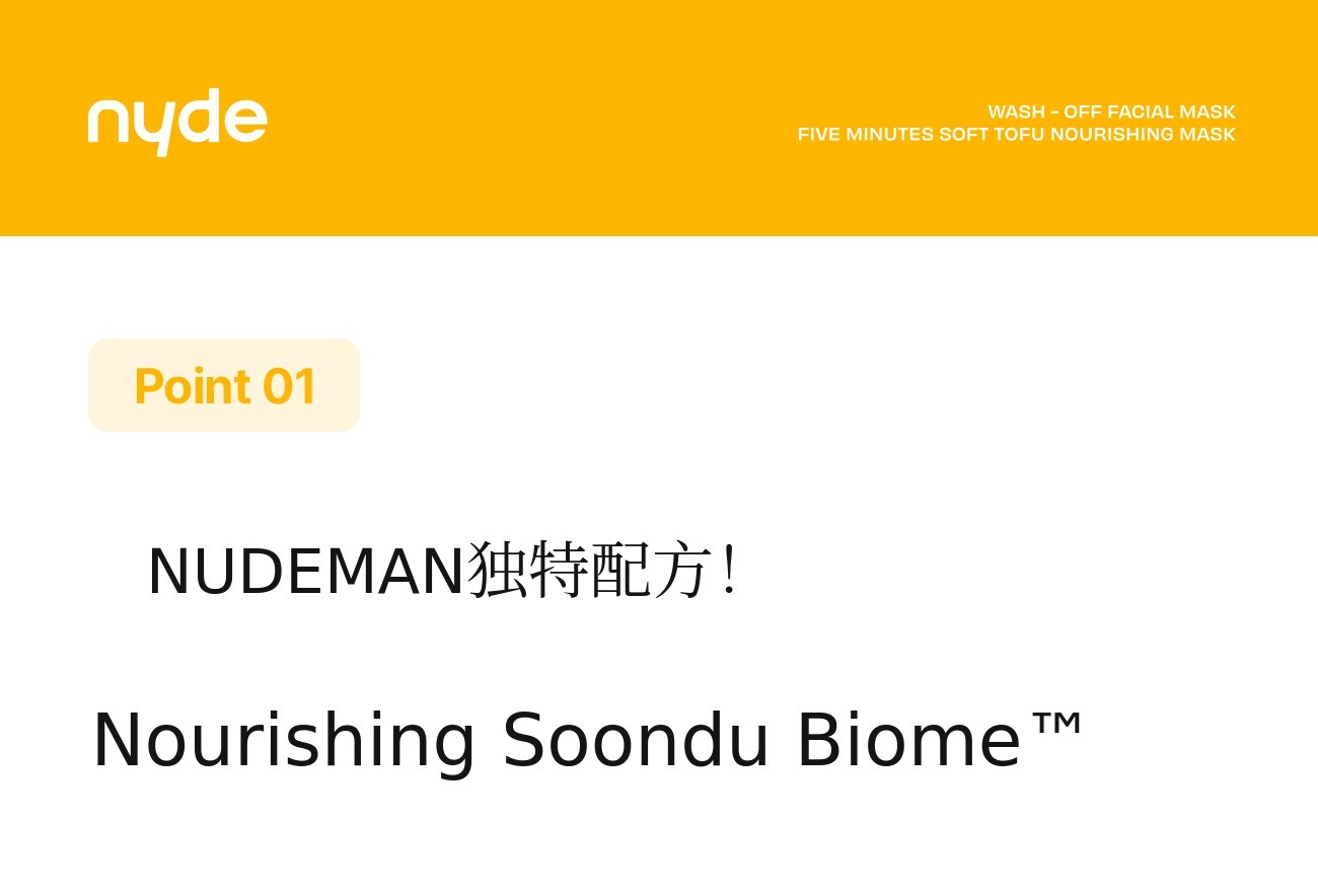 NudeMan独特的原料组合Nourishing SoonDooBiome™ 是以发酵大豆蛋白为核心,灵感来自于构成嫩豆腐成分的有效成分配比而设计的低刺激高保湿成分。