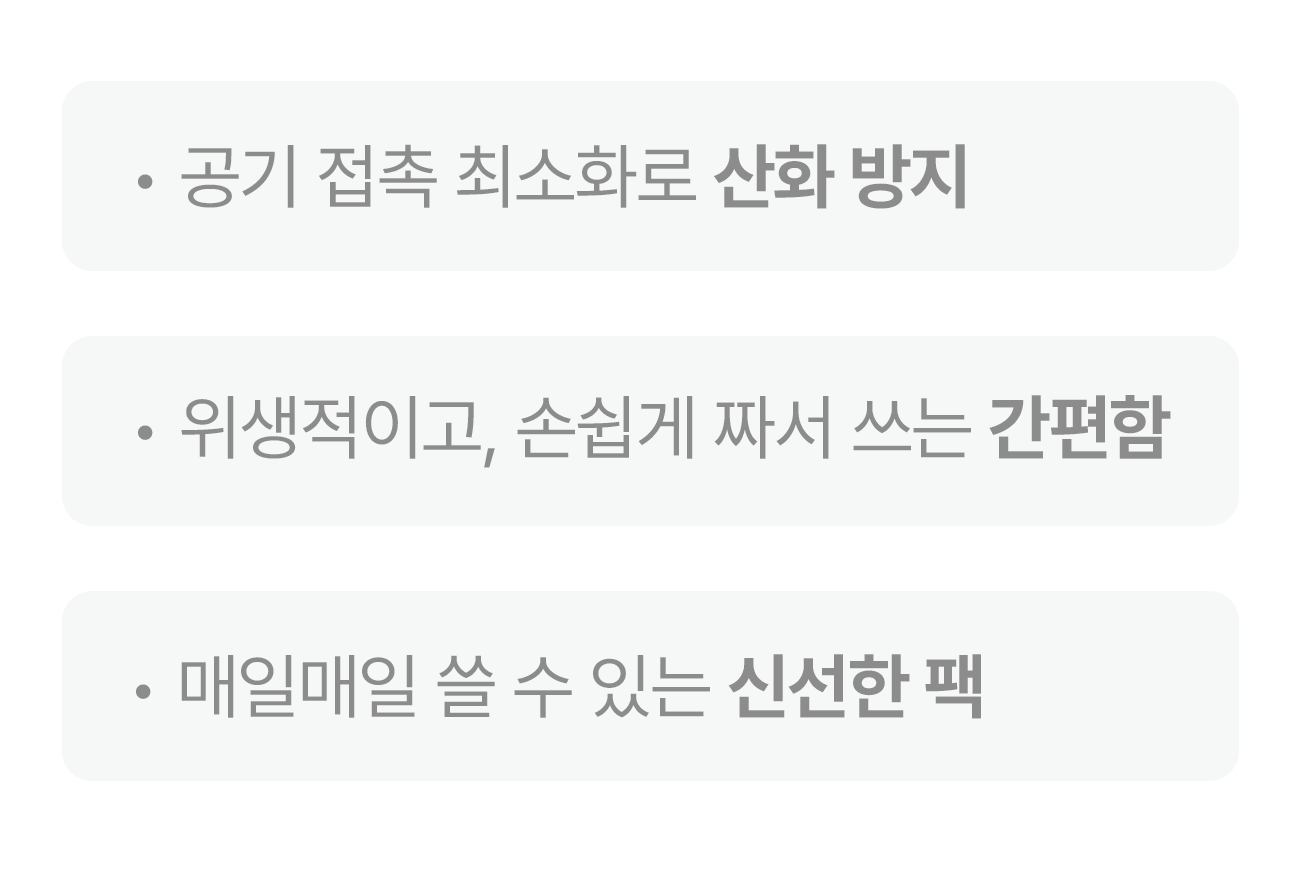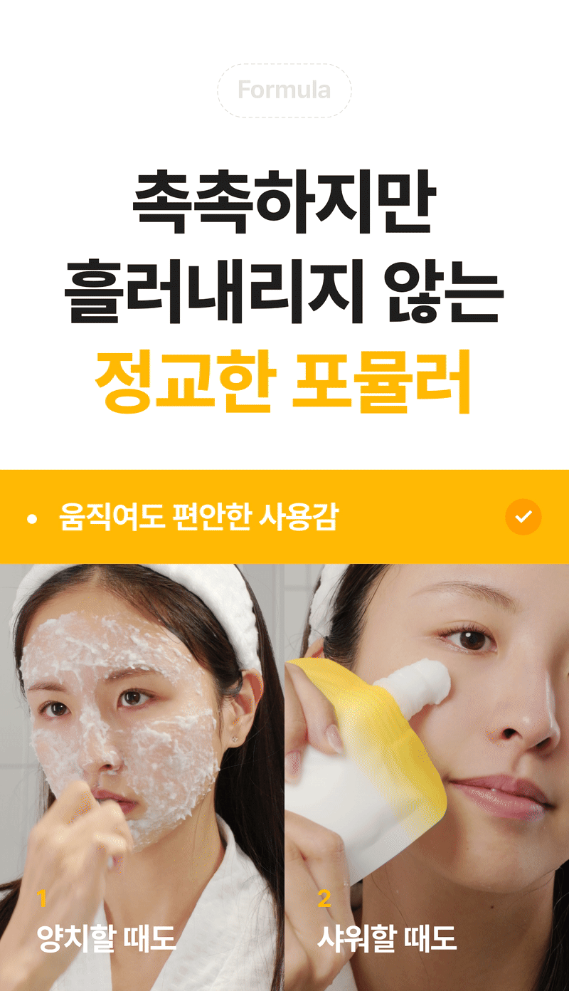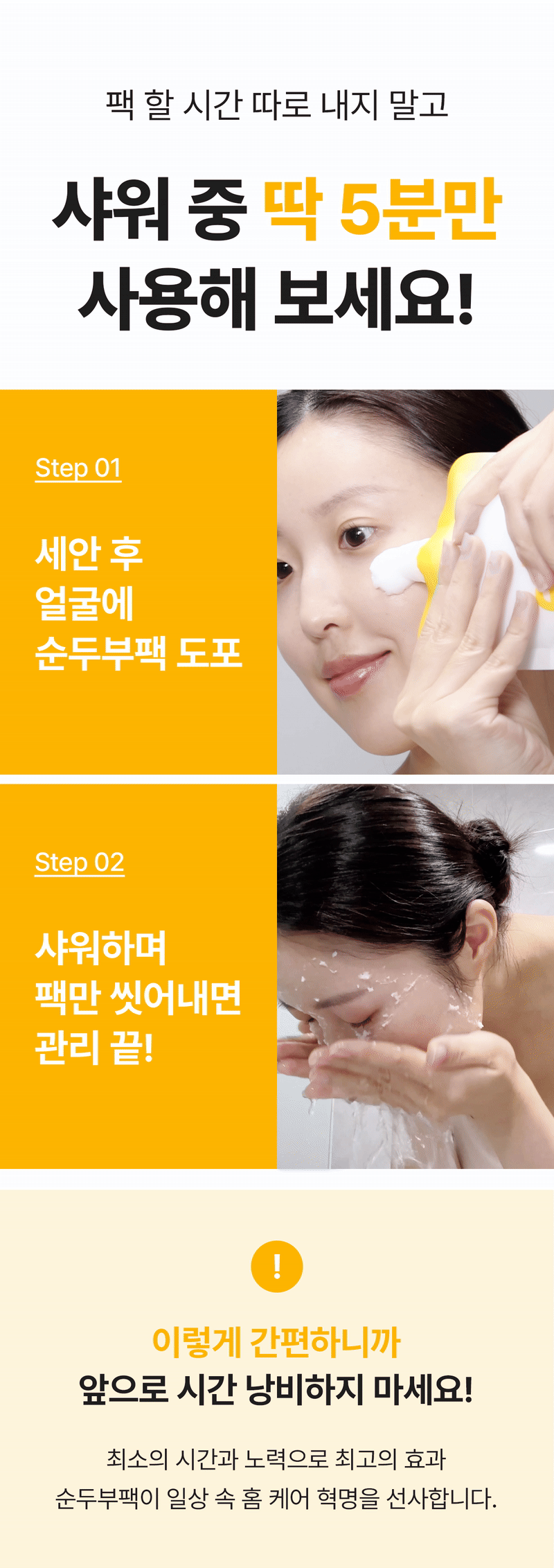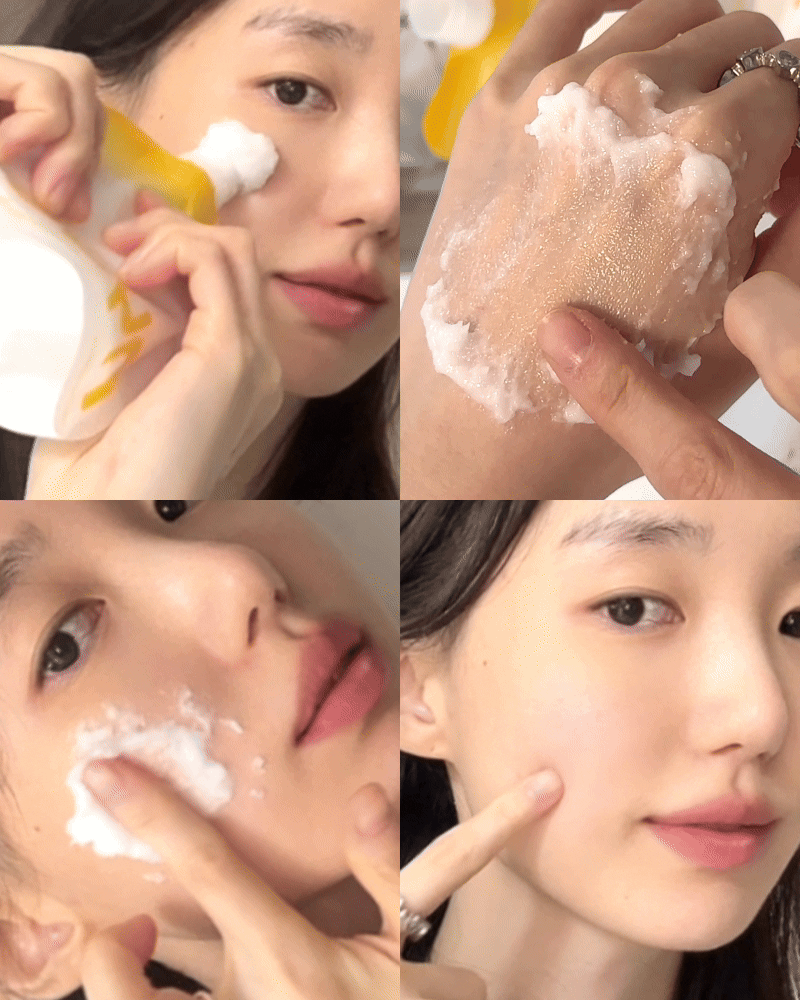 在忙碌的早晨或晚上,洗澡时一起使用,无需额外花时间。由于不会流淌的嫩豆腐真实质地,即使洗头或刷牙时也能稳定贴合于皮肤。沐浴最后阶段冲洗,即可在5分钟内完成嫩白豆腐肌肤护理。 - 利用质地特性的贴士