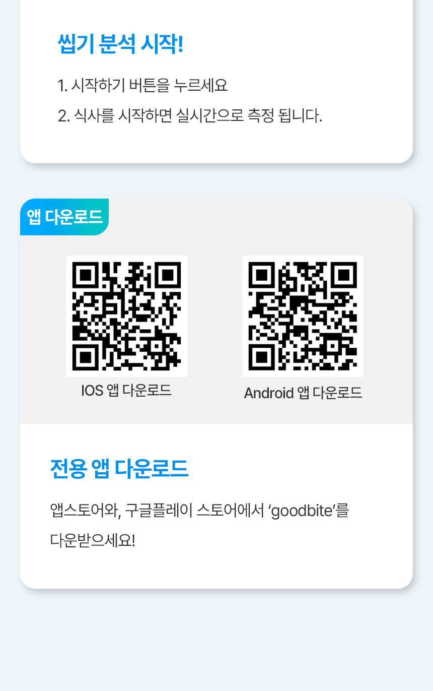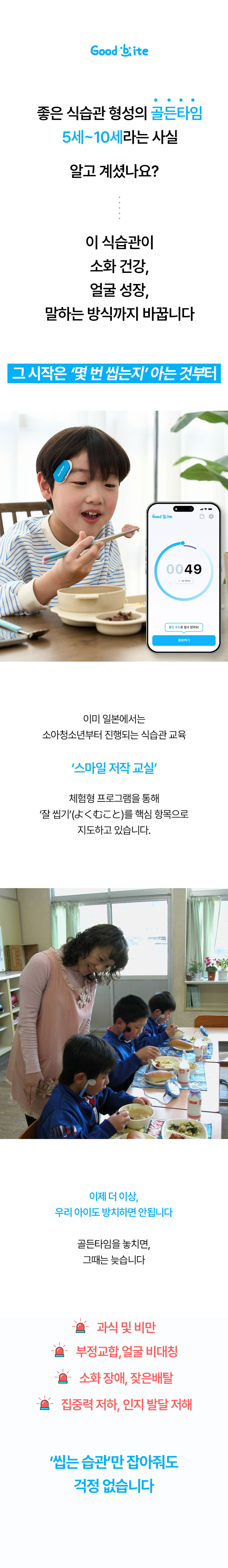 굿바이트는 ‘천천히 오래 씹기’라는 단순하지만 가장 강력한 건강 습관을 여러분의 삶 속에 자연스럽게 스며들게 하고 싶습니다.