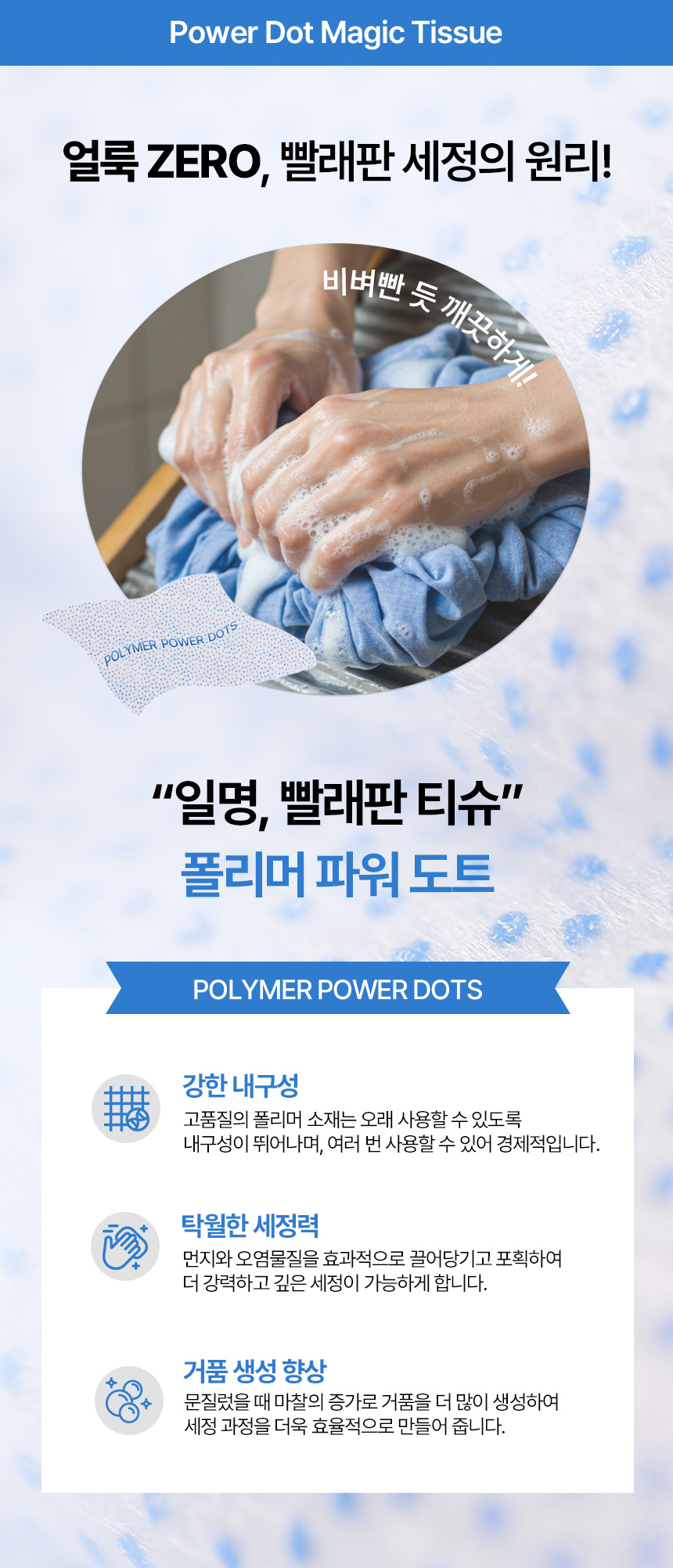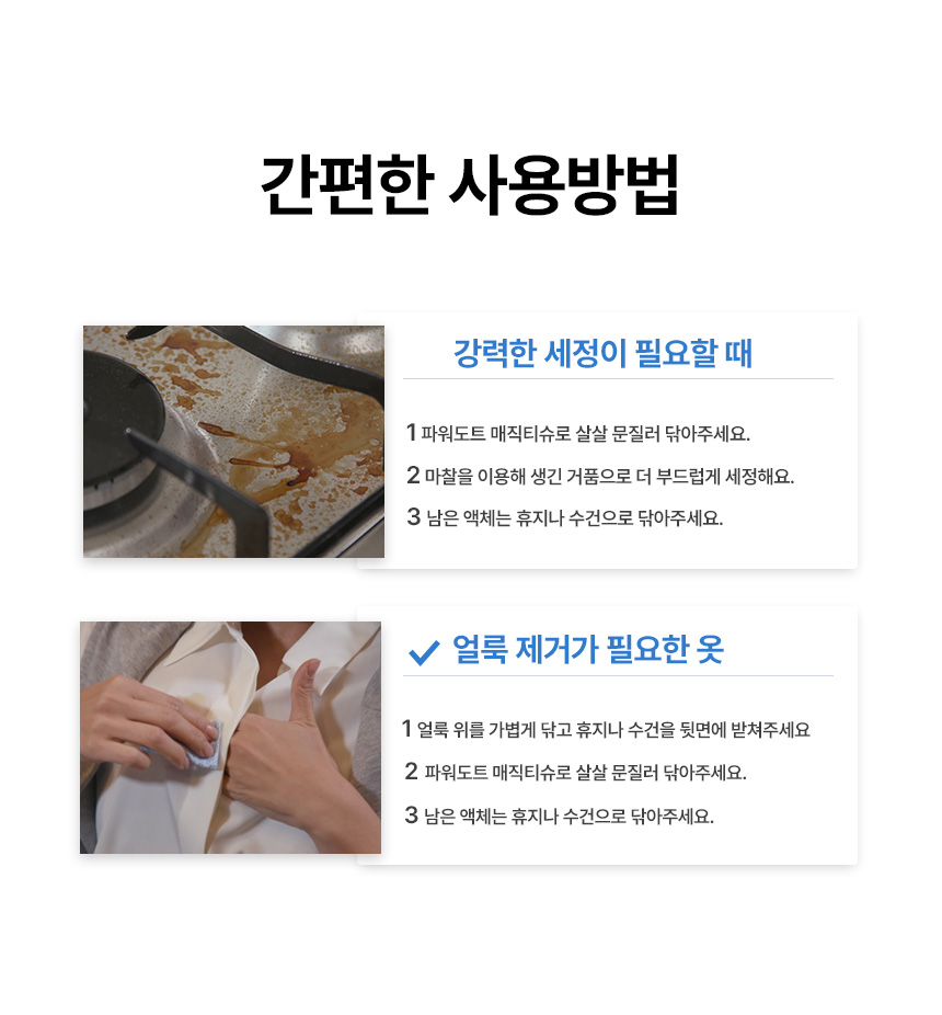 특히, 단백질 기반의 음식물 얼룩, 혈액, 땀 등은 일반 티슈로는 쉽게 제거되지 않아 많은 사람들이 어려움을 겪고 있습니다. 이에 저희는 단백질 분해 효소와 폴리머 파워도트를 활용하여 이러한 얼룩을 손쉽게 제거할 수 있는 파워도트 매직티슈를 개발하게 되었습니다.