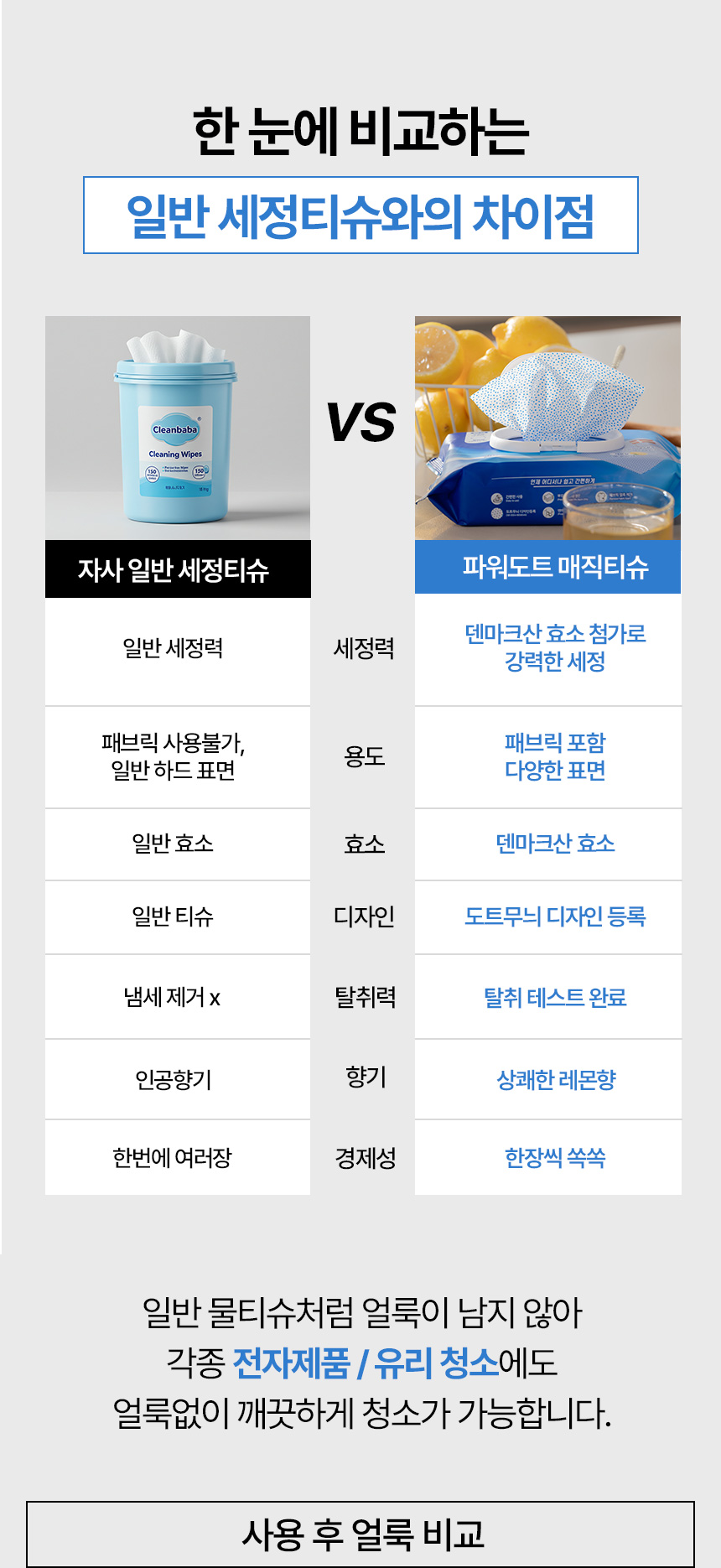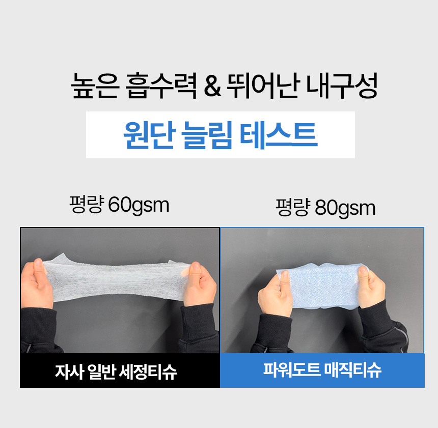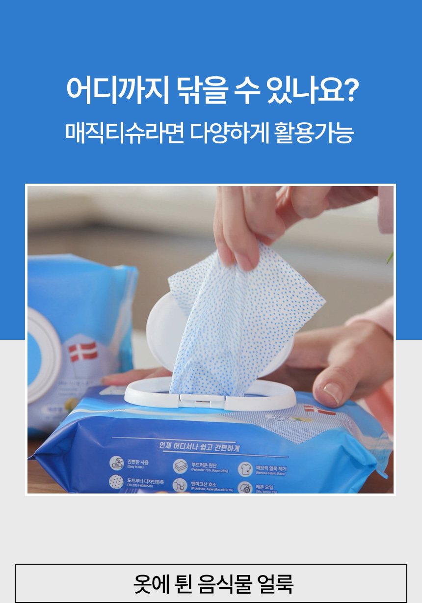이에 저희는 가장 간편하면서도 효과적인 얼룩 제거 방법을 연구하기 시작했고, 티슈 형태로 뽑아 쓰는 것이 가장 이상적이라는 결론에 도달했습니다. 티슈는 누구나 손쉽게 사용할 수 있고, 휴대성도 뛰어나기 때문이죠.