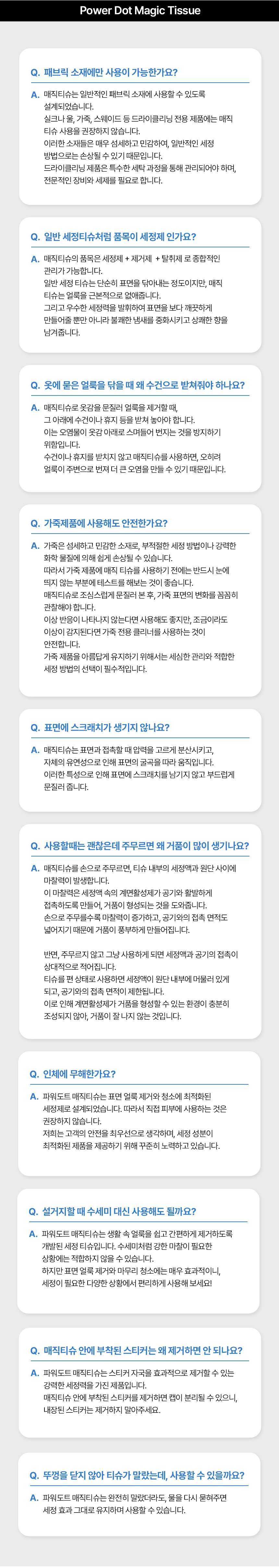 와디즈를 통해 저희는 서포터 여러분과 적극적으로 소통하며, 여러분의 아이디어와 제안을 귀담아 듣고자 합니다. 이를 통해 파워도트 매직티슈를 더욱 완벽한 제품으로 만들어가는 것이 저희의 목표입니다.