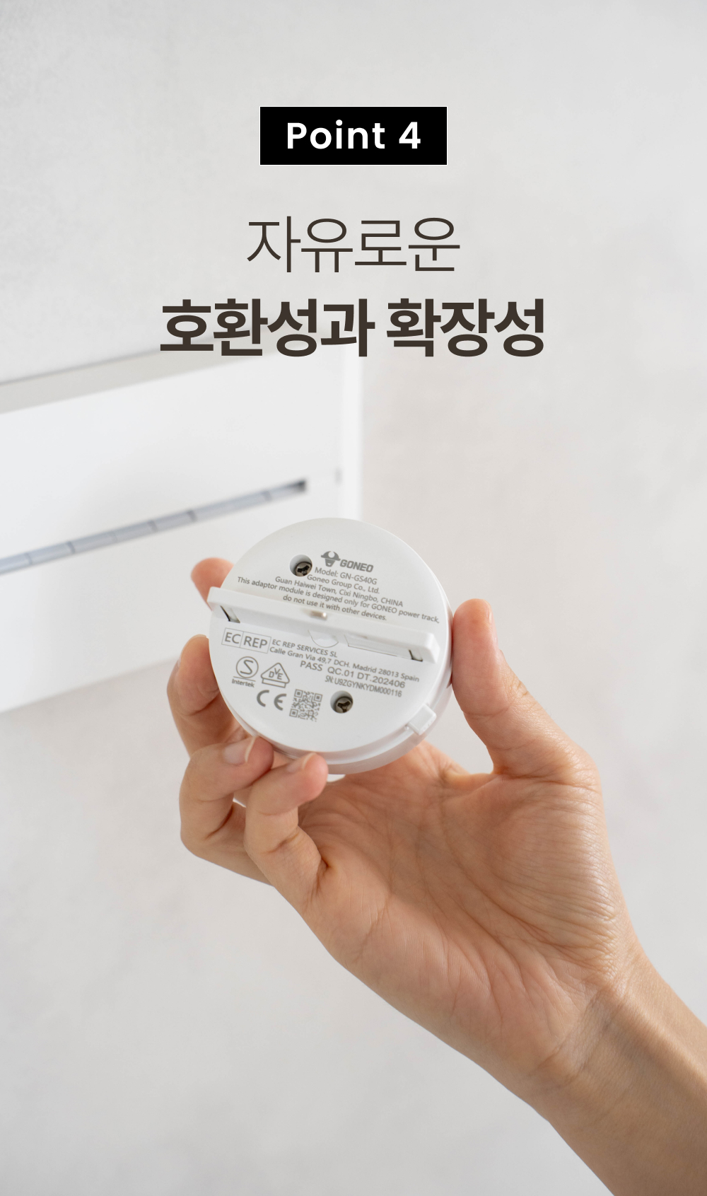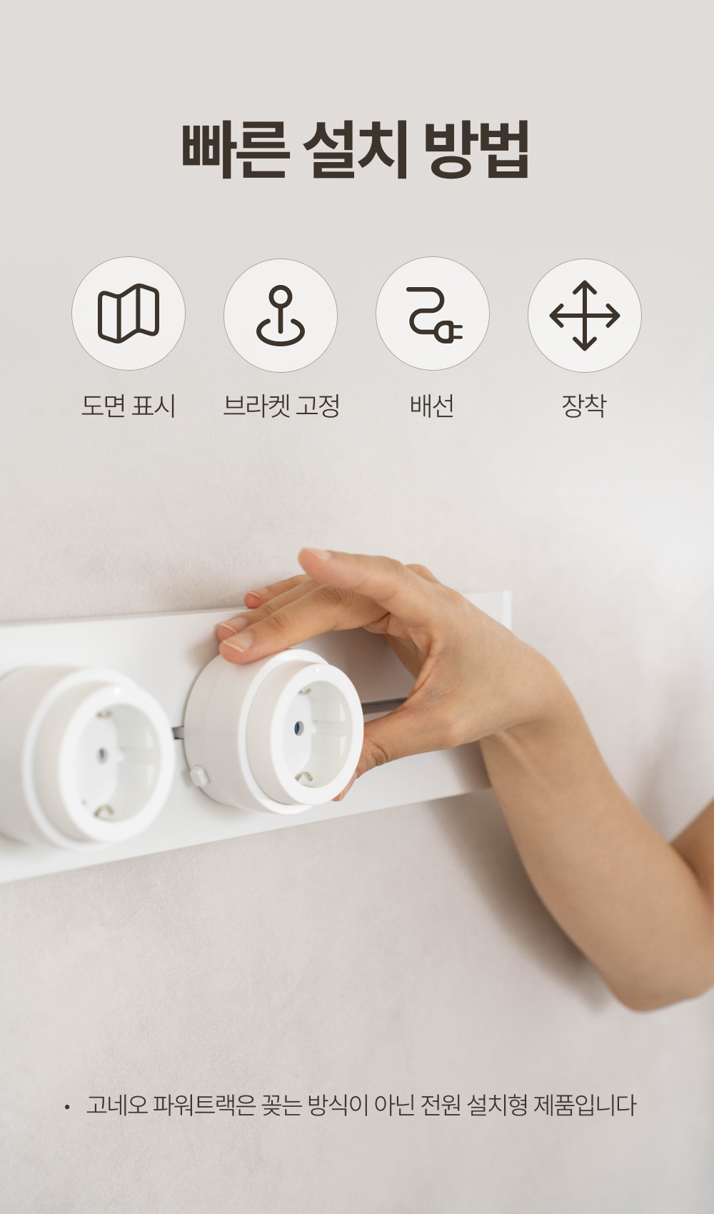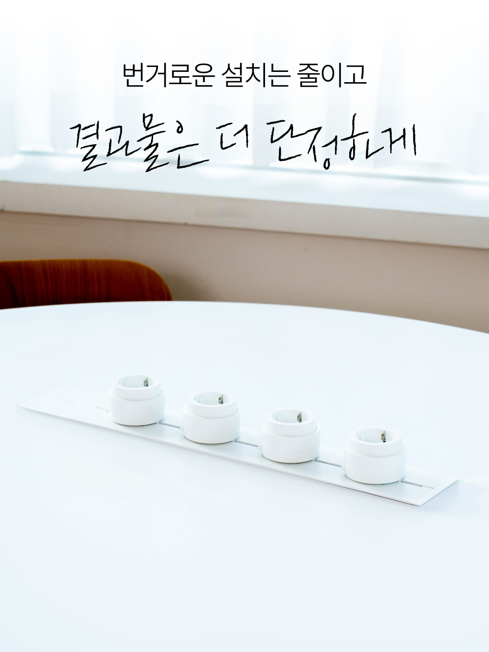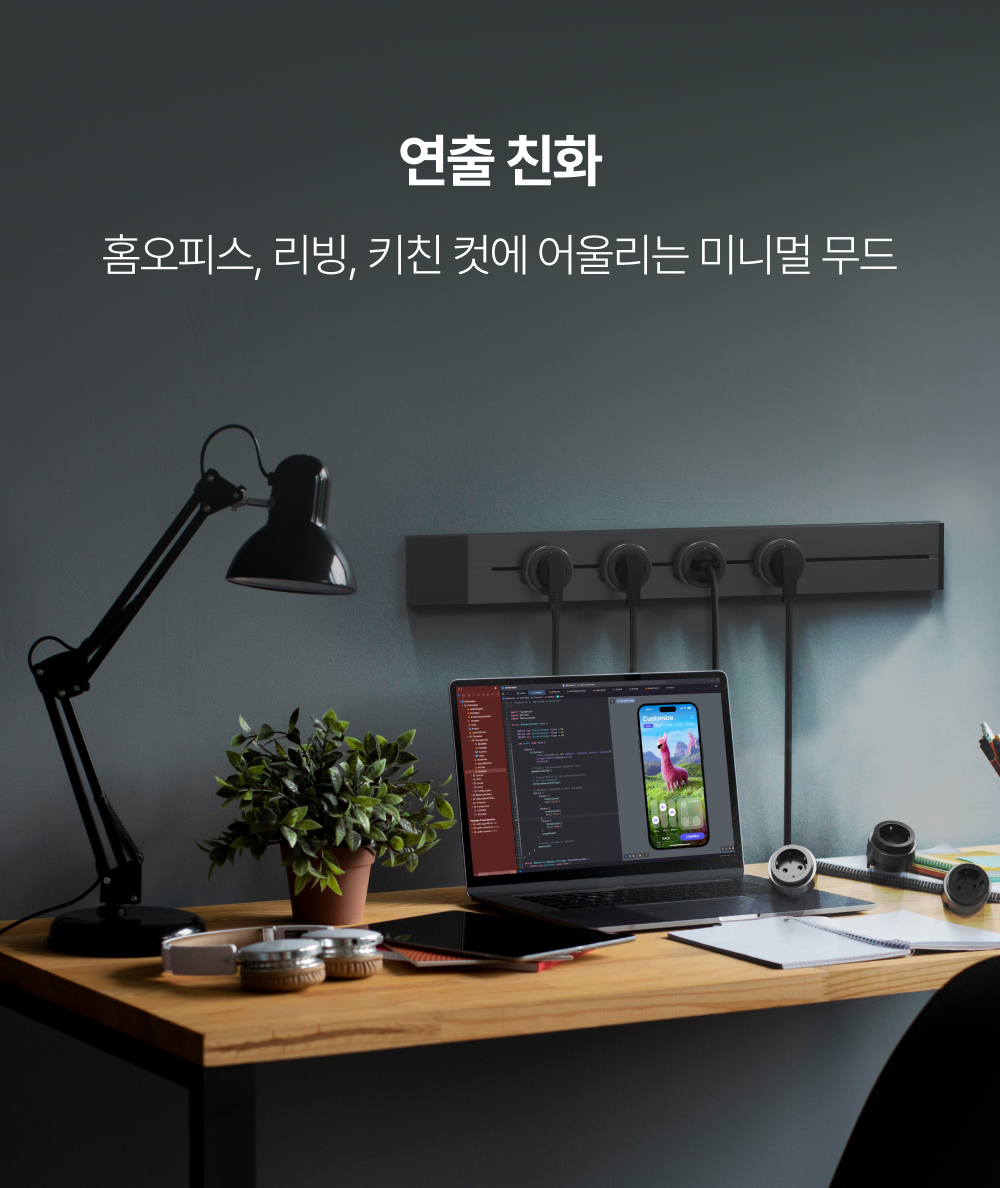 저희 팀은 설치·인테리어·전기 분야 실무자들이 모여 있습니다. 책상 밑에서 전선을 정리하다 보면, 결국 유연성·안전·미관이 동시에 해결돼야 한다는 결론에 닿았습니다. 그래서 소켓(어댑터)을 이동·추가·간격 조절할 수 있게 하고, 본체는 벽과 가구에 일체감 있도록 설계했습니다.