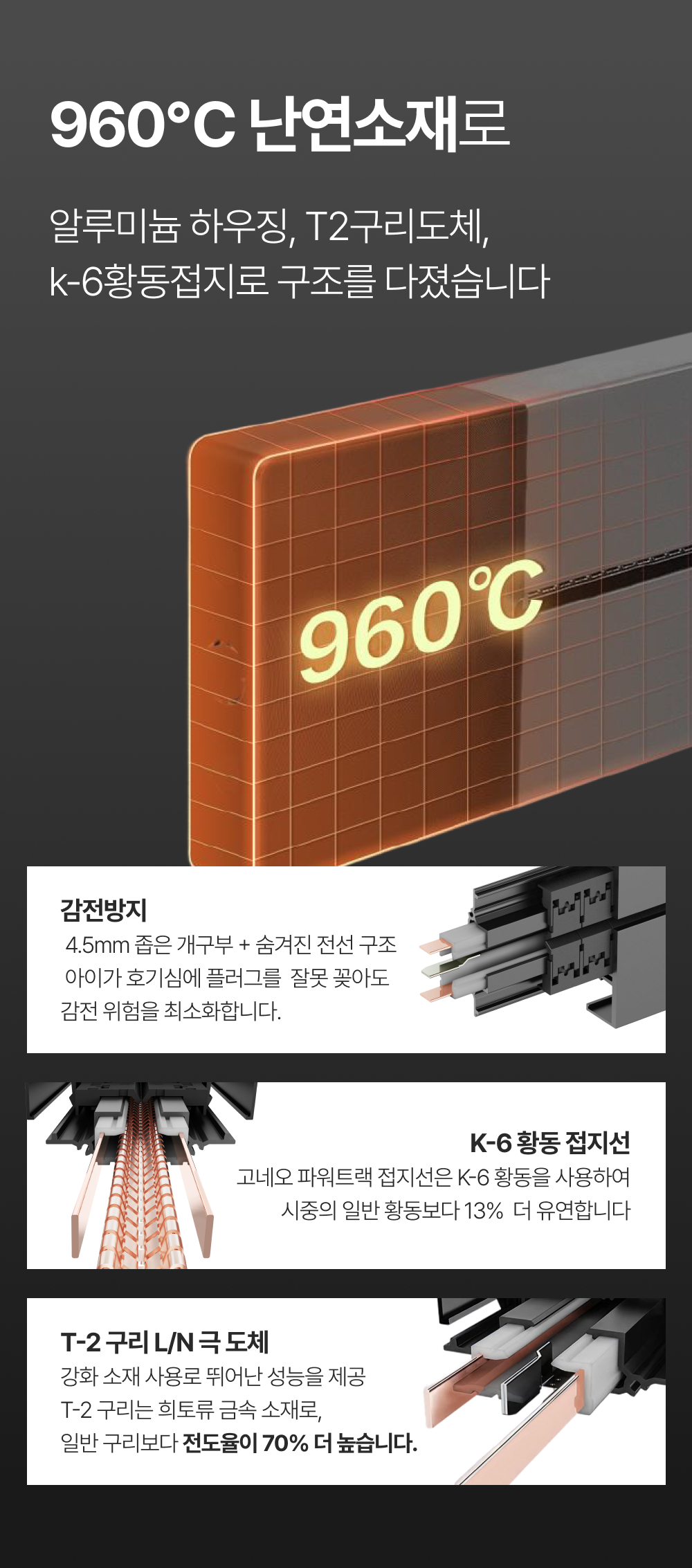 하루를 버티는 제품이 아니라 오래 쓰는 설비를 목표로 만듭니다. 알루미늄 하우징, T2 구리 도체, 접지·절연 강화를 통해 상시 사용 환경에서도 안정성을 확보했습니다. 수율과 불량 데이터를 꾸준히 점검하고 있으며, 설치 가이드는 이미지·영상으로 계속 보완하고 있습니다.