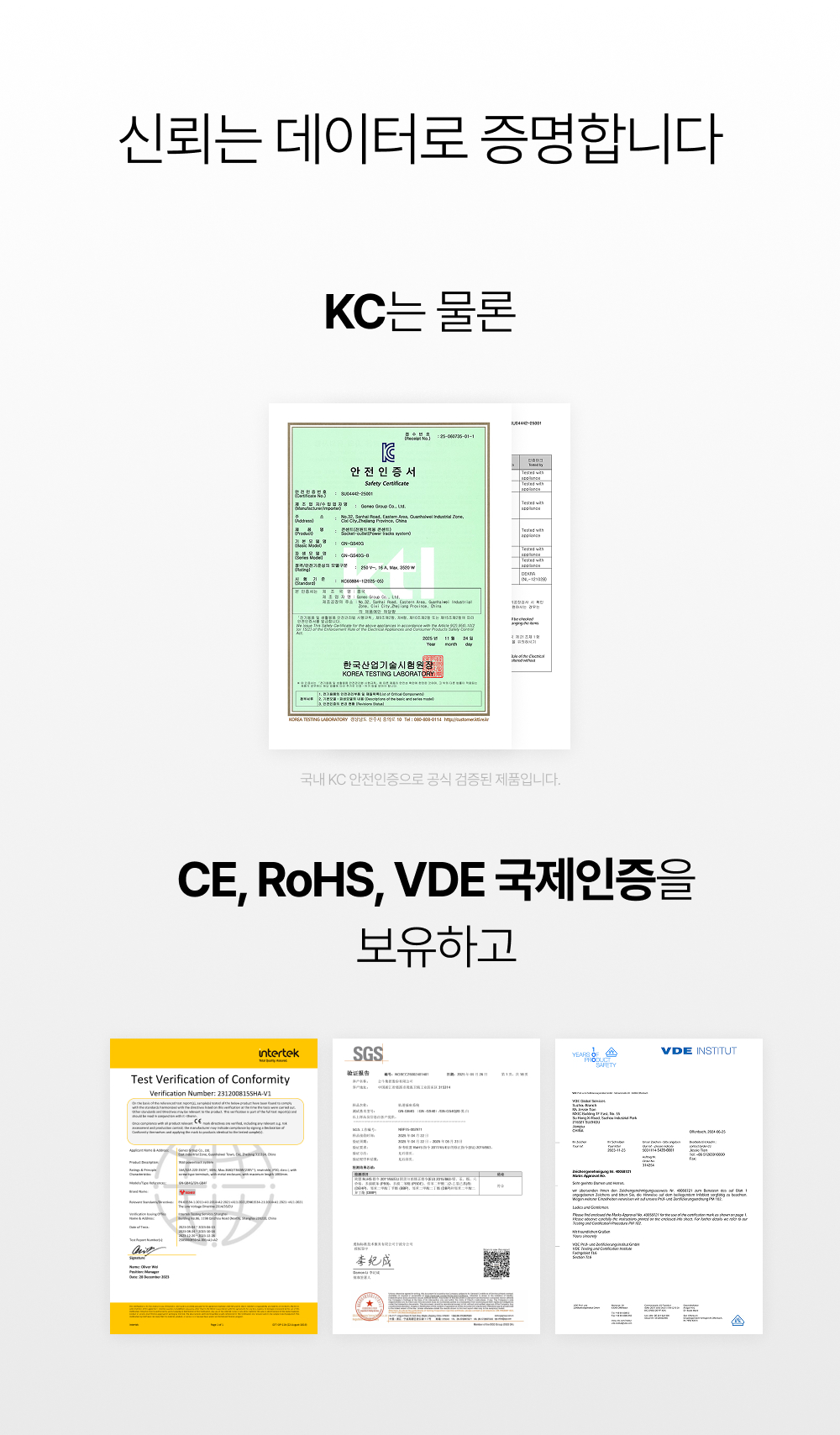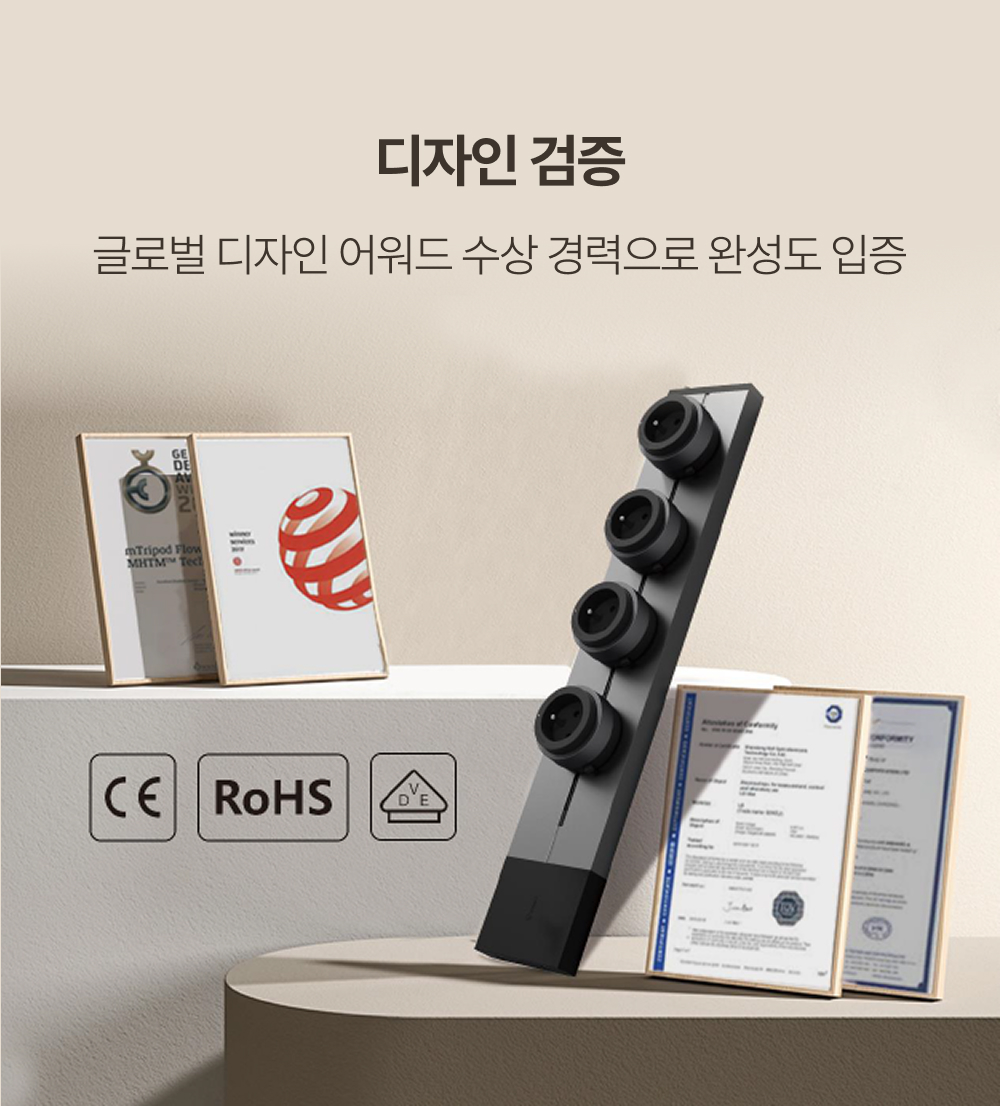 또한 KC · CE · RoHS · VDE 인증을 통해 품질을 확인받았고, 디자인 측면에서도 Red Dot · iF 수상으로 완성도를 검증받았습니다.