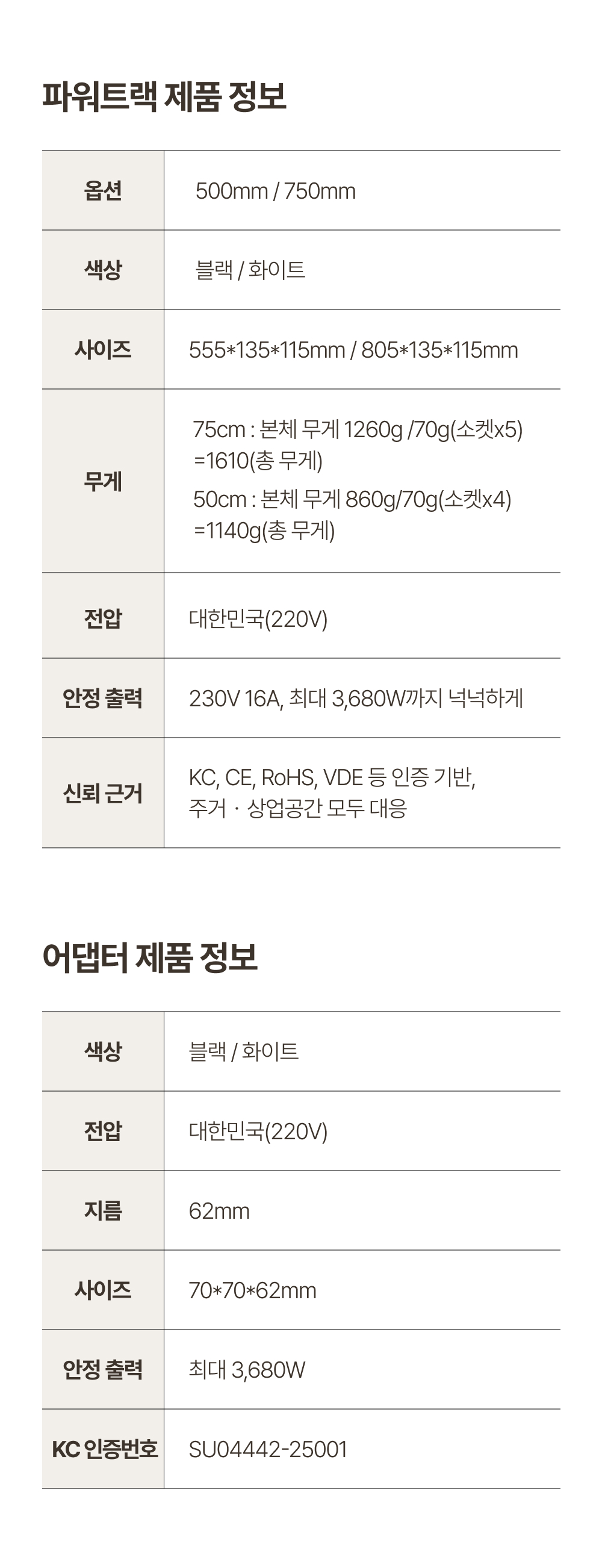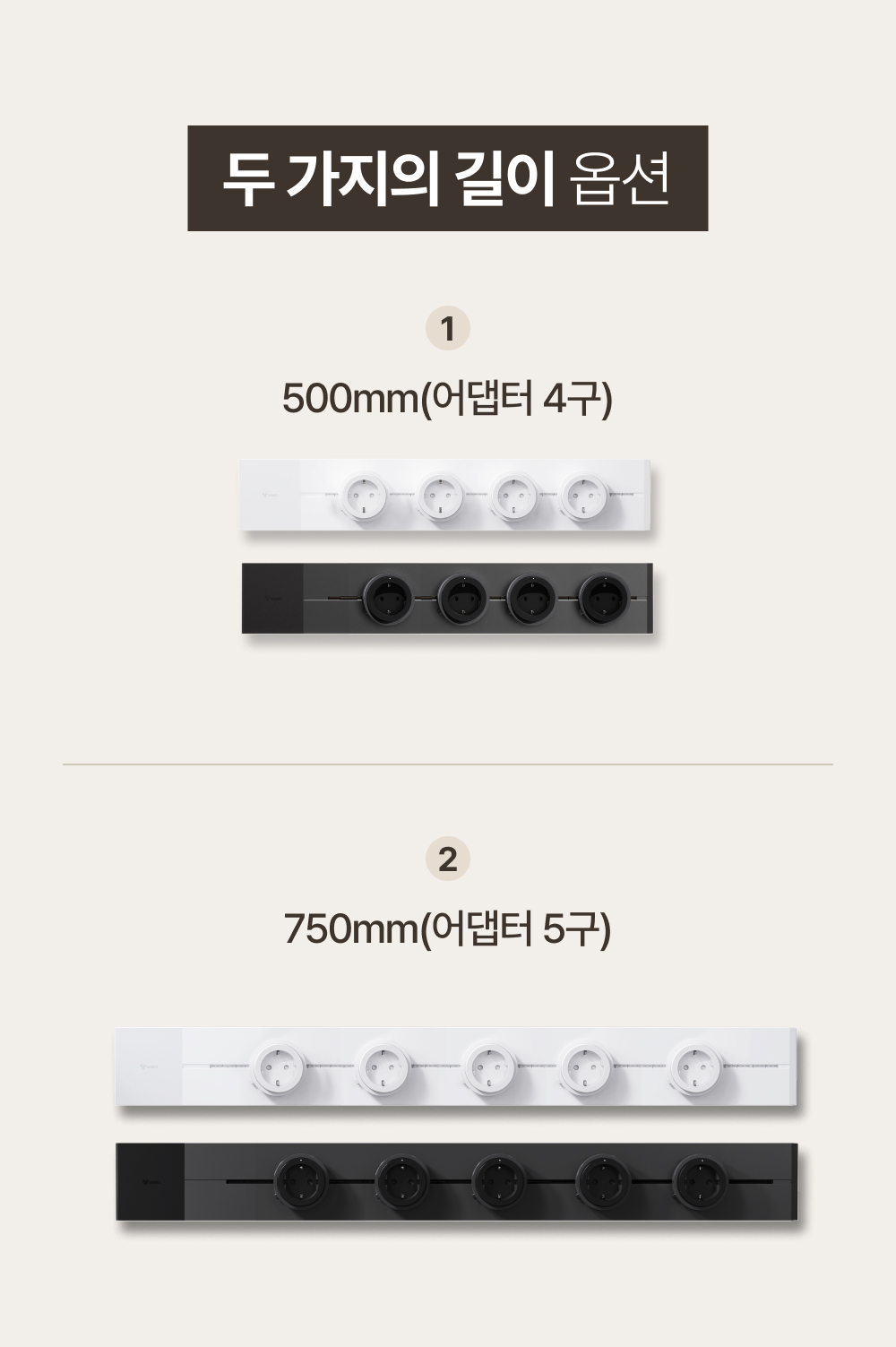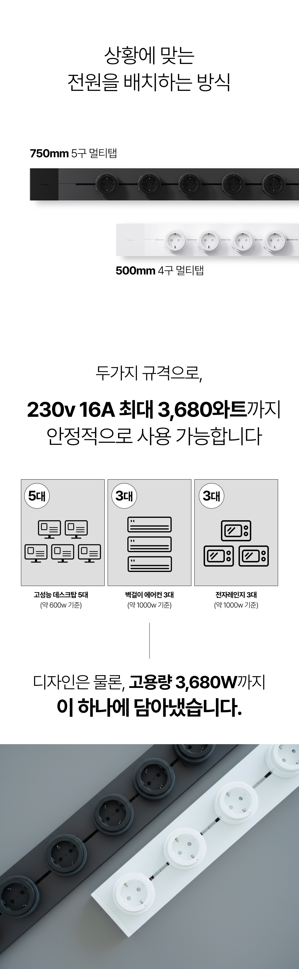 두 가지 길이: 500mm(4구) / 750mm(5구). 230V·16A, 최대 3,680W로 일상 전원을 안정적으로 커버합니다.