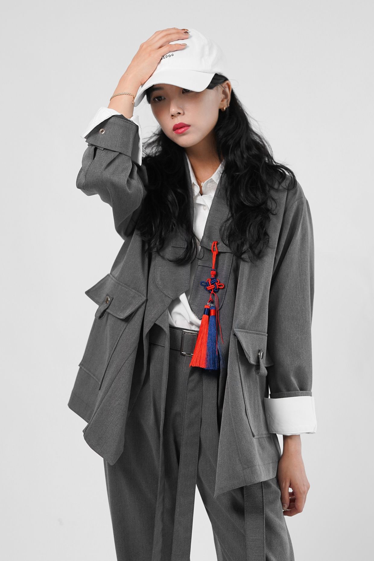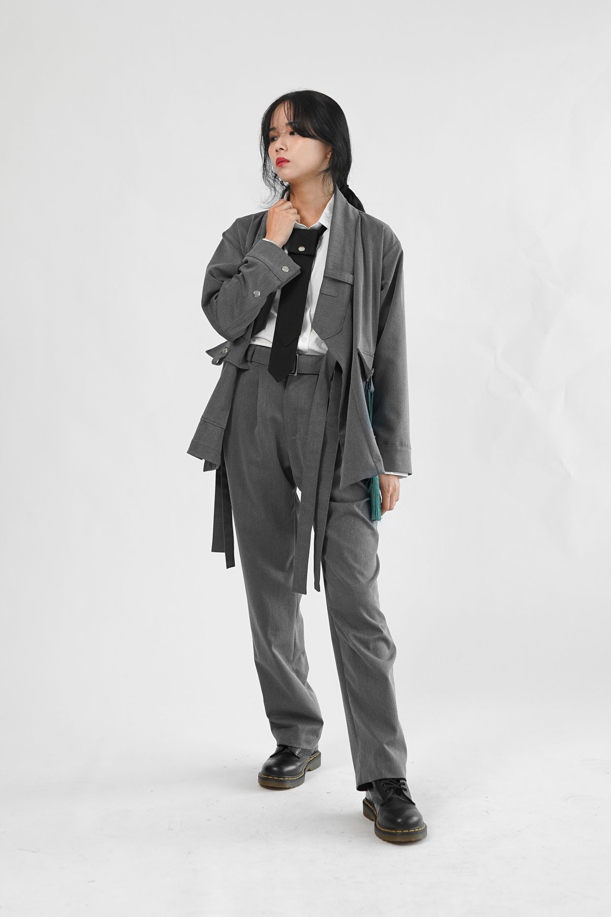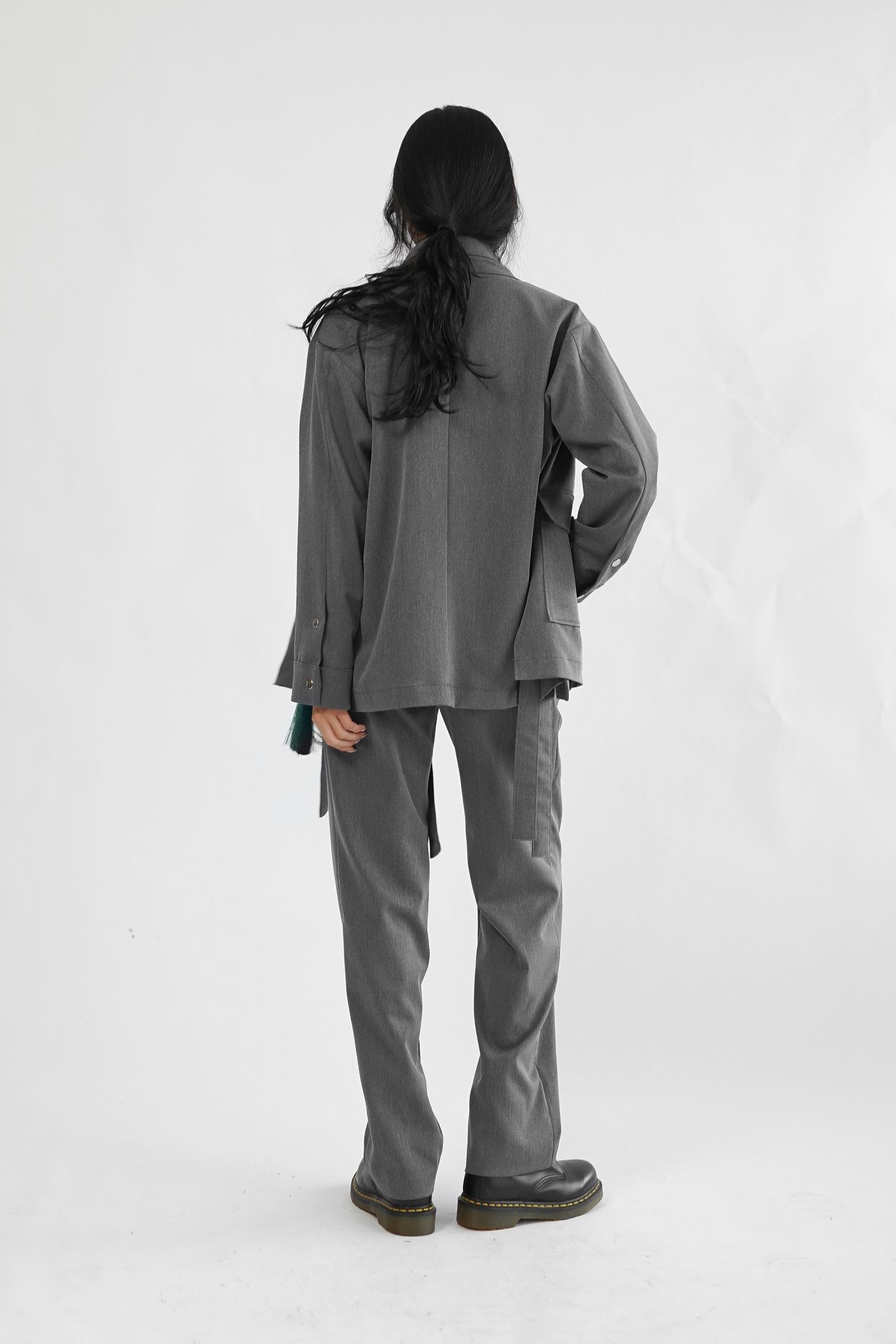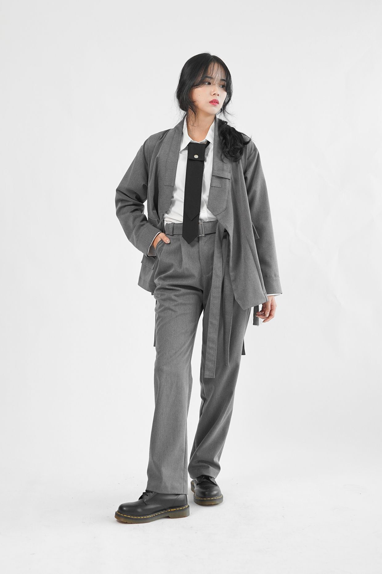 원단의 결감이 있는 그레이 컬러는 현대적인 워커홀릭 스타일의