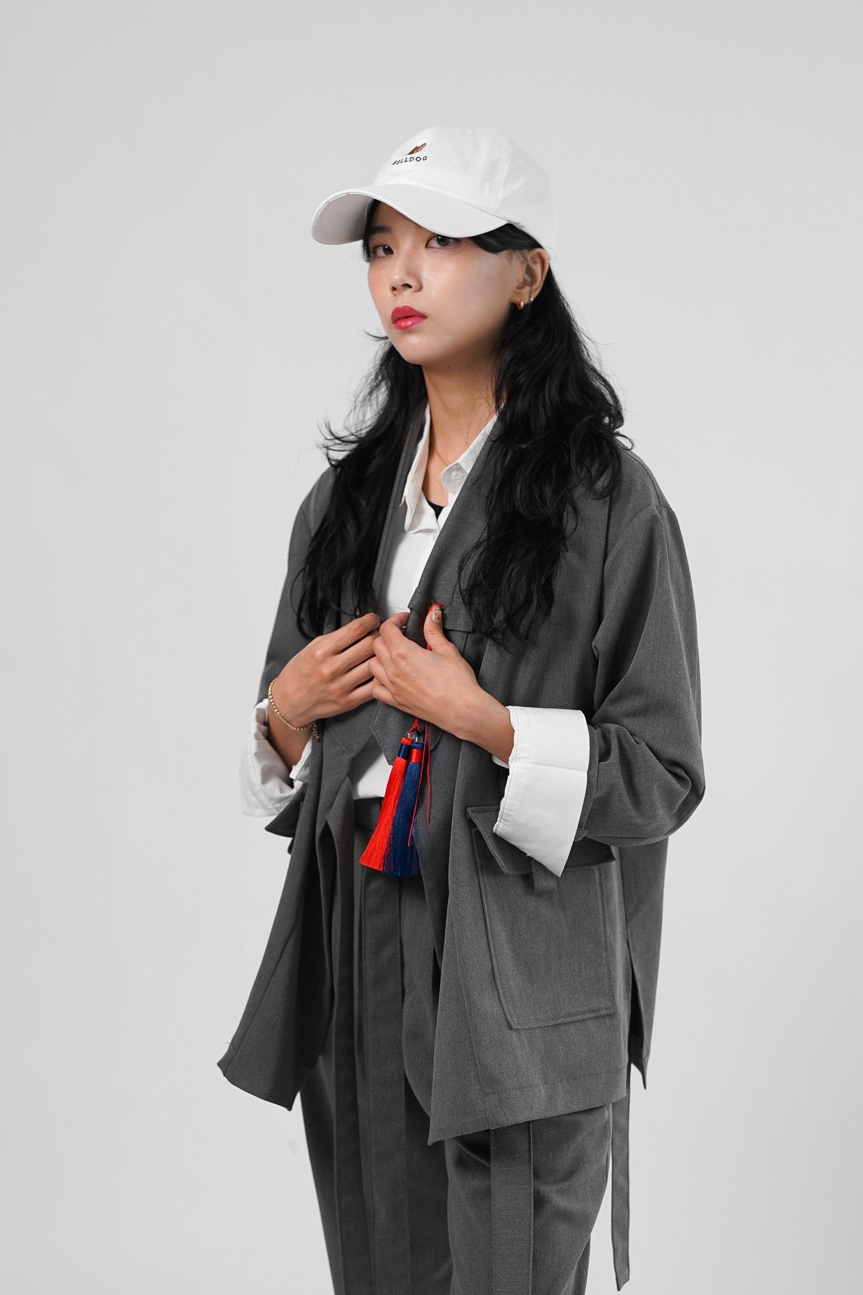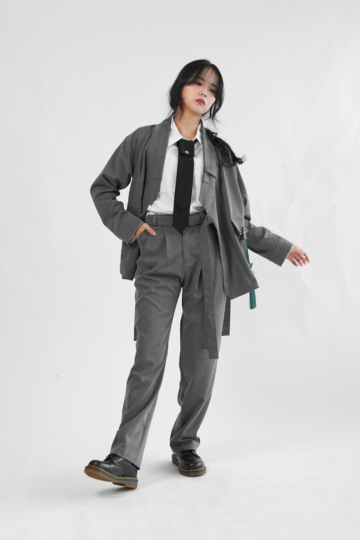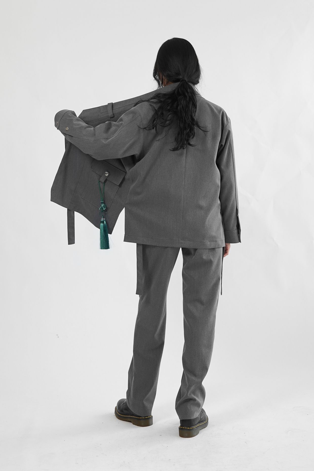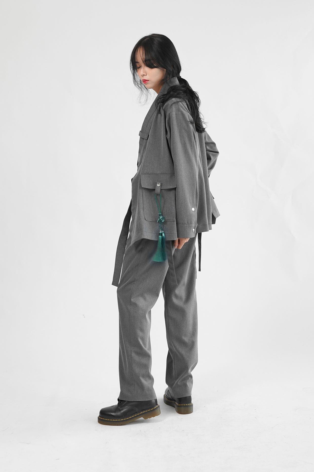 원단의 결감이 있는 그레이 컬러는 현대적인 워커홀릭 스타일의