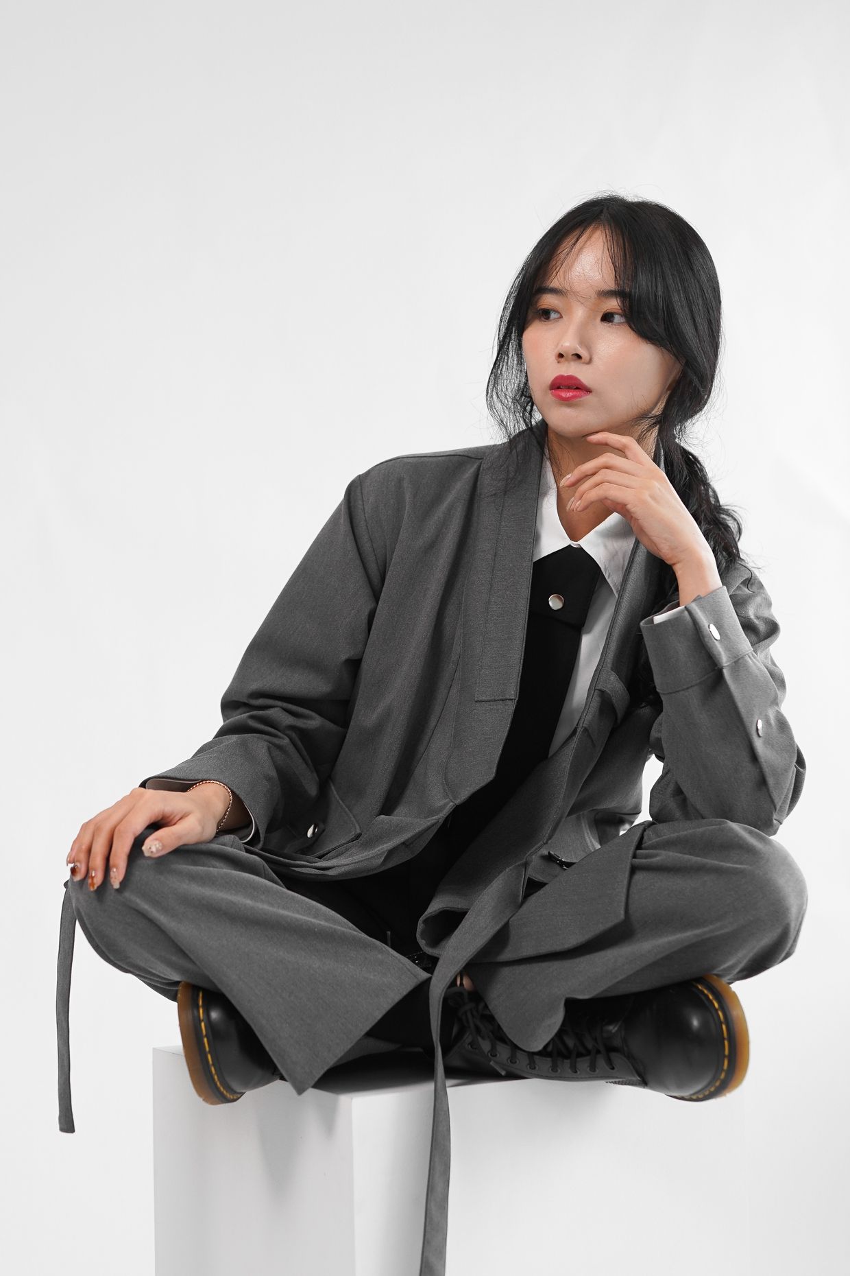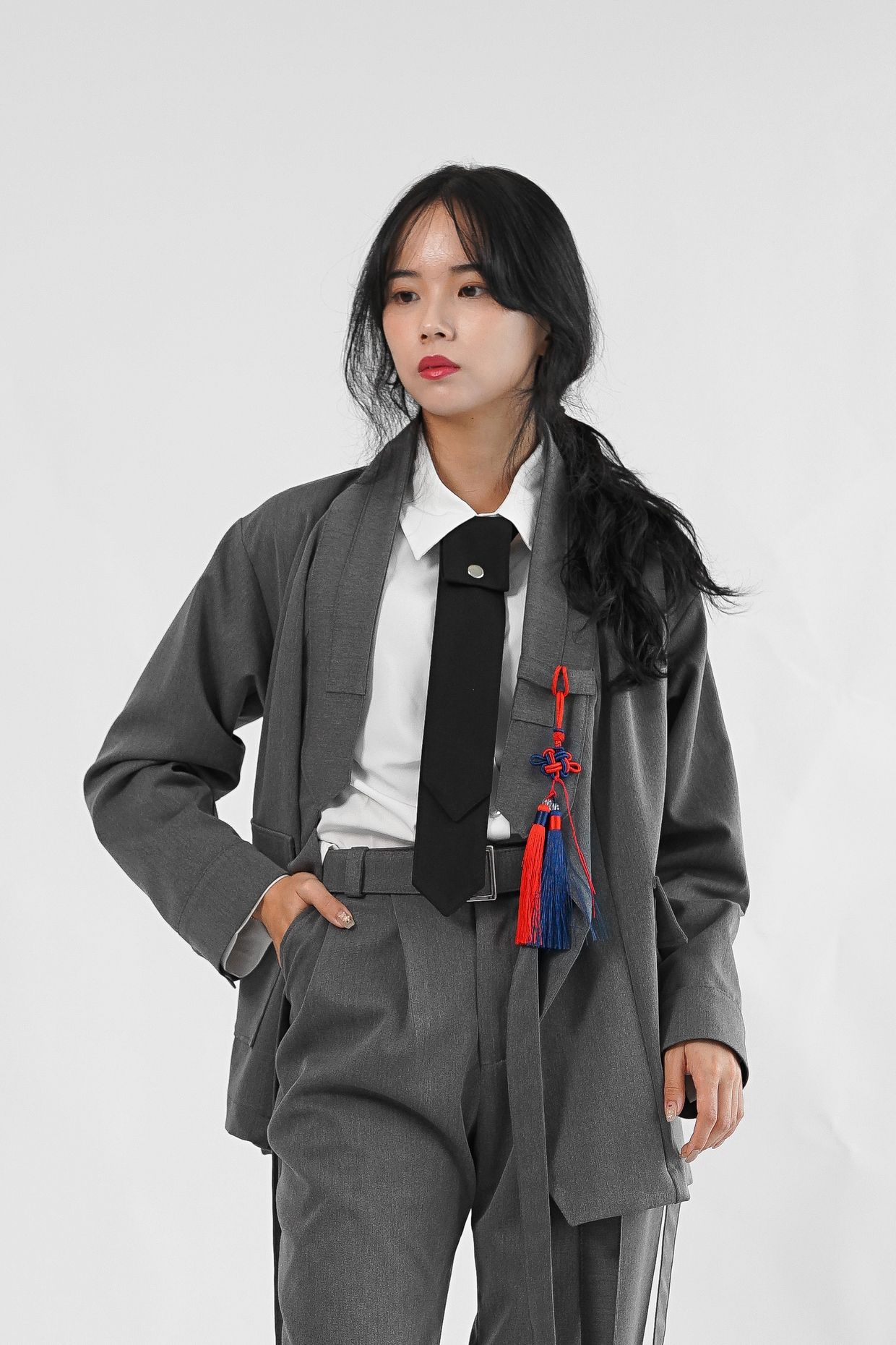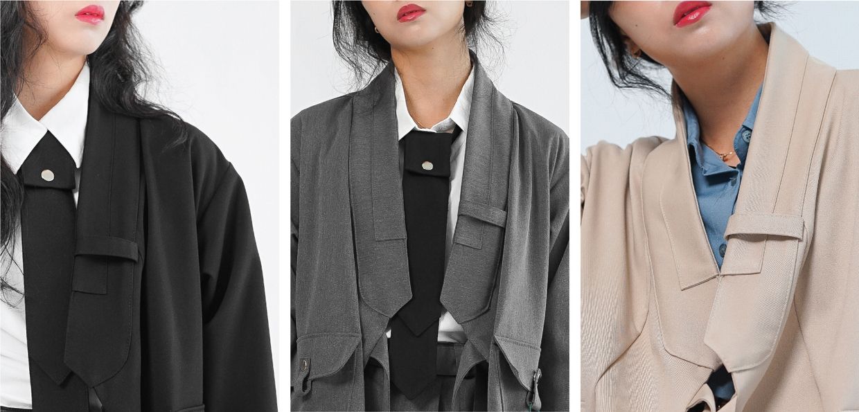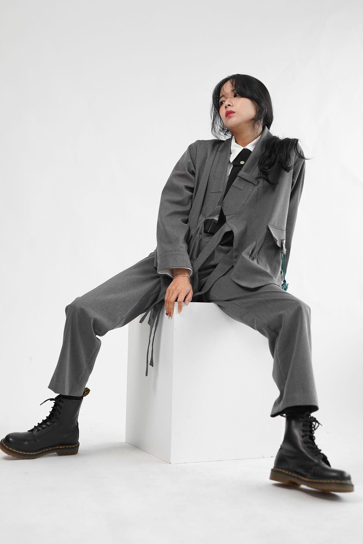 원단의 결감이 있는 그레이 컬러는 현대적인 워커홀릭 스타일의