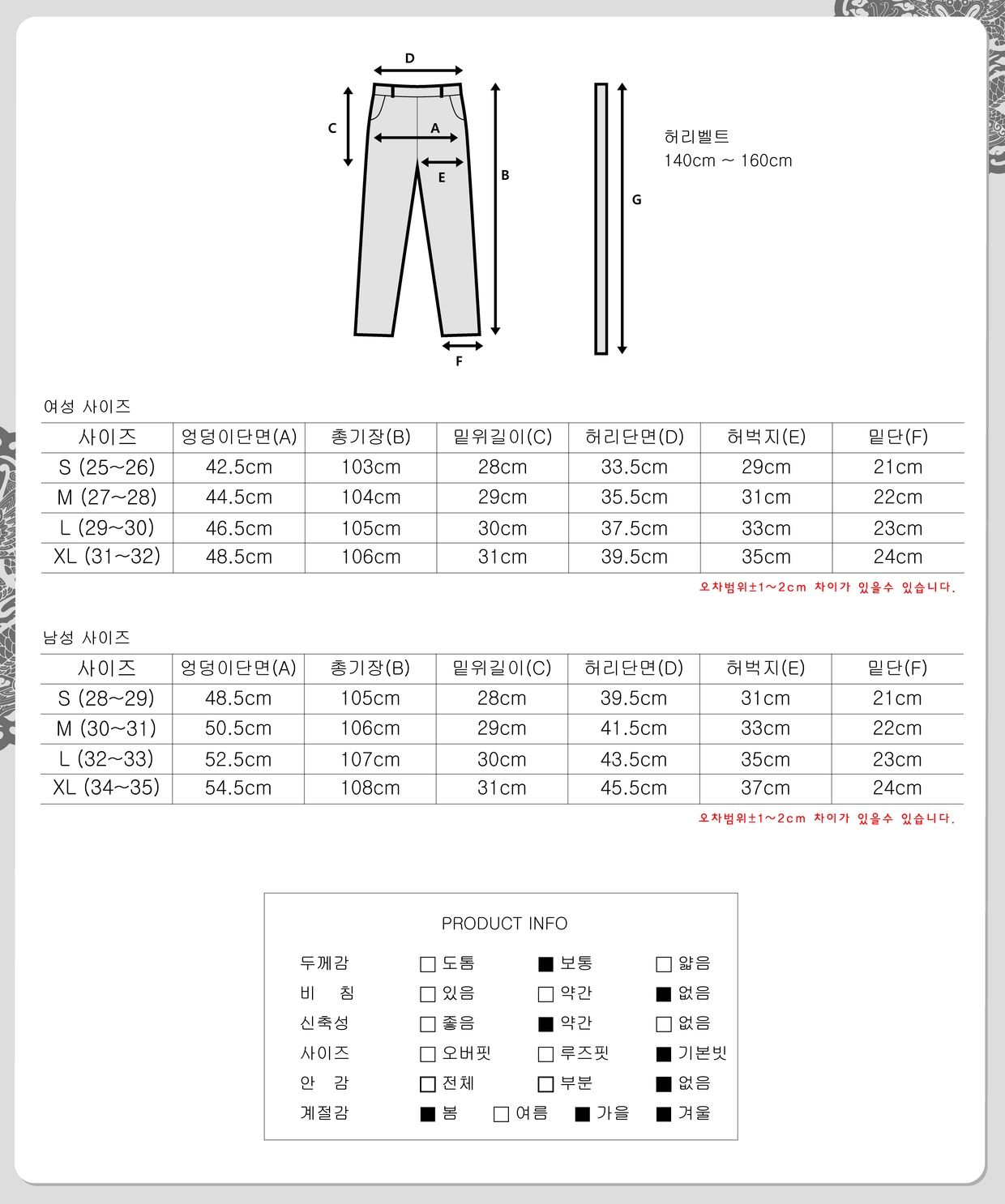 하의 : 여성 S (25~26), M (27~28), L (29~30), XL (31~32)