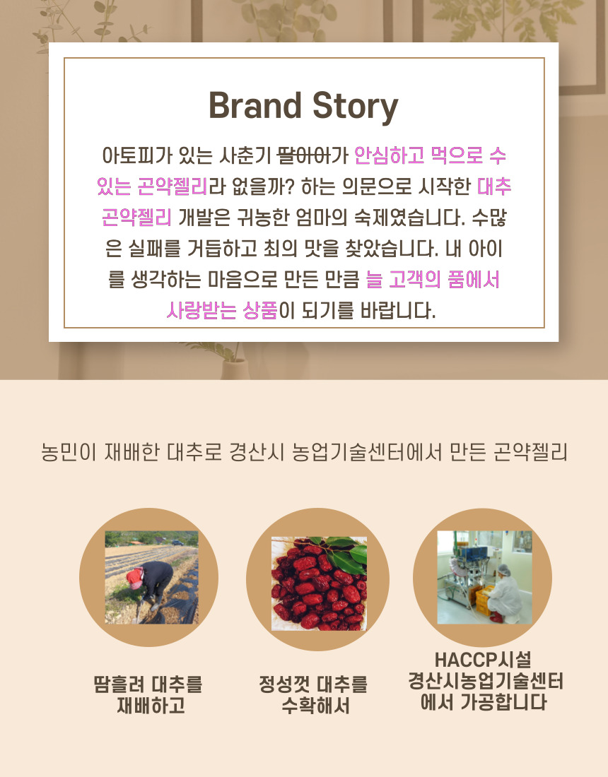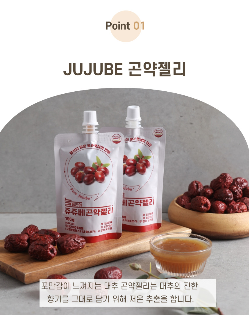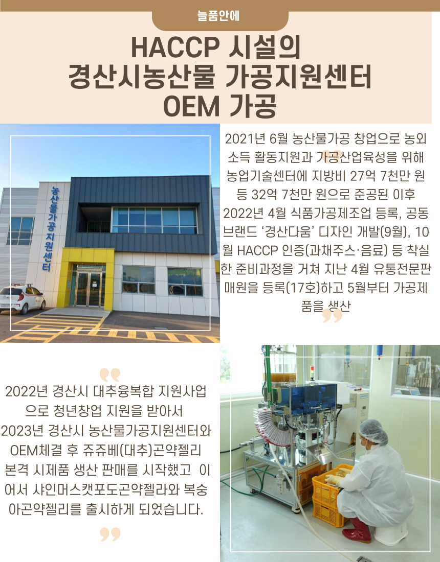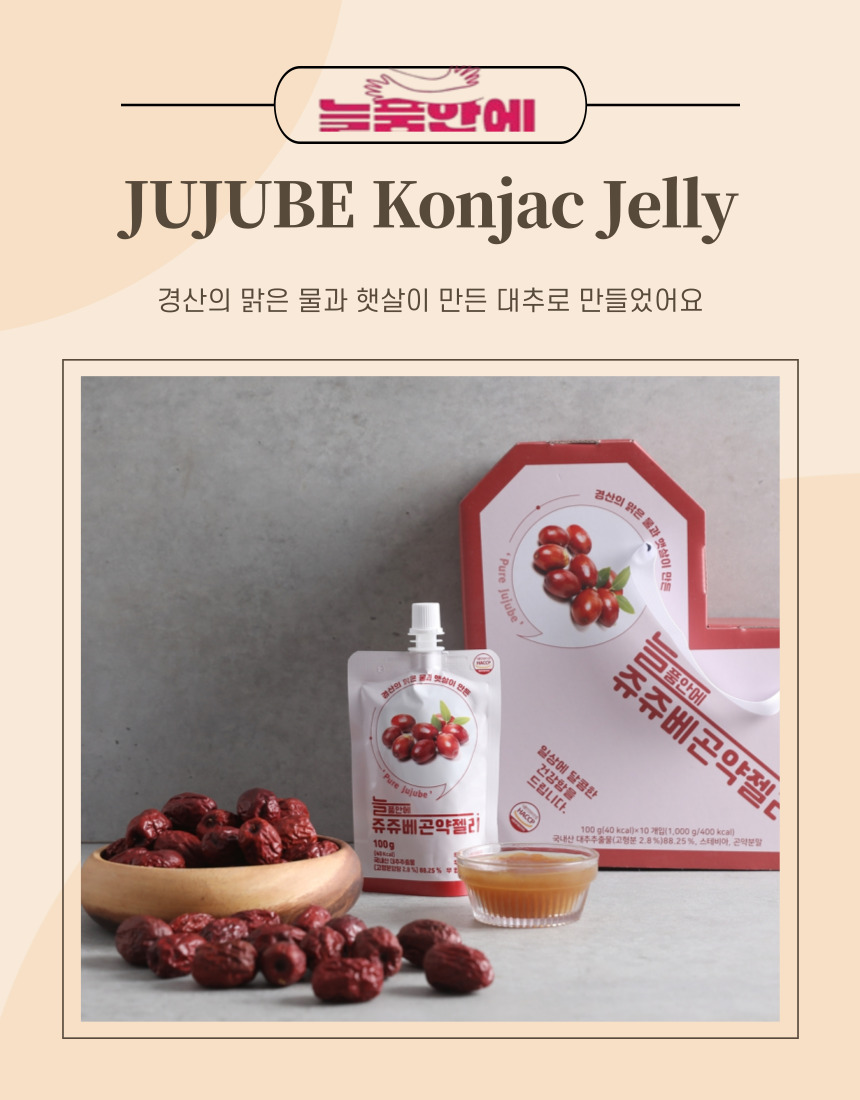 경산은 특산물이 대추로 "경산대추융복합사업단"의 지원사업에 선정되어 "쥬쥬베곤약젤리" 시제품을  생산하게되었습니다.