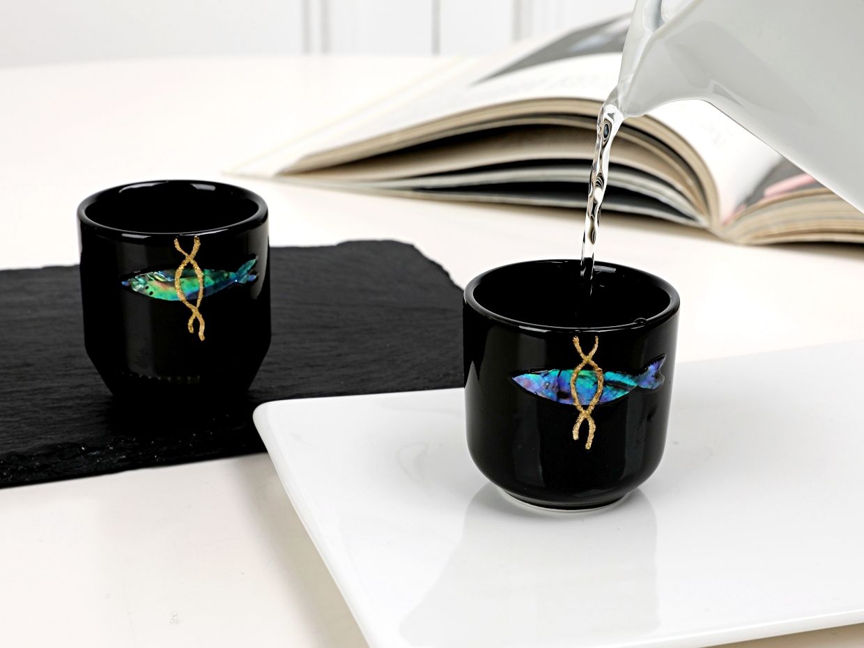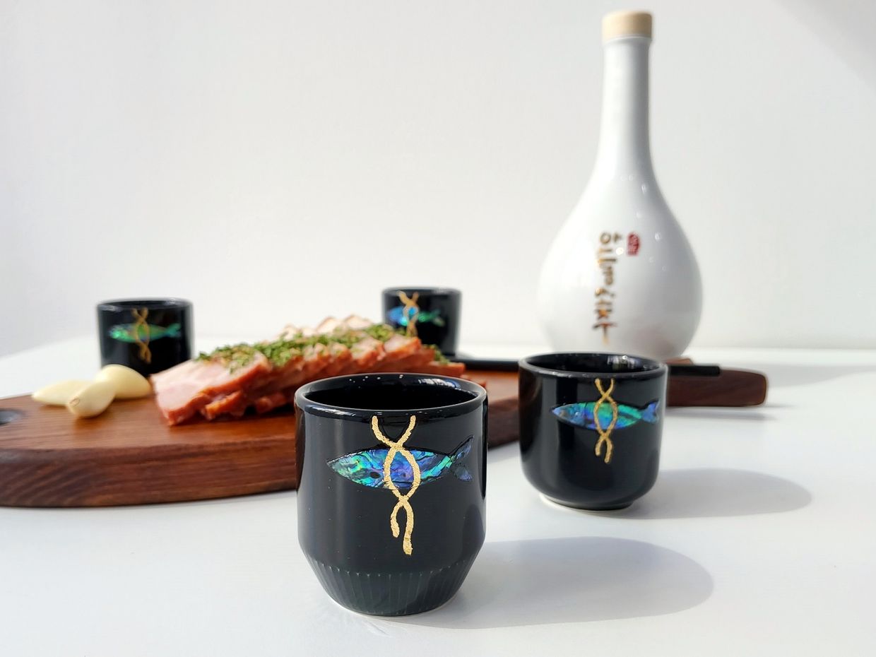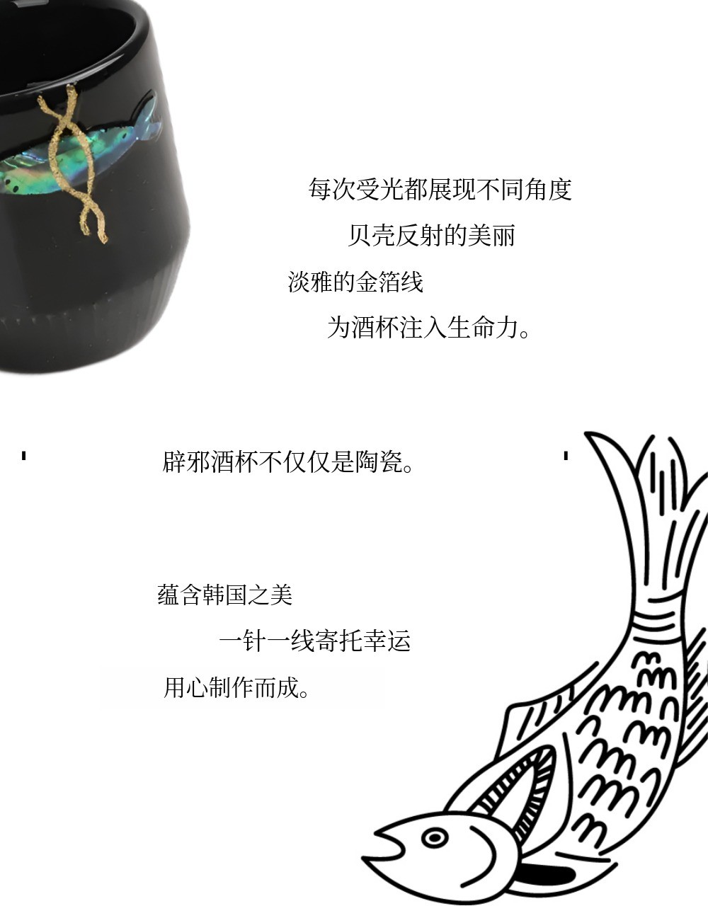 我们的螺钿酒杯不仅仅是‘单纯漂亮的酒杯’。EVEJE的螺钿酒杯会在你身边,成为阻挡厄运、守护福气的坚强守护神,这是我们的期望。因此,闪耀的螺钿与精致的金箔丝绸线中融入了‘明太鱼驱邪’的元素,精心设计而成
