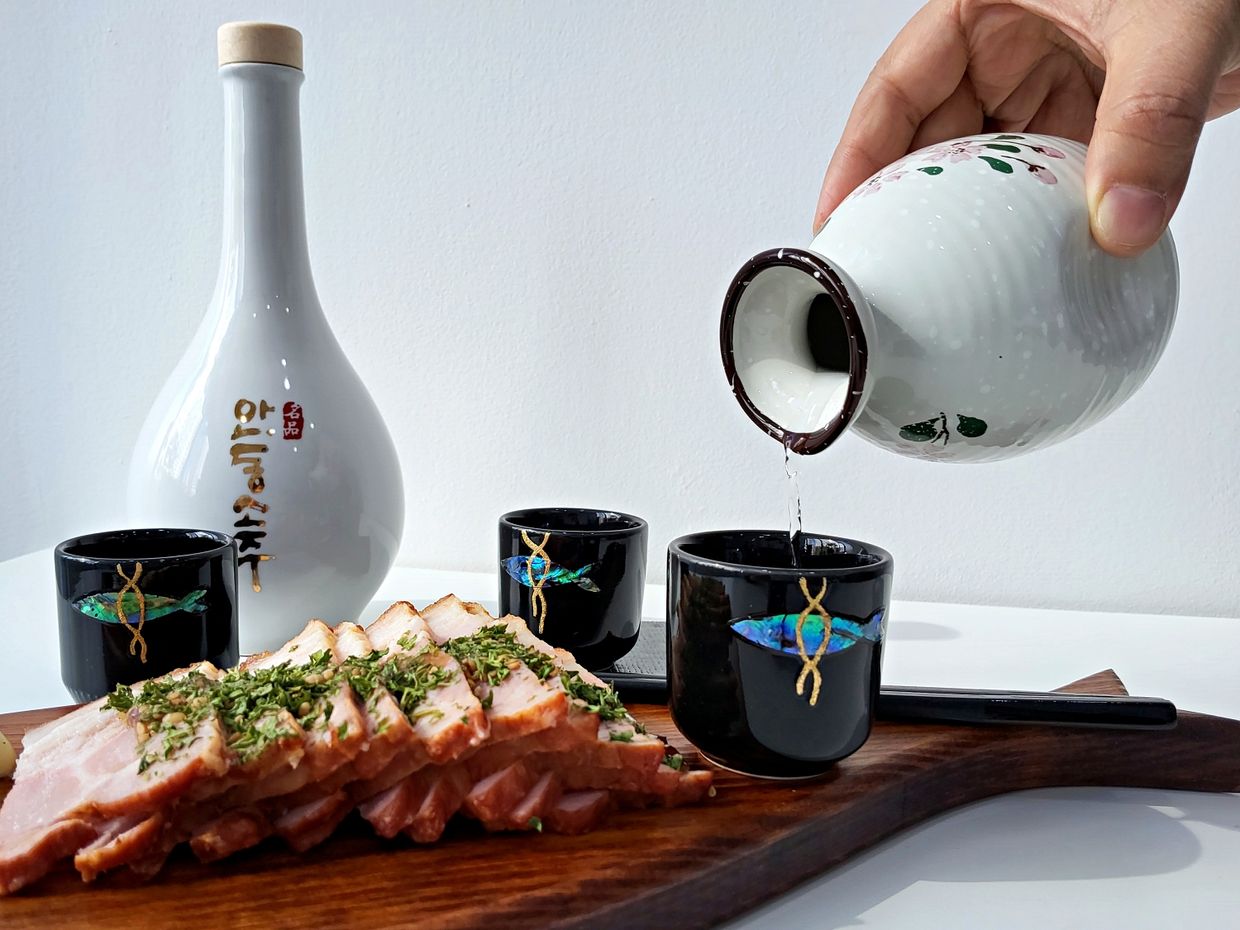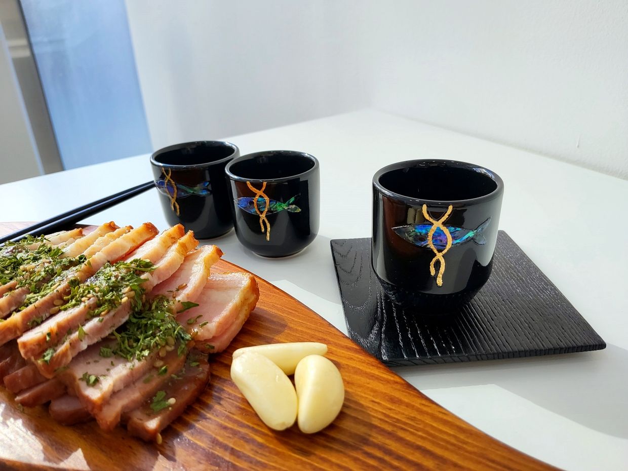 作家为韩国传统螺钿漆器的美注入了现代灵感。每一个酒杯都充分展现了深厚的传统美与创新设计精神。