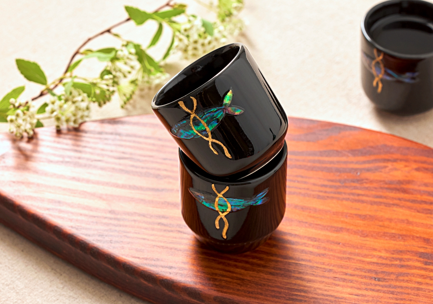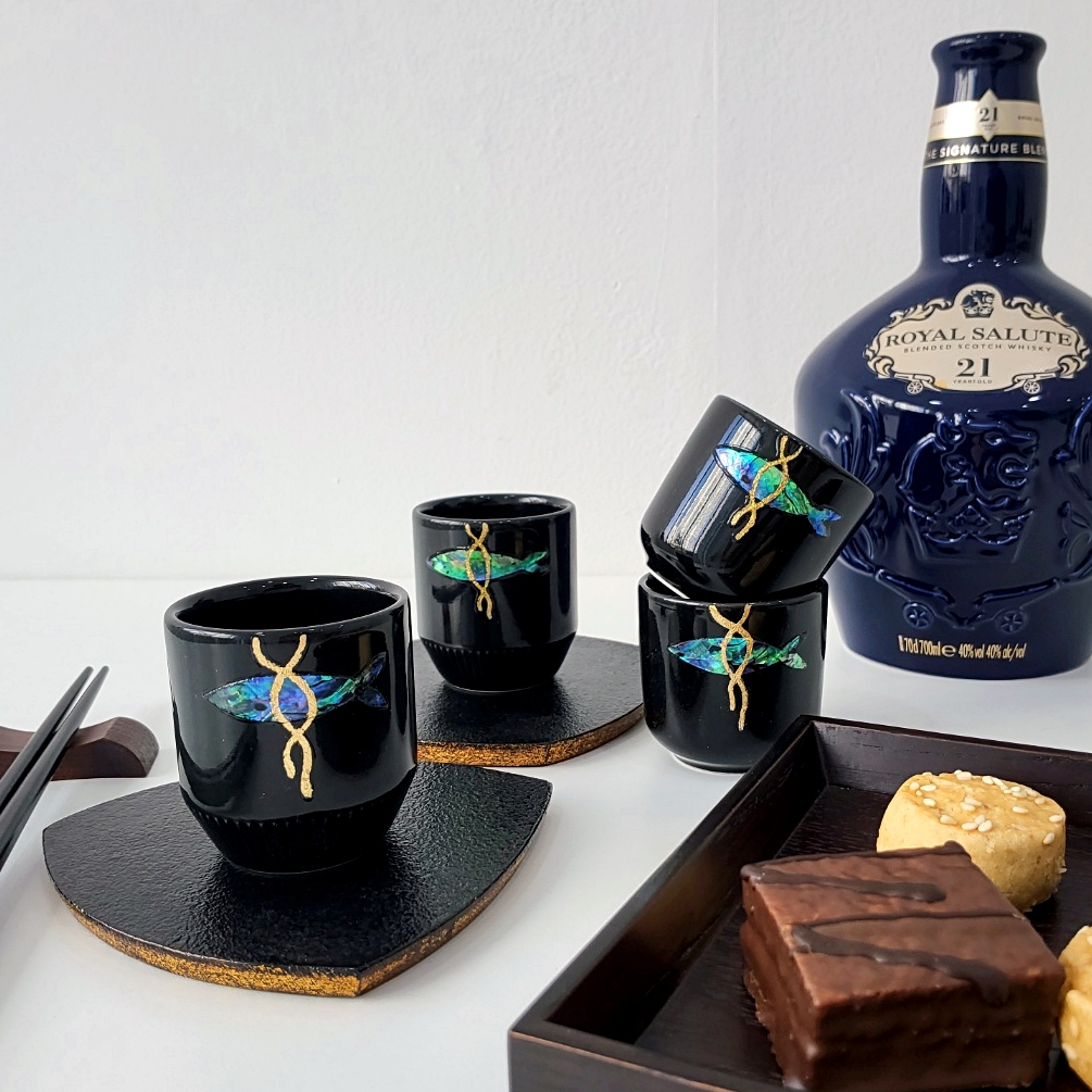 为了回报大家的关注,并让我们的传统工艺更加贴近现代人的生活, 我们开始了新的挑战。‘是否能在每天相遇的小瞬间也融入传统的深邃之美?’经过无数思考后,我们决定将绚丽的螺钿光彩融入日常最熟悉的物品之一——酒杯中。