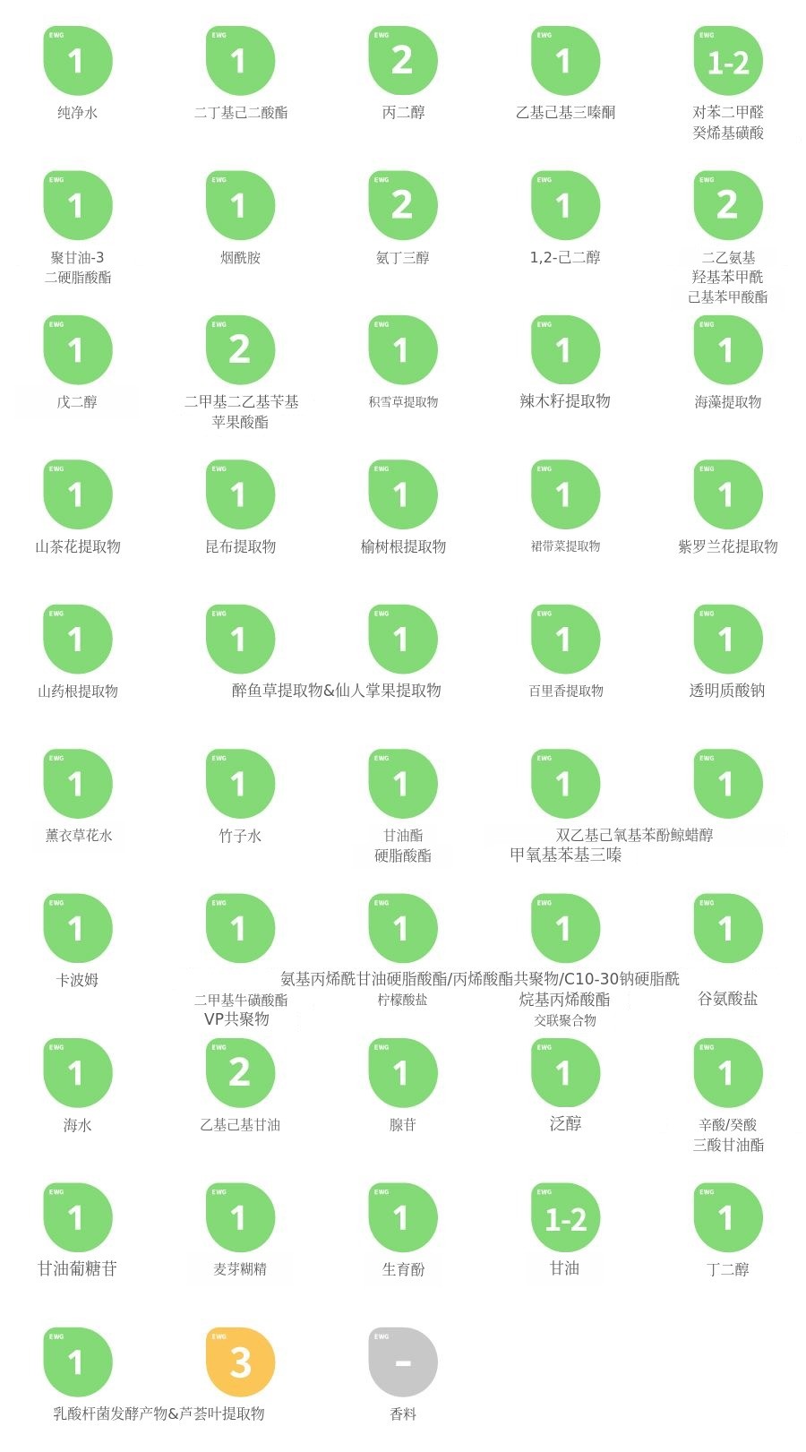 - 芦荟叶提取物在镇静肌肤方面不可或缺,因此以EWG一般等级添加。