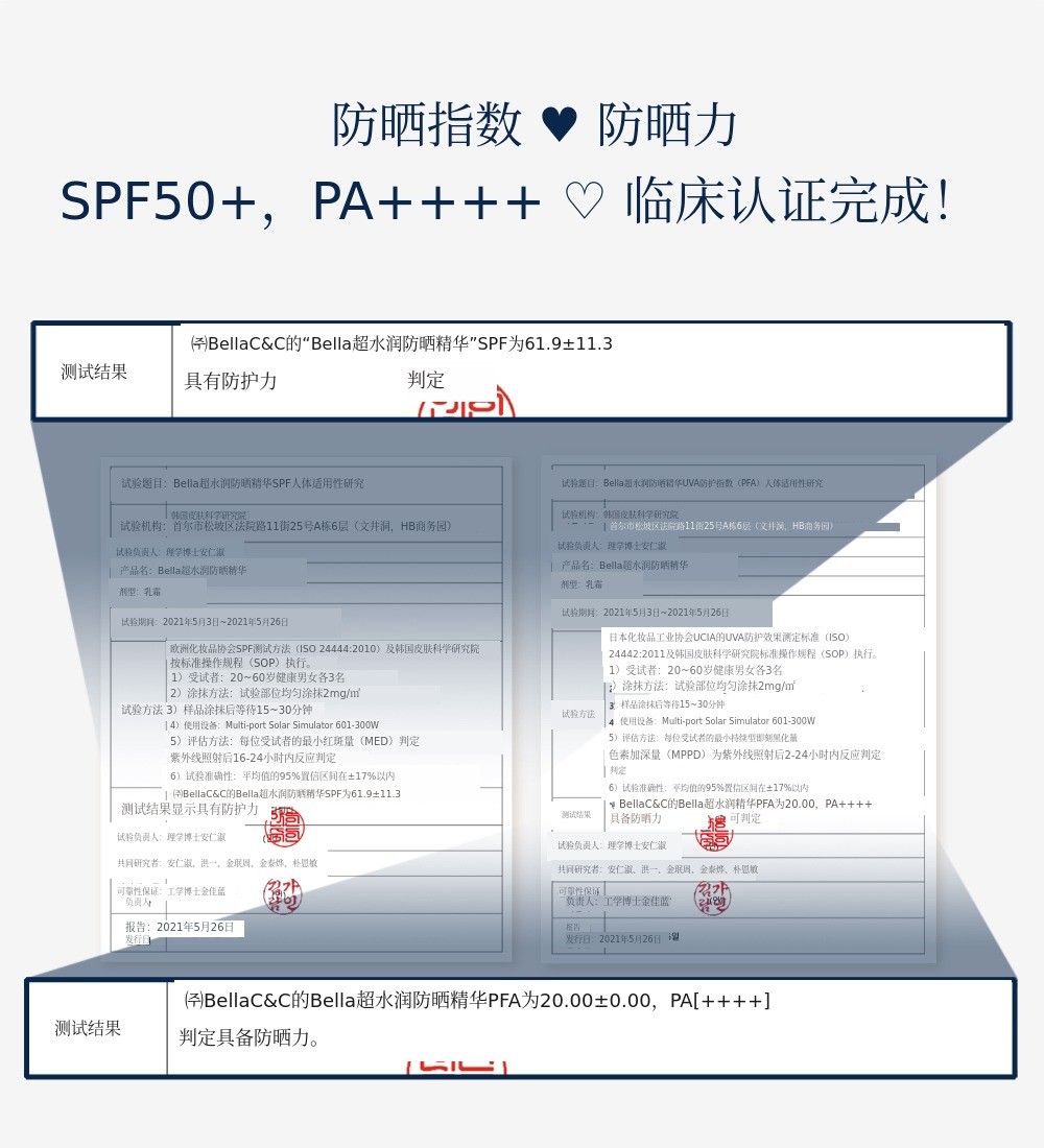 最近关于紫外线防护指数有一些争议吧?Bella Vegan Water防晒精华在产品上市的同时,迅速申请了临床检测,确实确认了紫外线防护效果。我们收到了认证临床机构出具的结果报告,确认SPF50+、PA++++数值具备紫外线防护力。