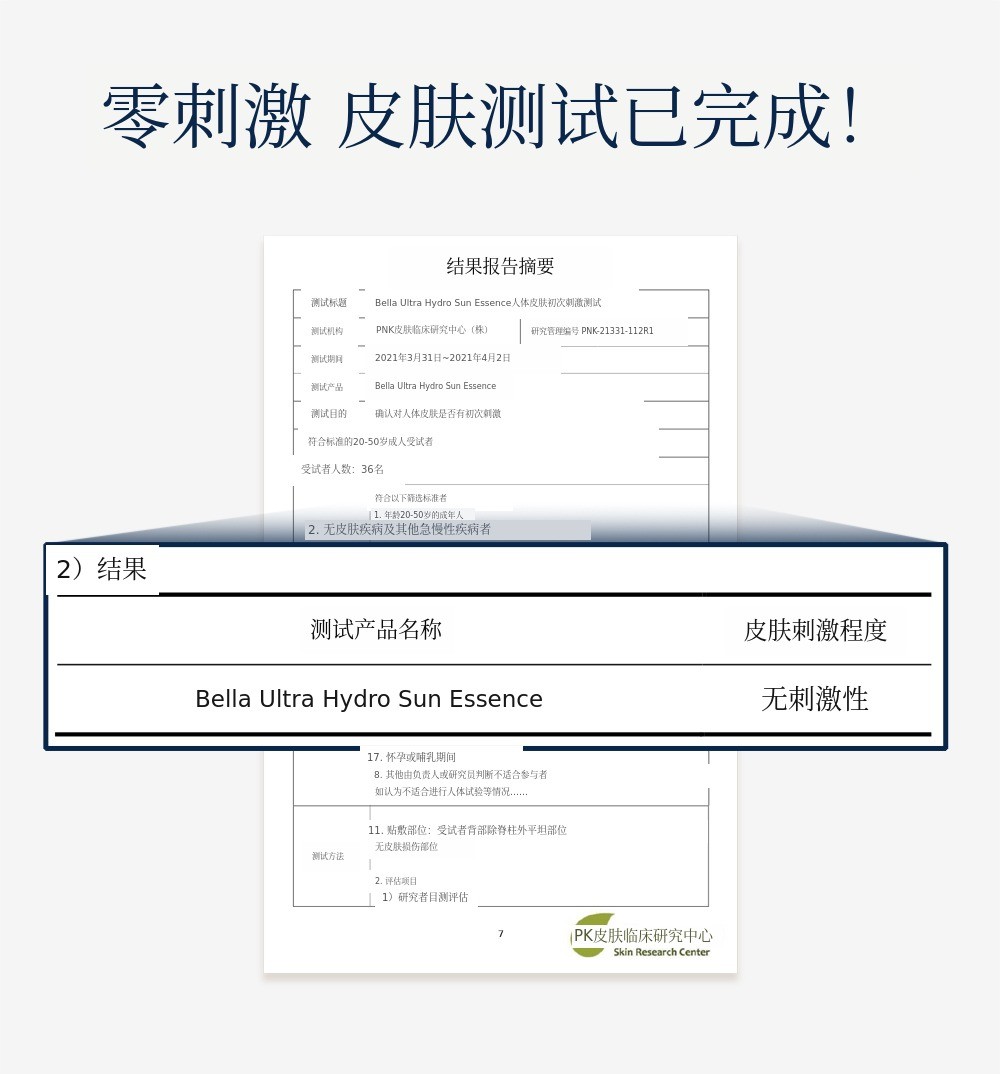 皮肤刺激方面也必须要关注吧?这一点也通过认证机构进行了临床委托,Bella防晒精华被确认对皮肤无刺激性。