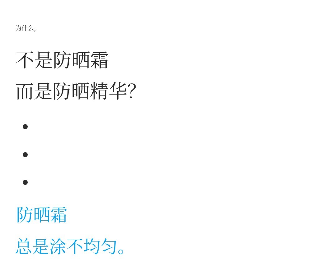 涂防晒霜后手掌变白,黏黏的……真的非常讨厌。让人忍不住想用,一次又一次涂抹也毫无残留感,完美贴合皮肤。 我决定要这样制作产品。了解皮肤,了解皮肤的纹理,了解皮肤的时间。 我把这三点牢牢记在脑海里,制作了产品。 真正的化妆品真是神奇又令人惊叹的产品。