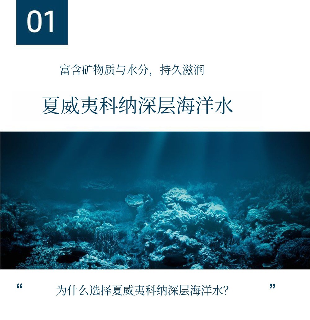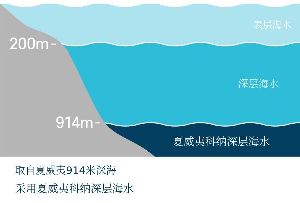 在夏威夷科纳近海取水的海洋深层水,源自远离夏威夷岛的格陵兰近海。当海水遇到格陵兰周边的冰川时,会变得浓度更高、更重,最终沉到约4000米深。 它经过大约2000年的时间,从大西洋流向印度洋、太平洋近海。这些水在地球自转作用或与海底山脉碰撞时会上升,夏威夷岛科纳前海从海底看是约5000米高的巨大山脉地带,因此是经过2000年熟成的水涌出的最佳地区。