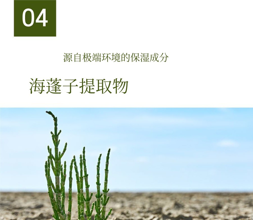即使在地中海或大西洋附近盐分较高的海岸边,也能不失去水分而生存的顽强植物,Salicornia(海蓬子) 所提取的原料。海蓬子生长在海水流通良好、土地较为坚实的潮滩上,因吸收海水中的盐分而生长,被称为咸草, 据说是地球上几乎唯一能吸收盐分生长的陆生植物,富含天然矿物质、氨基酸等营养成分, 因此是对保湿非常有效的成分。