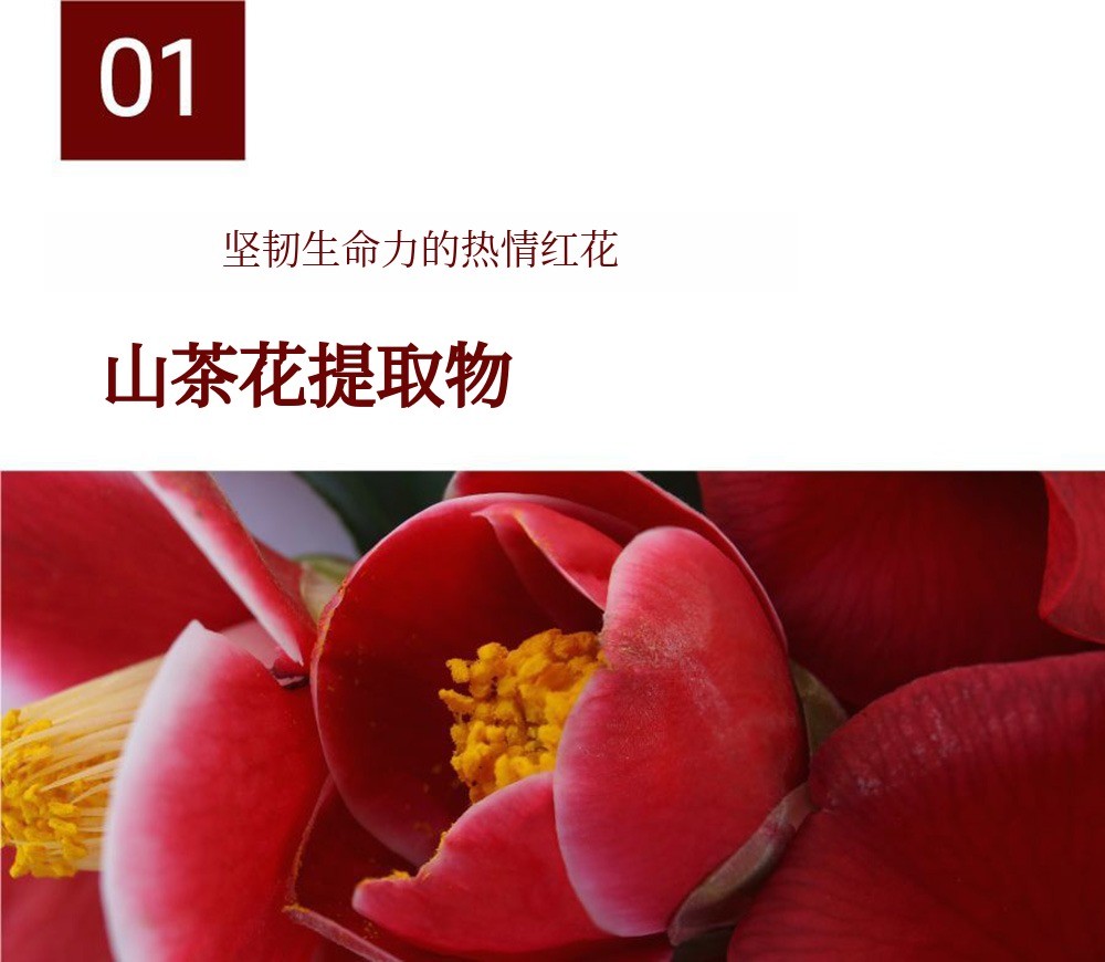 山茶花提取物中含有大量茶中常见的儿茶素 这种成分。儿茶素是一种叫做表没食子儿茶素没食子酸酯的多酚成分,包括EC、EGC、ECG、EGCG等,其中EGCG占儿茶素的大约50%。它最大的功效是比维生素C高出100倍以上的效果,据说如此。含有维生素K、维生素C成分,为敏感和疲惫的肌肤提供丰富营养,使肌肤光滑紧致。