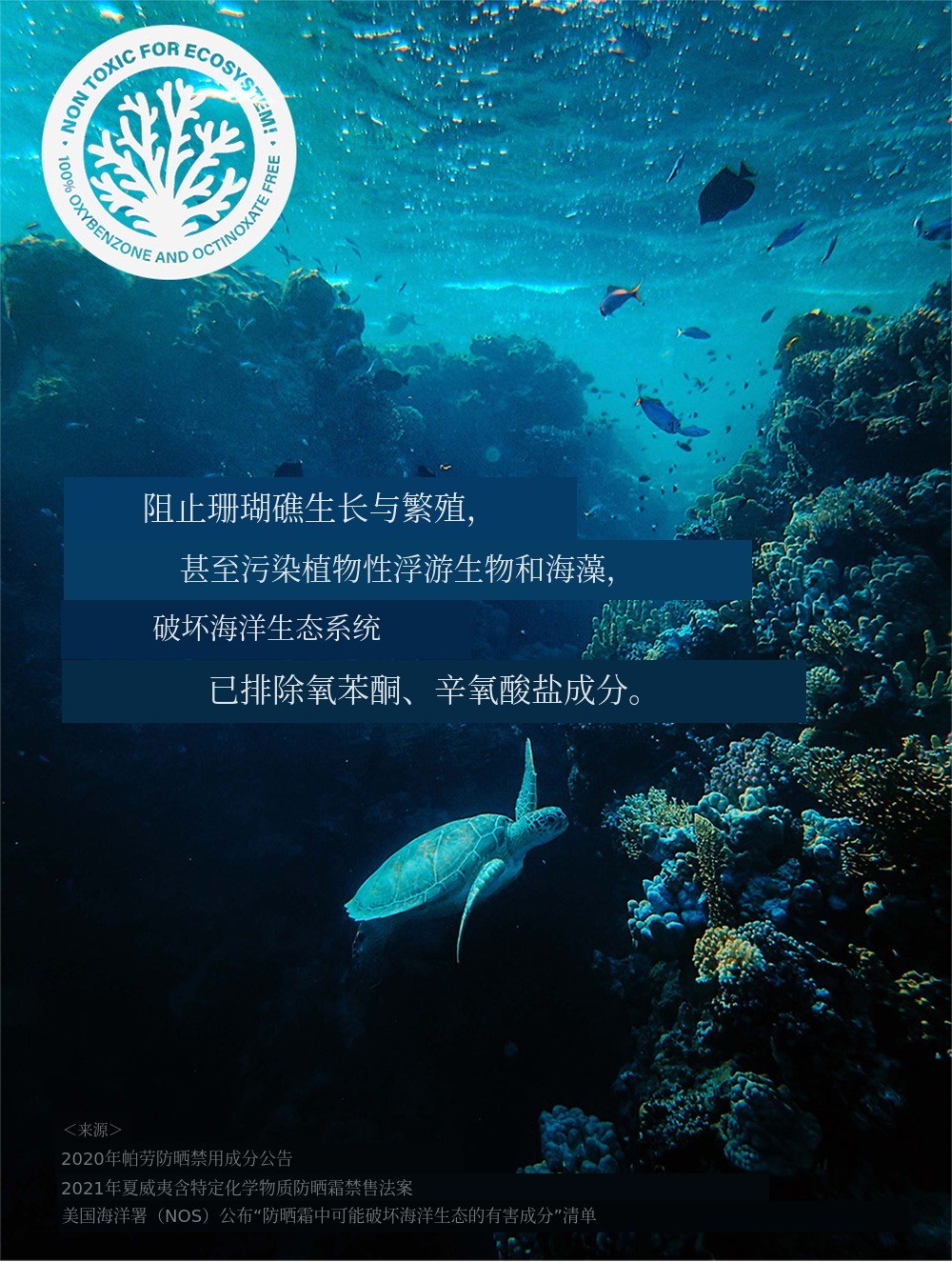 氧苯酮会导致海底珊瑚礁变白的白化现象和DNA损伤,从而阻碍正常的生长和繁殖。此外,辛氧酸酯会激活珊瑚礁的有害病毒,最终导致珊瑚礁灭绝,据说如此,因此连植物性浮游生物和海藻类也会被污染,所以我真的觉得一定要避免这些成分!