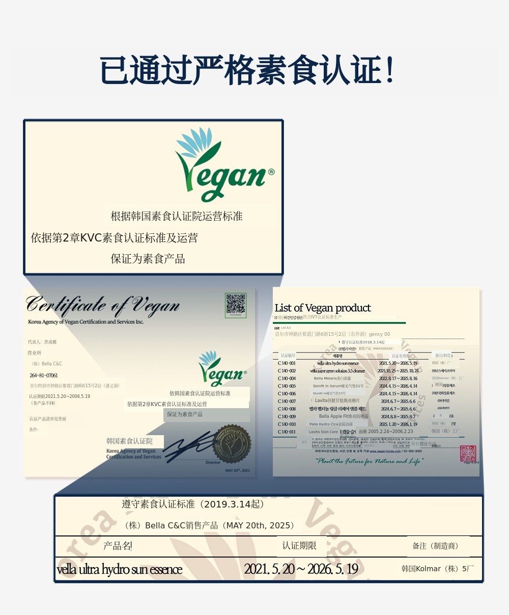 从产品开发阶段就坚持纯素化妆品。以纯素配方为基础开发。经过数月的资料审核,从韩国纯素认证院获得了认证书,正式获得了纯素 标志。