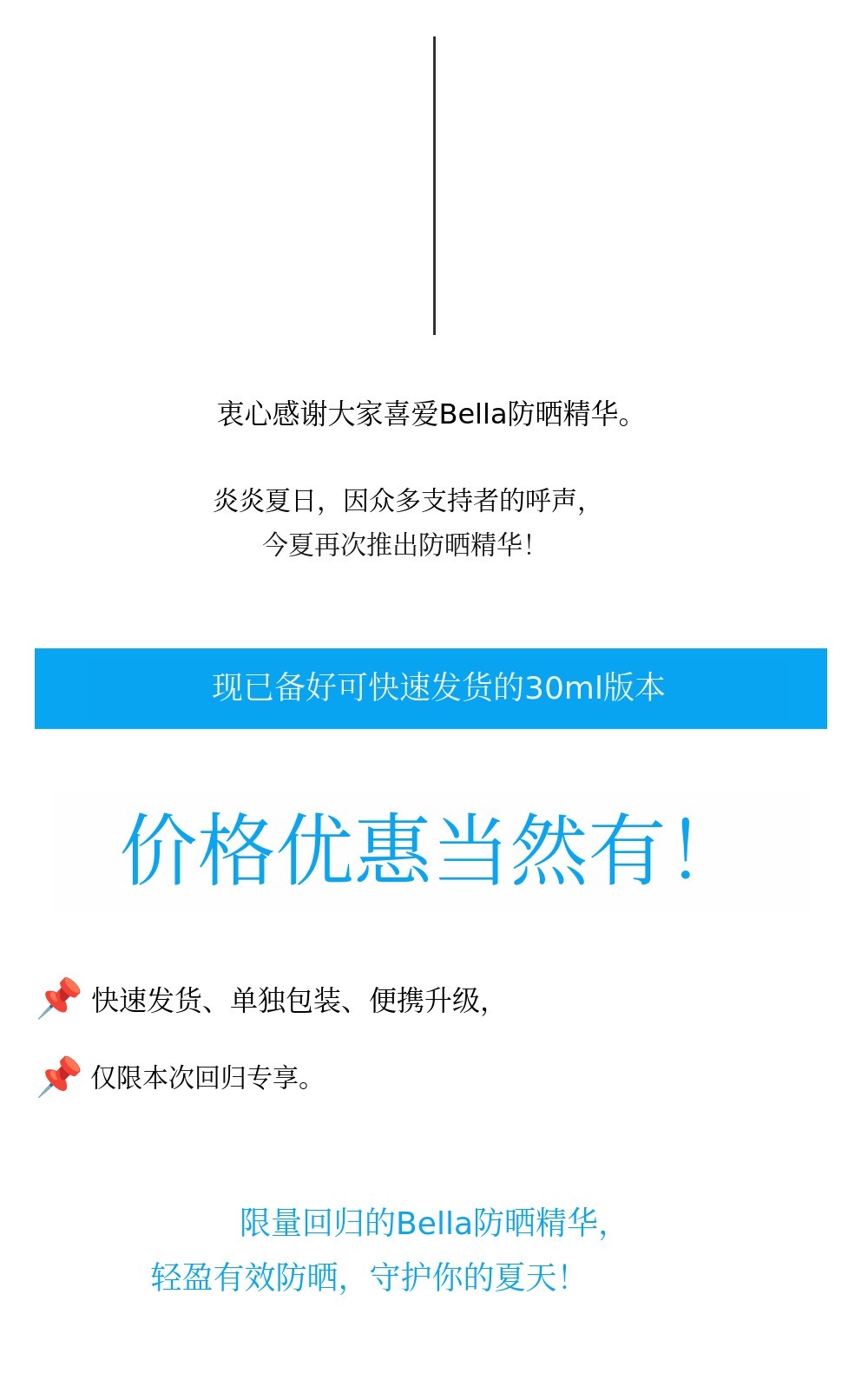 非常感谢您的满意、喜爱和支持,希望您在使用Vella防晒时,拥有健康的皮肤和健康的日常生活。 Vella并不满足于现状,现在也在不断研发健康的化妆品。我们会不断努力,让支持者们的宝贵选择成为不会后悔的品牌。
