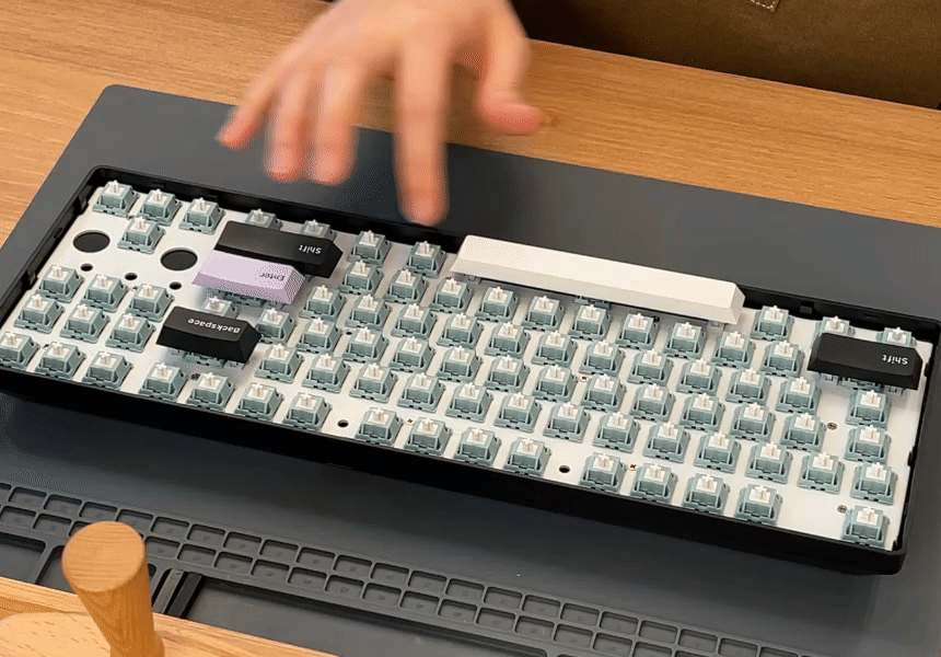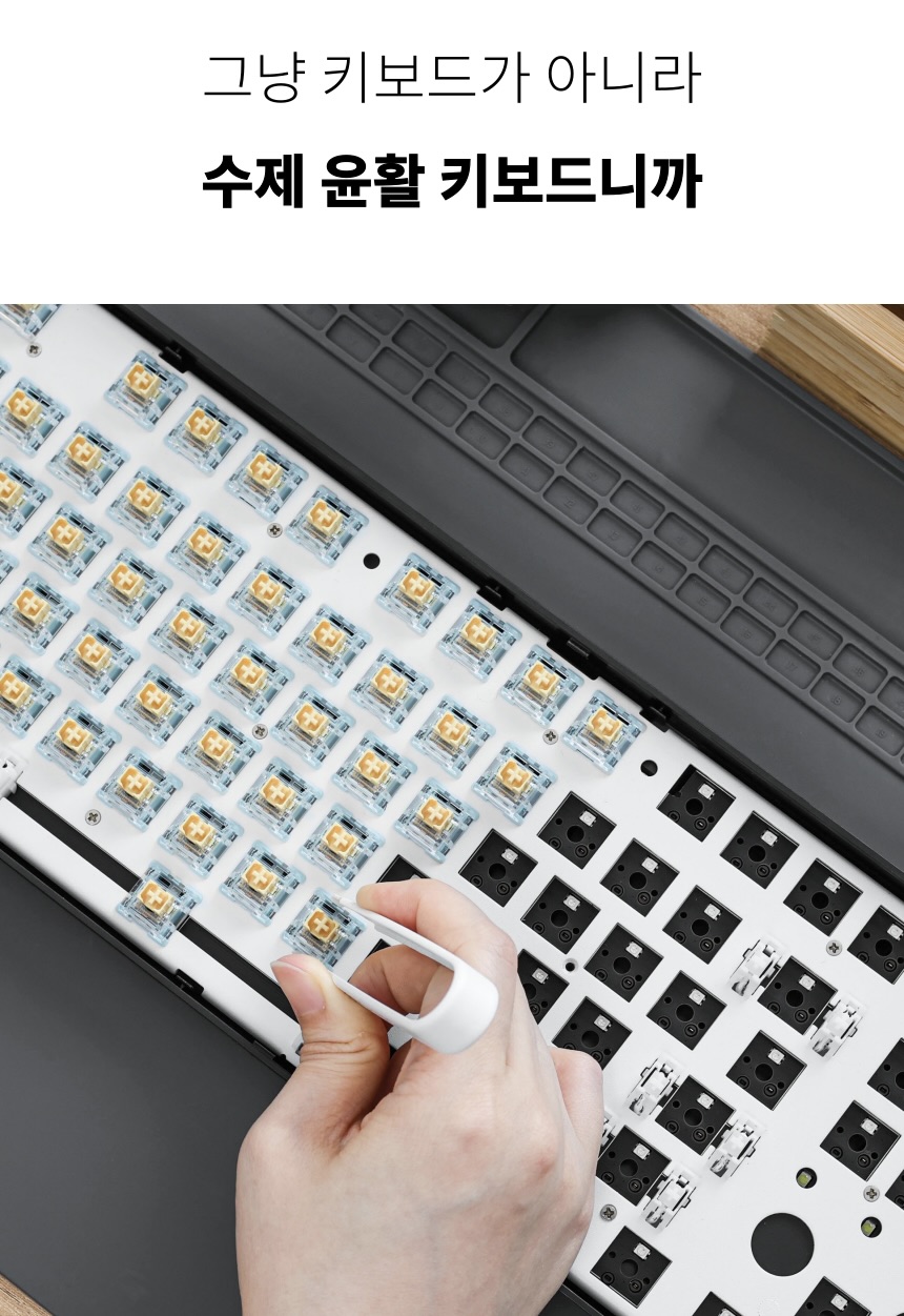 - 네, 커스텀 작업은 어렵긴 하지만, 핫스왑 기판이기 때문에 원하시는 스위치가 있다면 별도 납땜 없이 손쉽게 교체가 가능합니다! 단순한 축 변경 정도는 초보자 분들도 부담 없이 시도해보실 수 있어요 :)