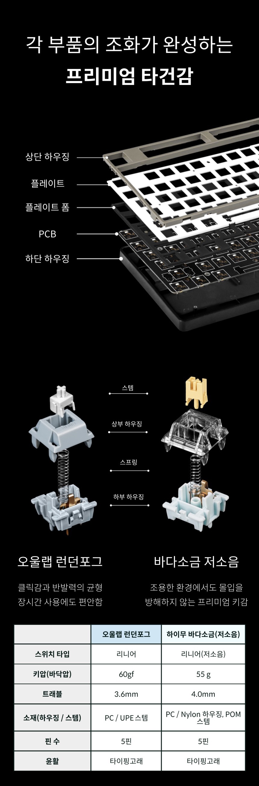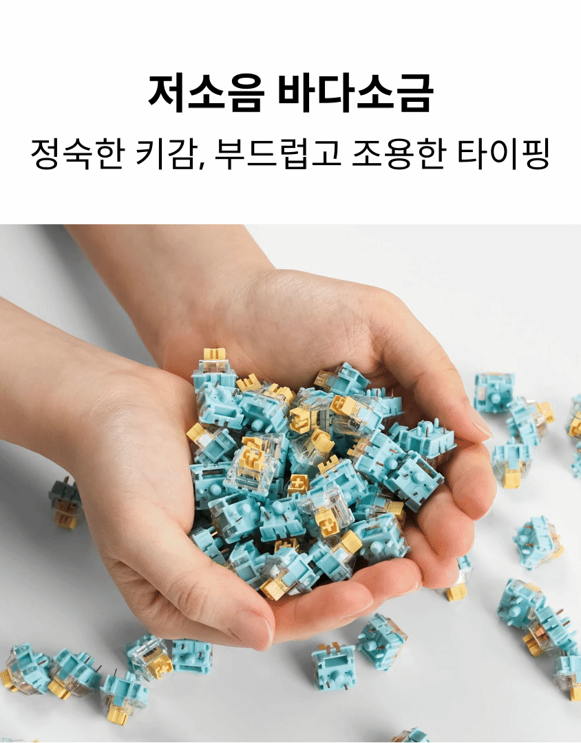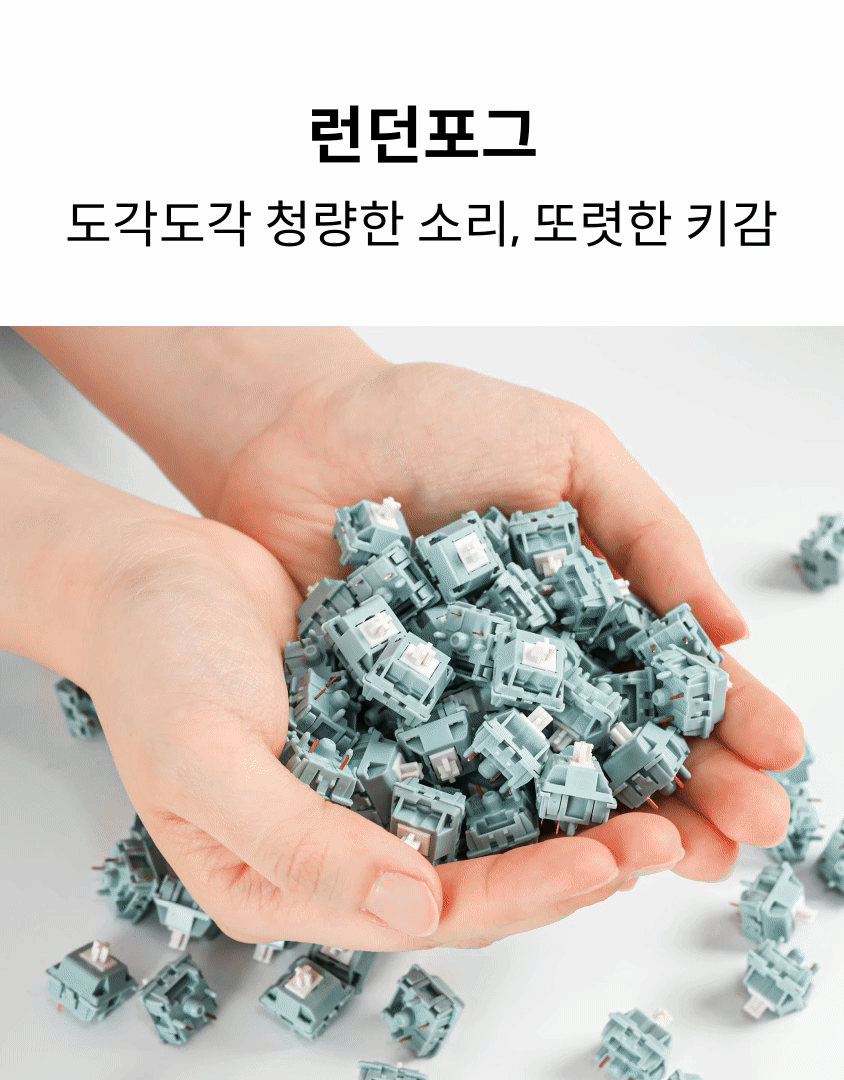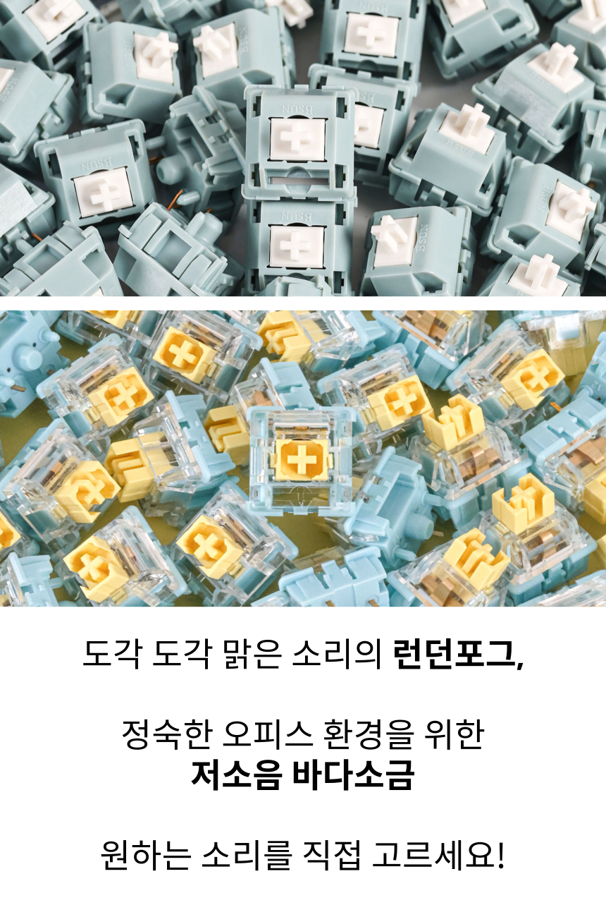 - ‘런던포그’ 축은 부드러운 키감과 함께 조약돌 튀는 듯한 청량한 타건음을 즐기실 수 있습니다. 반면 ‘저소음 바다소금’ 축은 소음을 최대한 줄여, 조용한 환경에서도 부담 없이 사용할 수 있는 저소음 스위치입니다. 두 축 모두 직장인도 부담 없이 사용할 수 있는 부드러운 키감을 갖추고 있어, 개인 취향이나 사용 환경에 따라 선택하시면 좋습니다