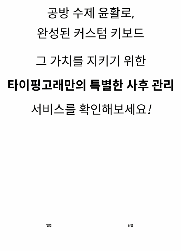 - 타이핑고래 수제 윤활은 영구 유지 됩니다. 다만, 사용 환경이나 타건 습관에 따라 1~2년 정도 지나면 재윤활이 필요할 수도 있어요. 타건감이 뻣뻣해졌거나 소리가 달라졌다고 느껴지면 아래 큐알을 찍으신 후 톡톡으로 상담 주세요! 타이핑고래는 5년간 사후관리 보증이 포함되어 있어서, 기간 내에는 언제든지 점검 및 재윤활 안내 도와드립니다