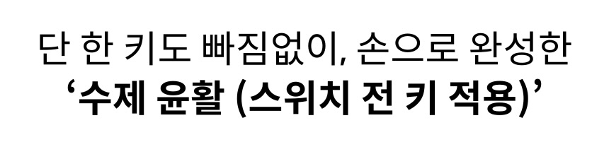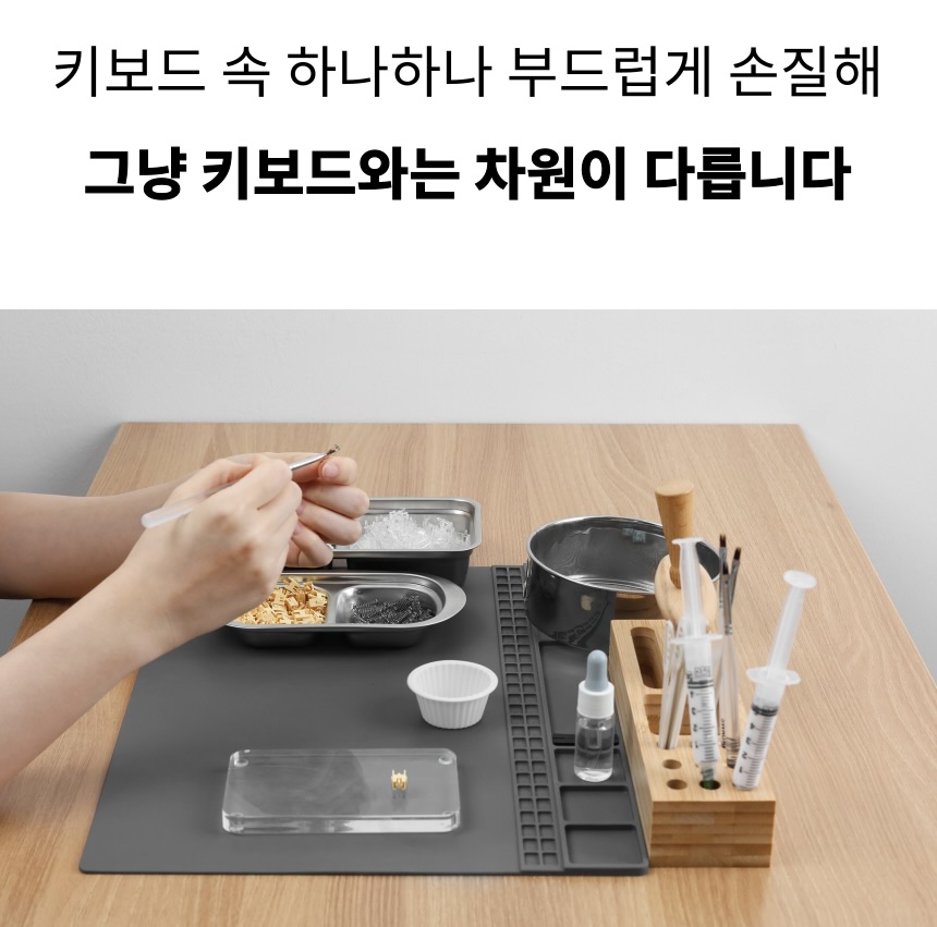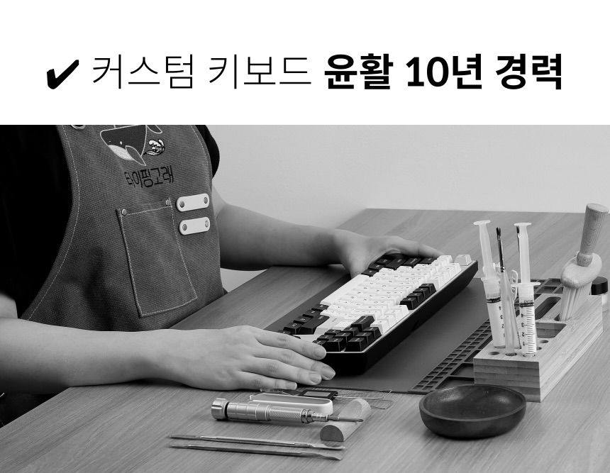 - 수제 윤활은 단순히 기름칠하는 작업이 아니라, 키보드 하나하나의 특성과 컨디션을 파악해 최적의 상태로 만들어주는 정밀 작업입니다. 공장에서 일괄 처리된 윤활과는 달리, 직접 손으로 확인하며 진행하기 때문에 소리, 키감 모두 훨씬 더 부드럽고 일관성 있게 개선됩니다