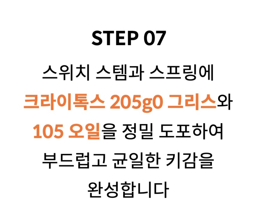 - 타이핑고래는 윤활 작업 전 과정에 정품 크라이톡스 윤활제만을 사용합니다 윤활 부위에 따라 정품 크라이톡스 XHT-BDZ, 205g2와 105 오일을 상황에 맞게 블렌딩하여 적용합니다. 수제 윤활에 최적화된 고급 윤활제로 실온 유지 시 영구 유지 됩니다! 단순히 바르는 것이 아닌, 윤활이 필요한 부위에만 정확히 도포하여 점도 밸런스를 최적화하는 것이 타이핑고래 윤활의 핵심입니다