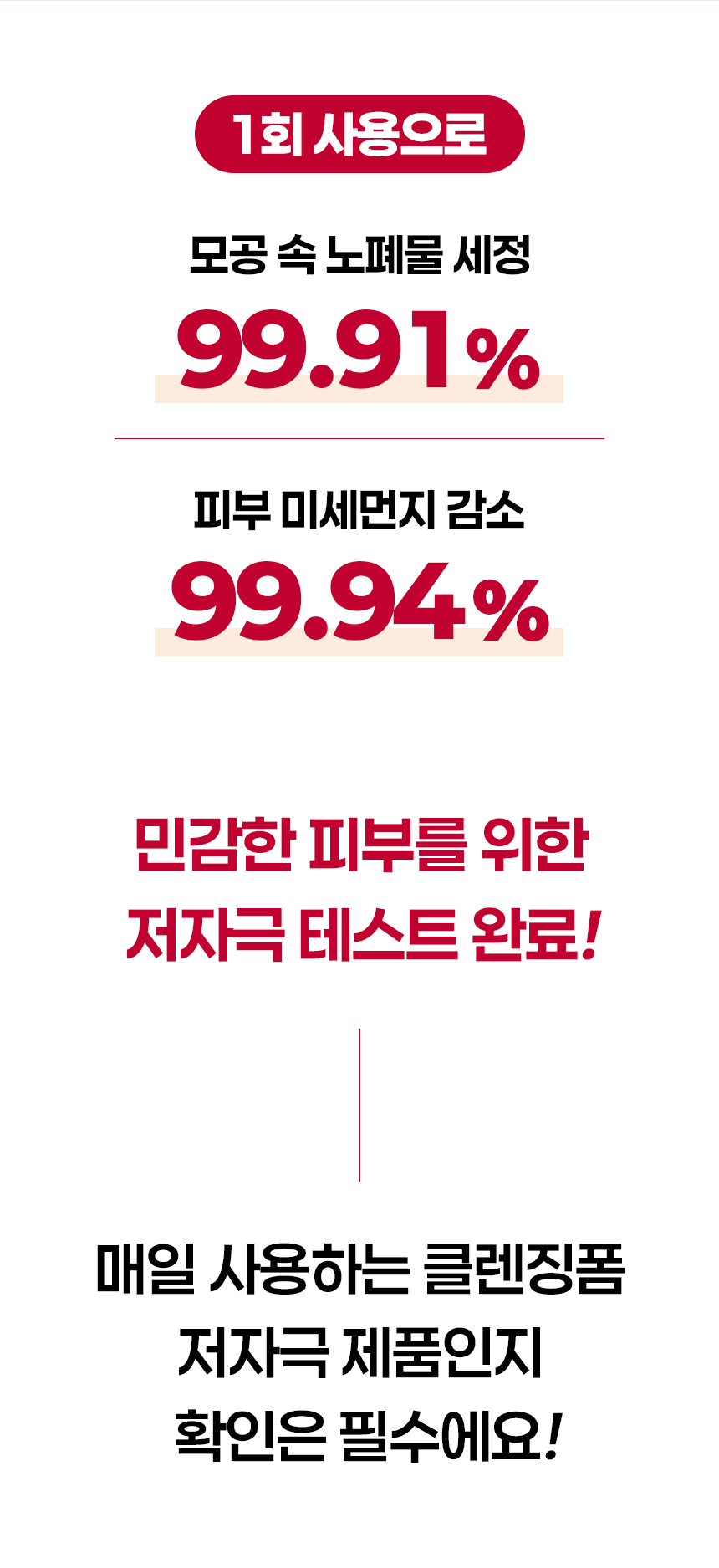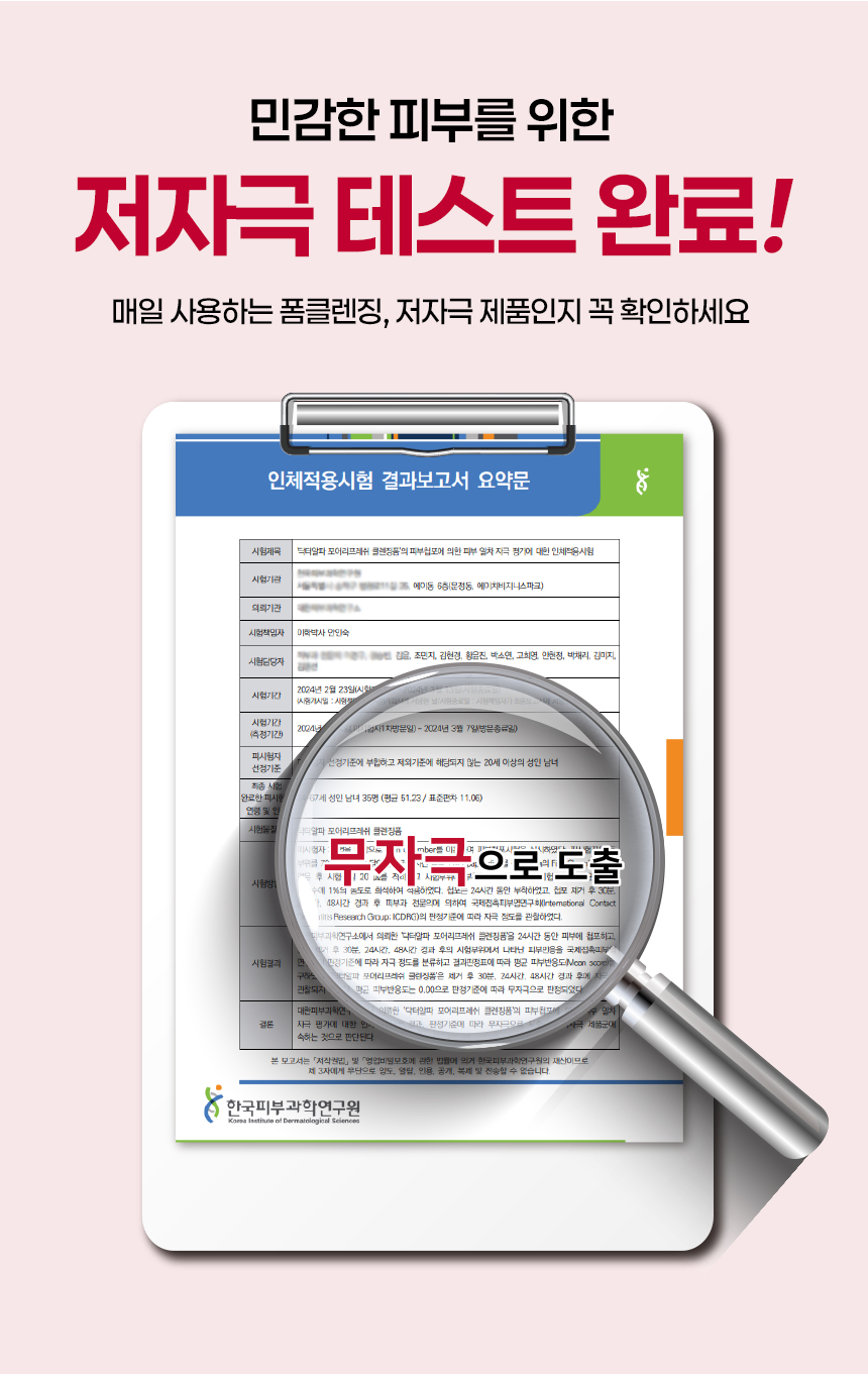 피부자극 테스트를 완료한 저자극 포뮬라로 민감성 피부도 안심하고 사용할 수 있습니다.