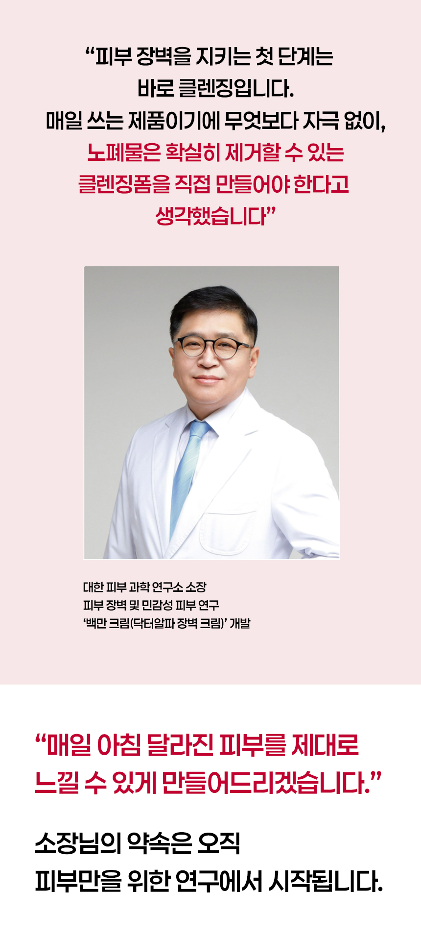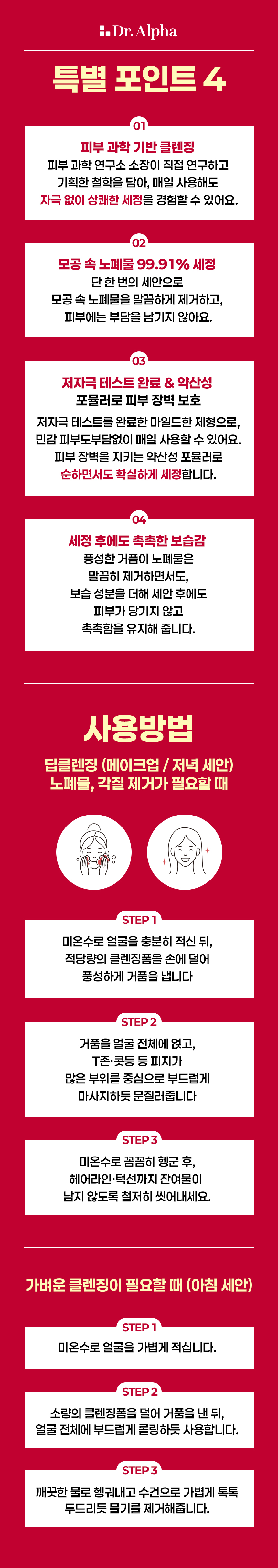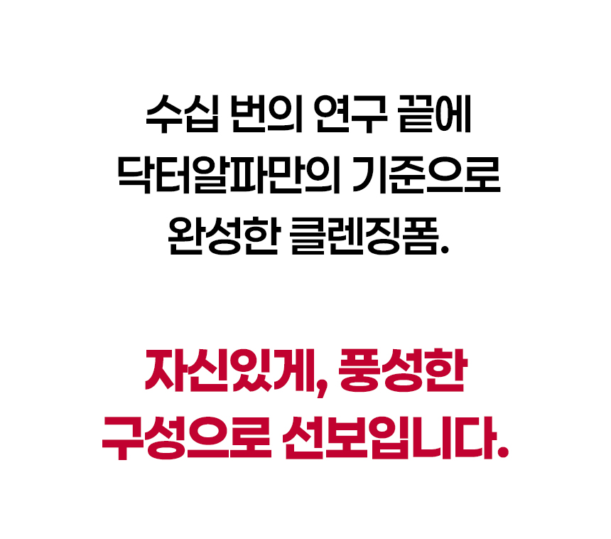한두 번 써보고 끝나는 클렌저라면 의미가 없습니다.닥터알파는 매일의 세안 습관에 맞춰 180ml 넉넉한 용량으로 담았습니다. 꾸준히 사용할 수 있는 실속형 클렌저, 바로 여기에 있습니다.