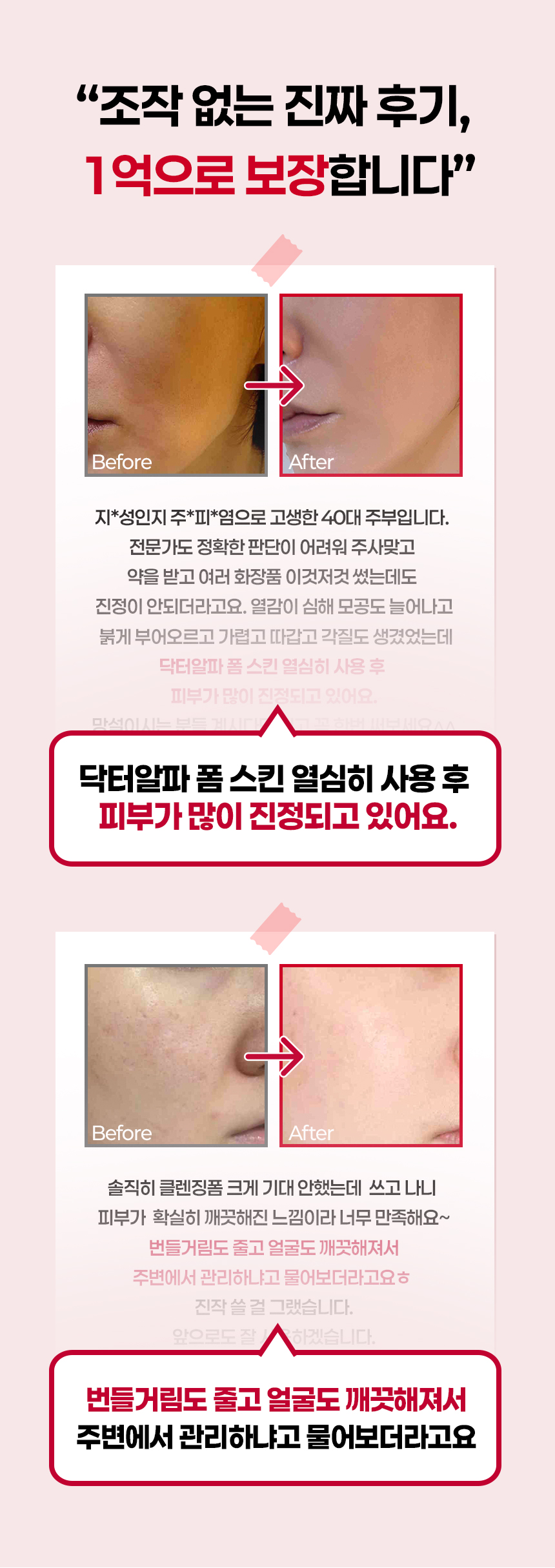 저희는 제품력에 확신이 있습니다. 그래서 후기를 조작할 필요가 없습니다. 만약 한 건의 조작이라도 발견된다면, 1억 원을 배상하겠습니다. 그만큼 저희는 고객의 진짜 경험담만을 믿습니다.