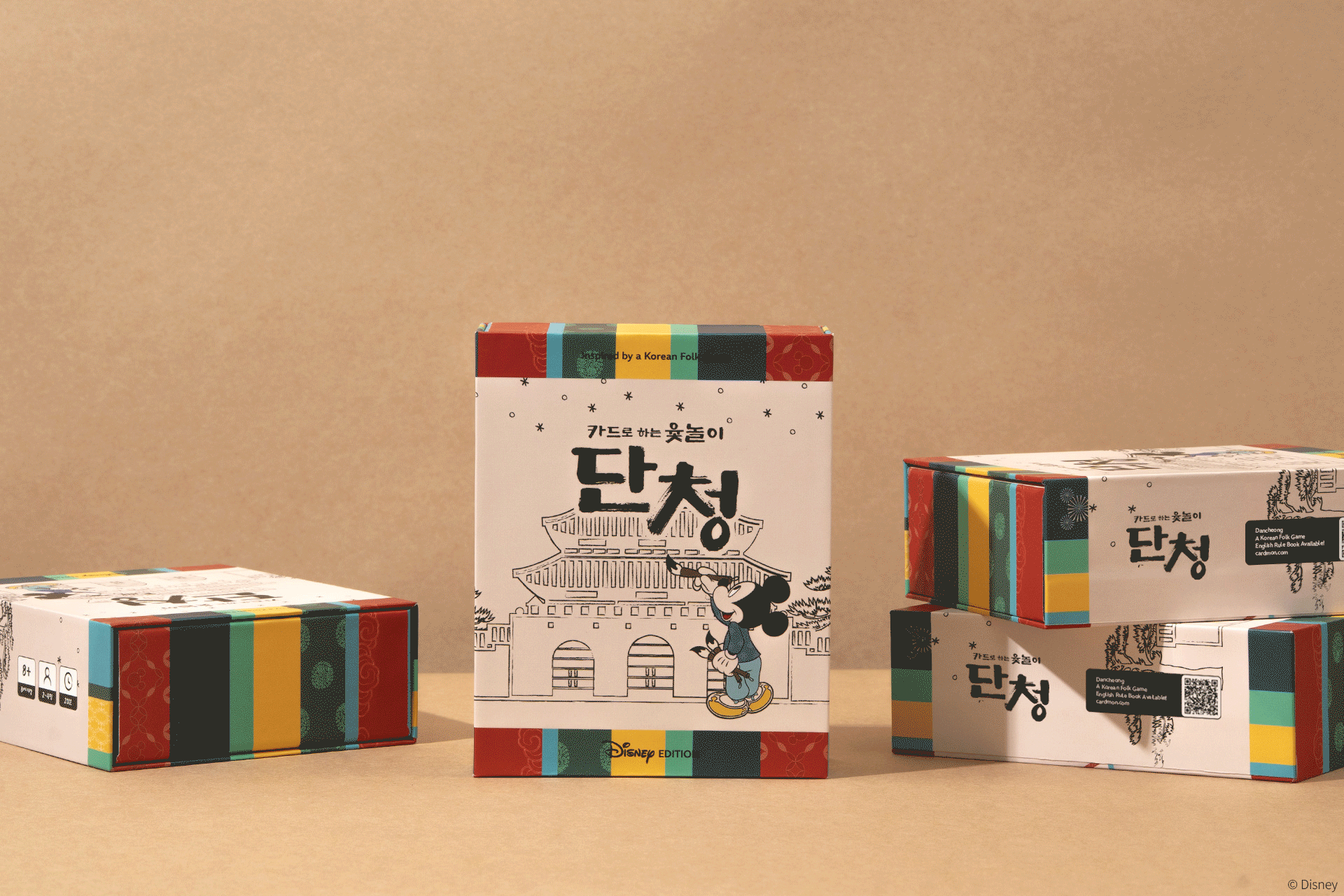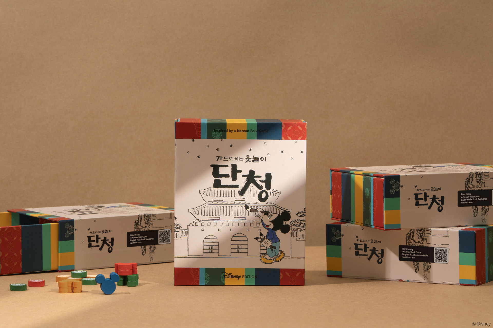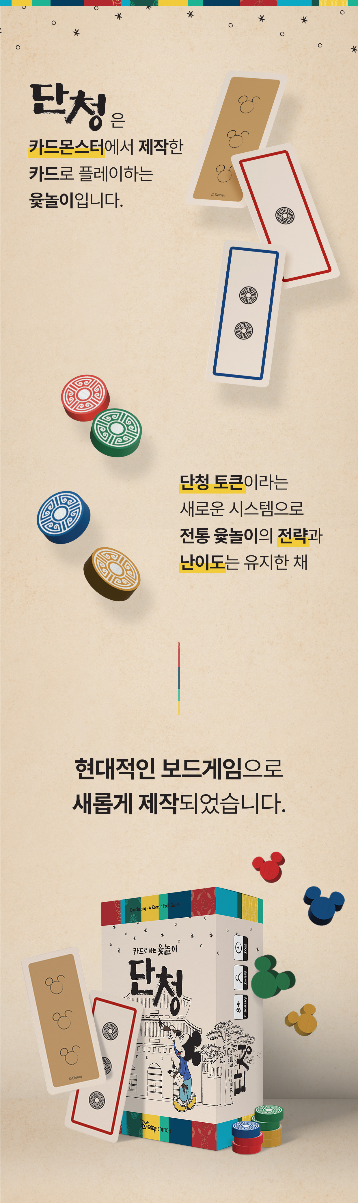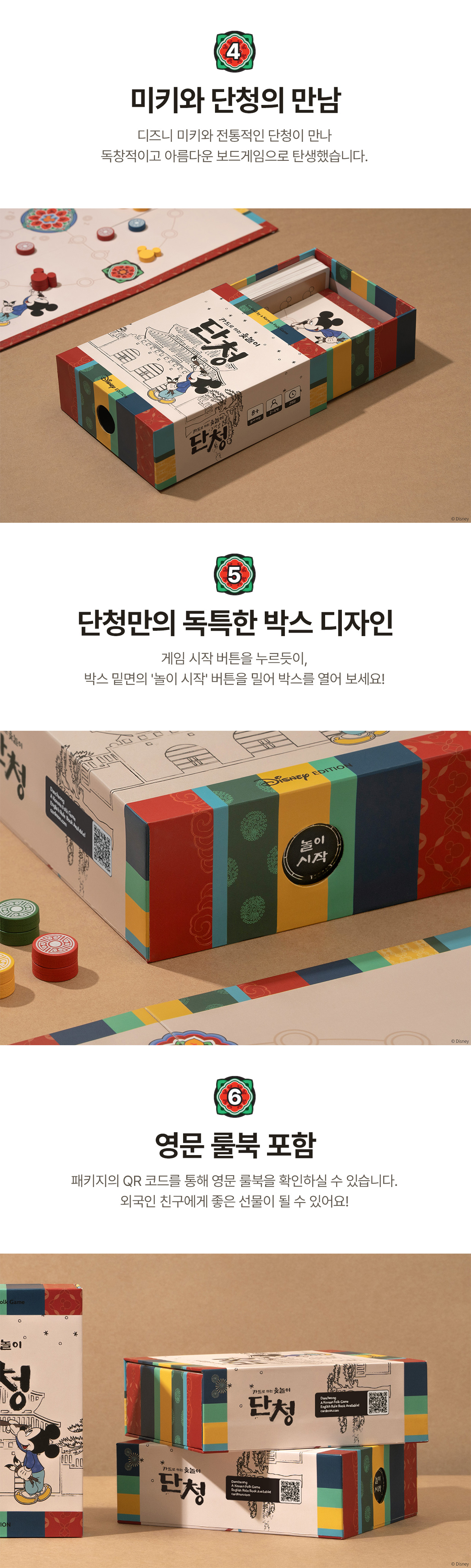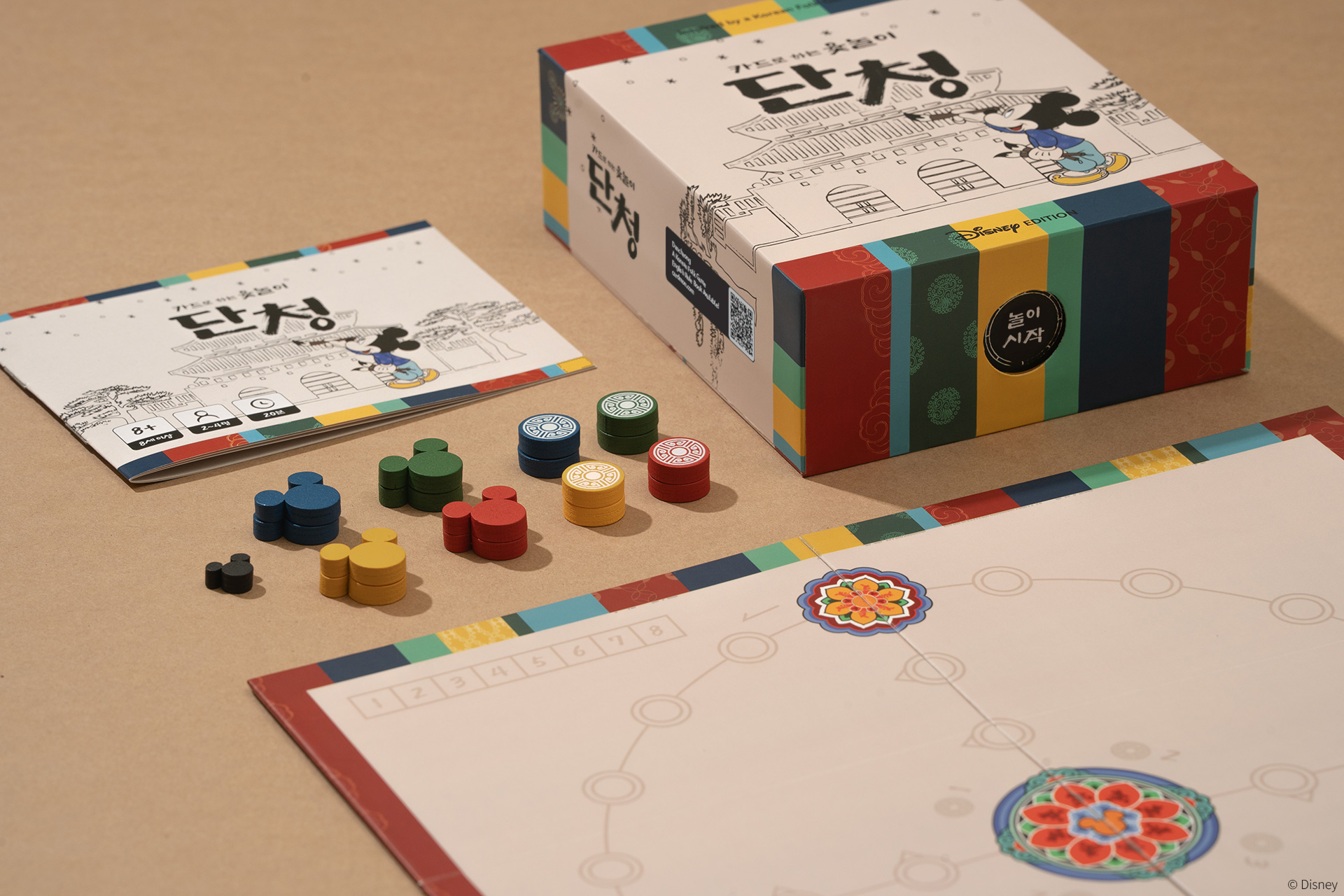 단청 디즈니 에디션은 오염 방지를 위해 수축 랩포장되어 배송됩니다. 패키지 내부는 트레이로 영역 구분이 되어 있습니다. 컴포넌트는 종류별로 지퍼백에 개별 포장, 패키지 내 카드는 비닐로 보호 포장되어 있습니다.