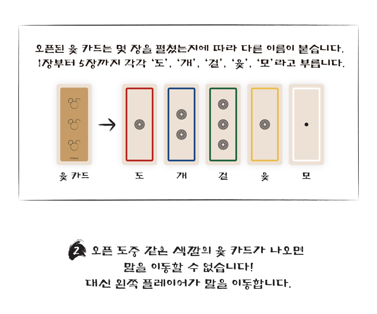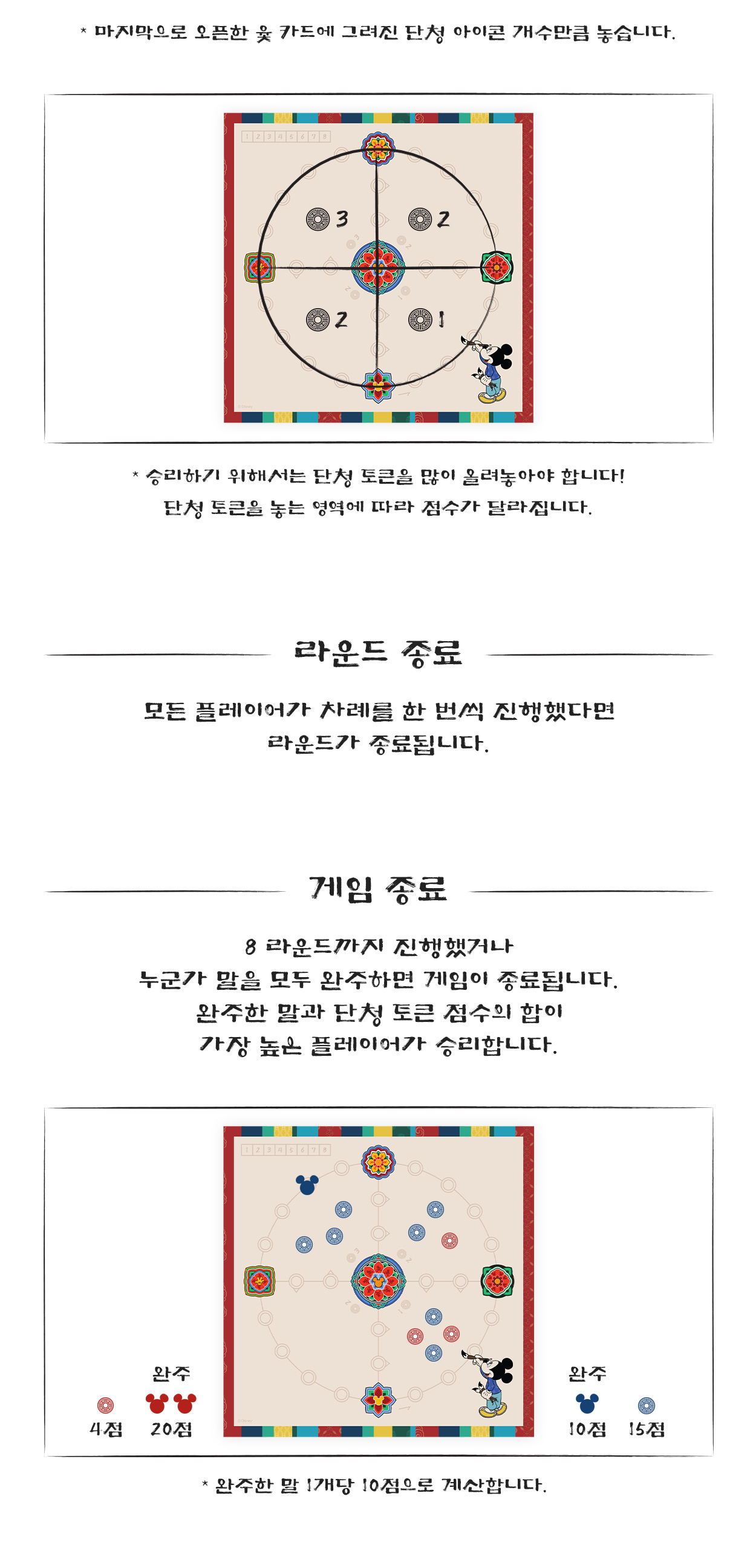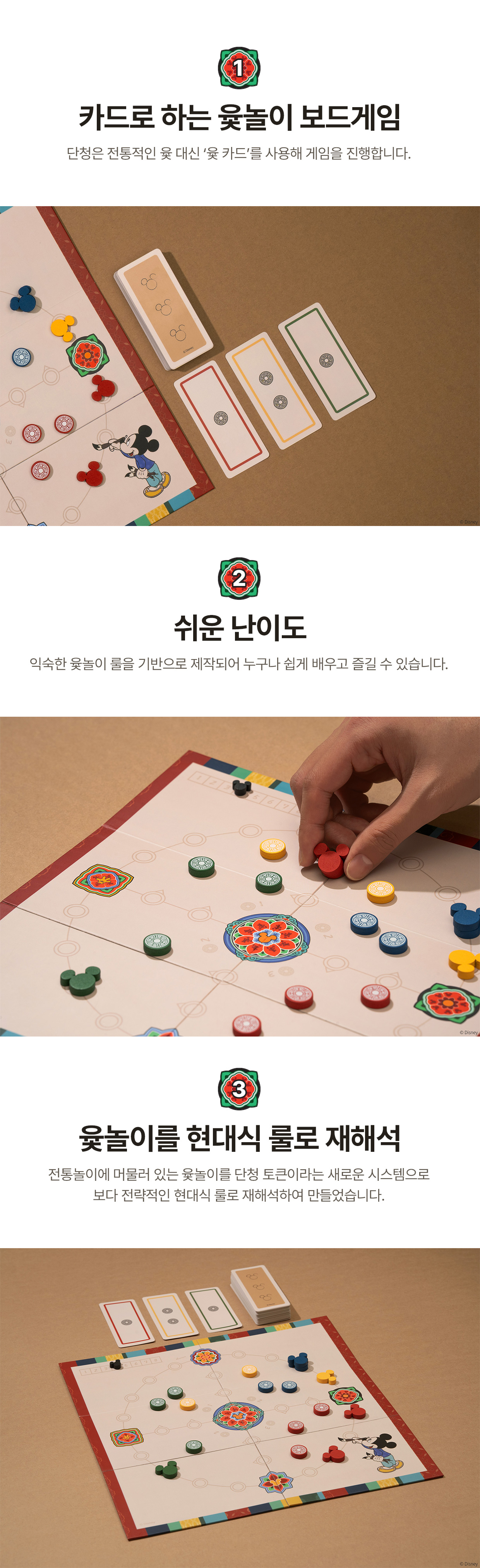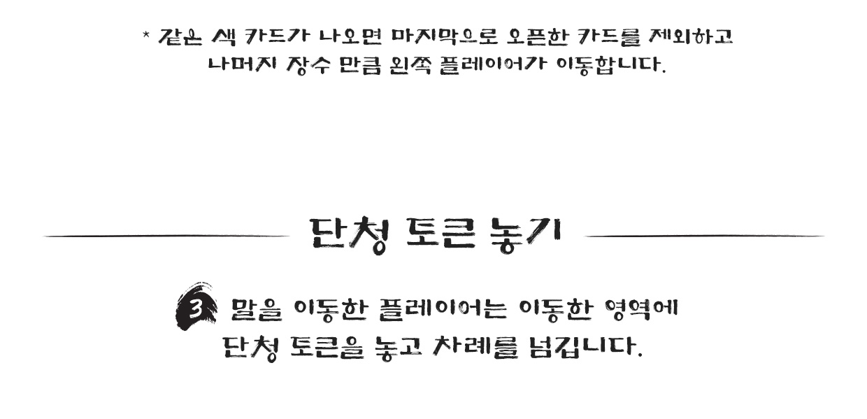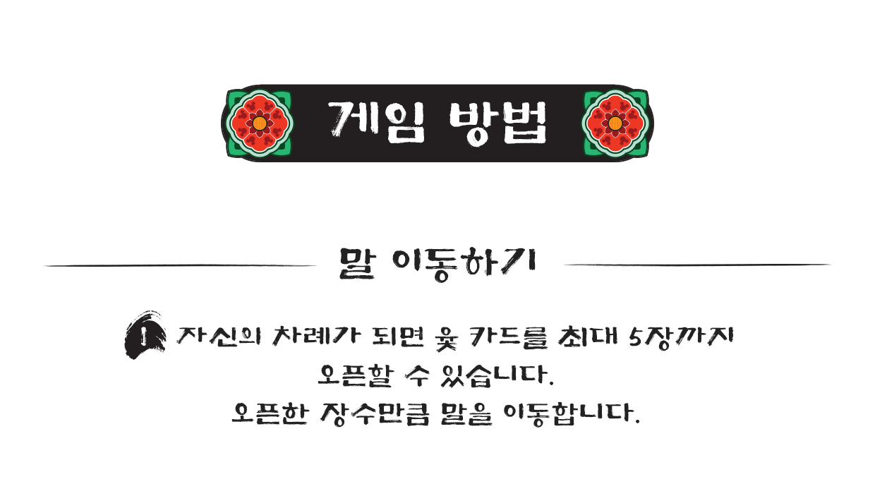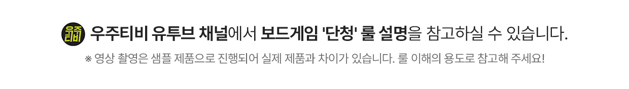 구성 : 윷판, 윷 카드 52장, 단청 토큰 80개, 말 8개, 라운드 표시 마커 1개, 룰북