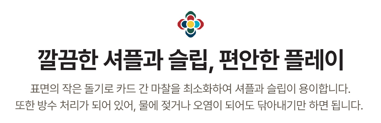 플레잉카드는 오염 방지를 위해 수축 랩포장되어 배송됩니다. 측면 부분 절취선을 이용하여 쉽게 개봉하실 수 있습니다. 박스 내 카드는 비닐로 보호 포장되어 있습니다.