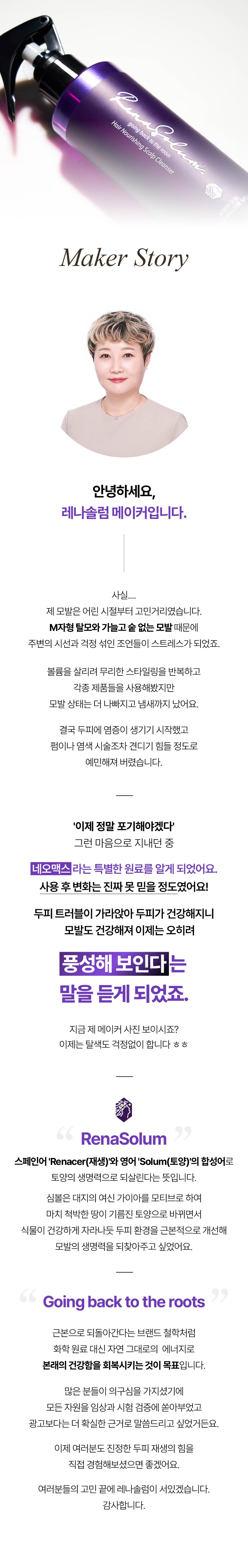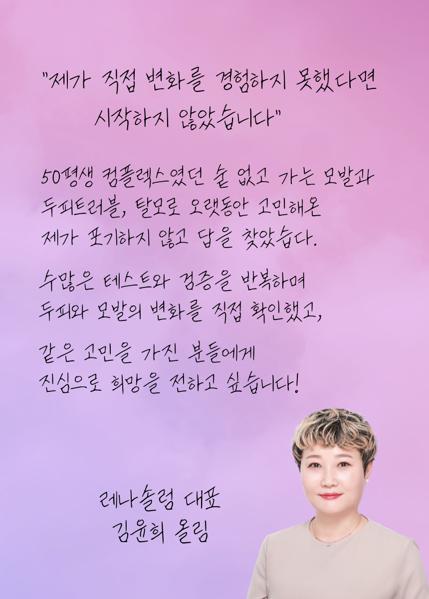 단순히 ‘샴푸’가 아닌,두피와 모발의 근본 원인을 해결하는 새로운 솔루션을 기다려온 분들께 레나솔럼이 제대로 된 대안을 제시할 수 있도록 여러분의 응원이 필요합니다.